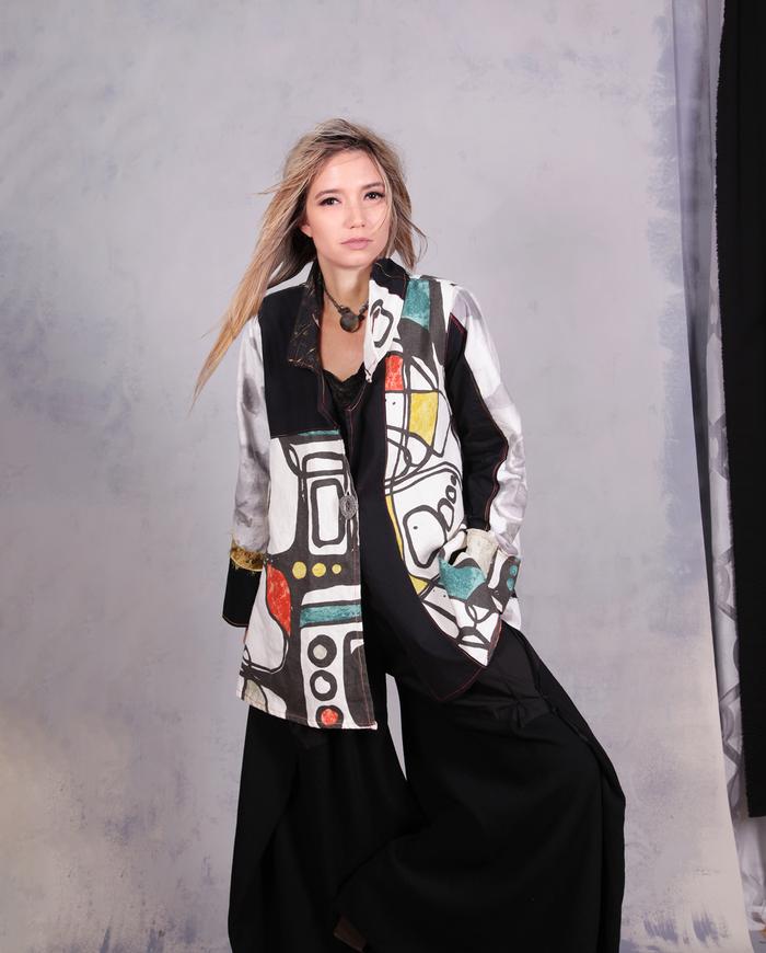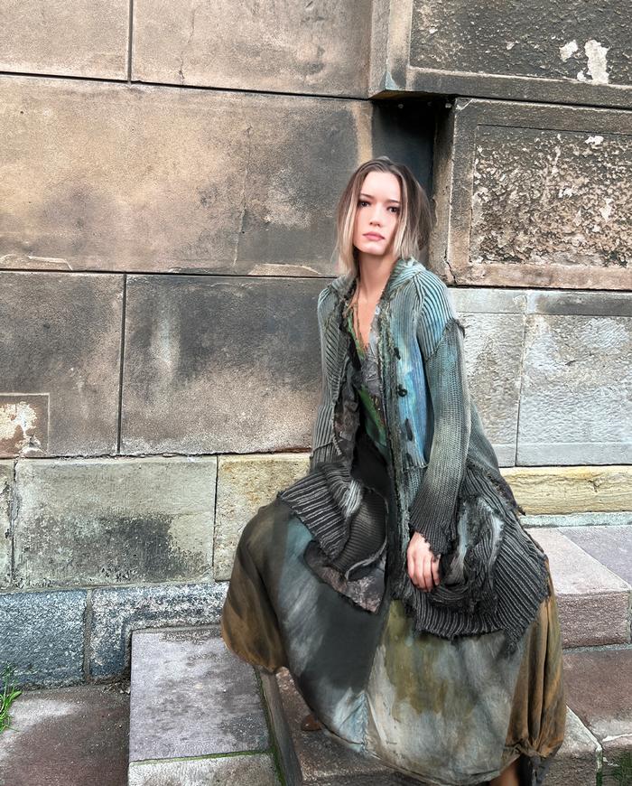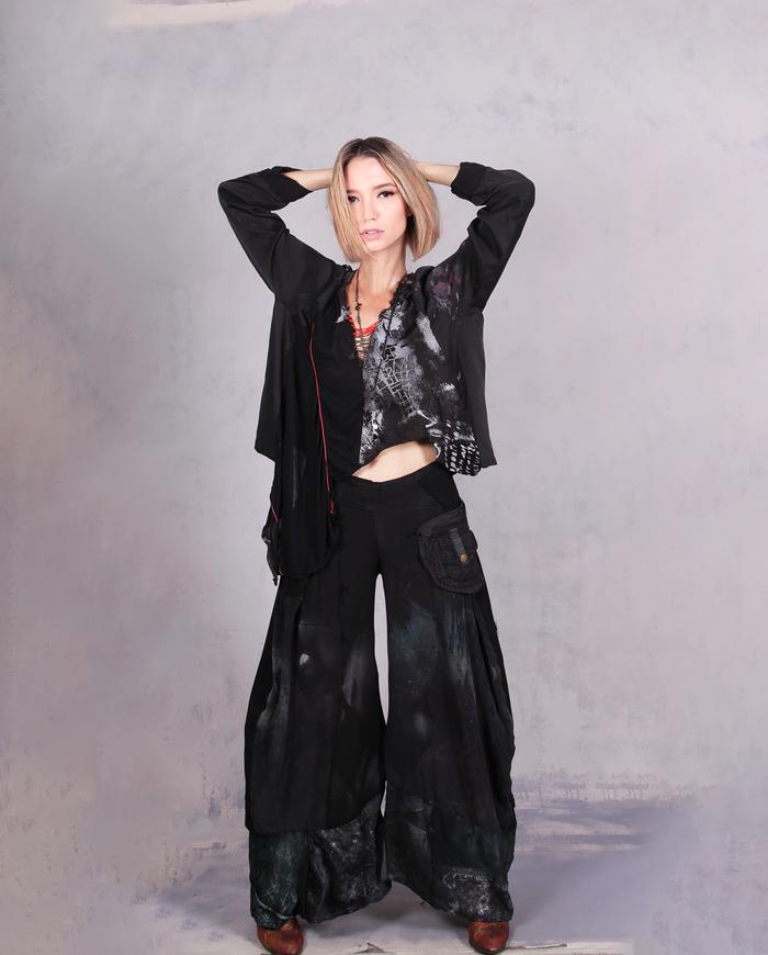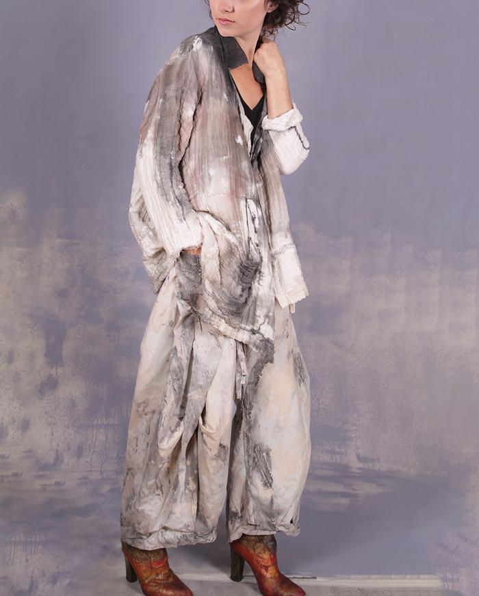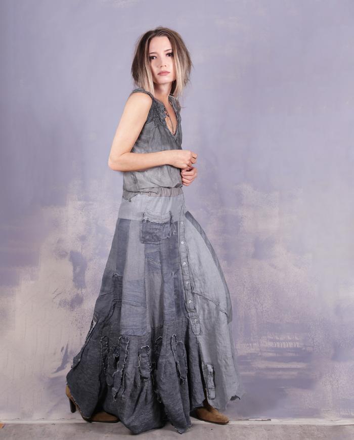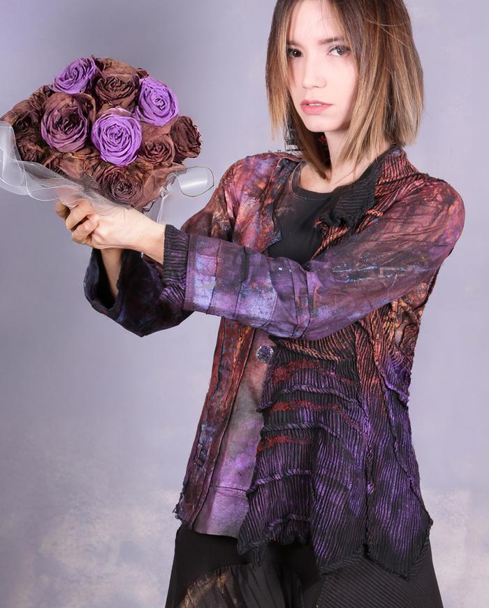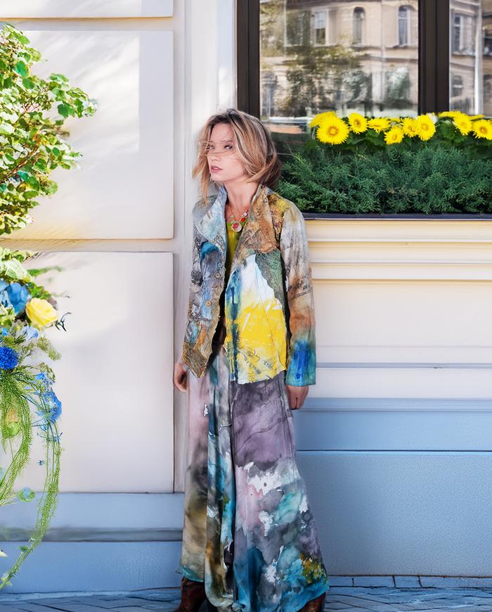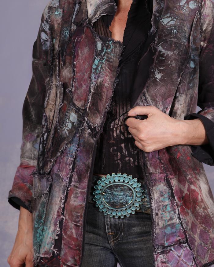 One-of-a-kind texture and fiber-art infused wearable art designer clothing, jewelry, and accessories ranging from avant-garde city style to Boho, lagenlook and evening couture, hand made entirely by the artist in the USA from all natural materials (silk, leather, cotton, linen), all featuring signature distressing and hand-painting.