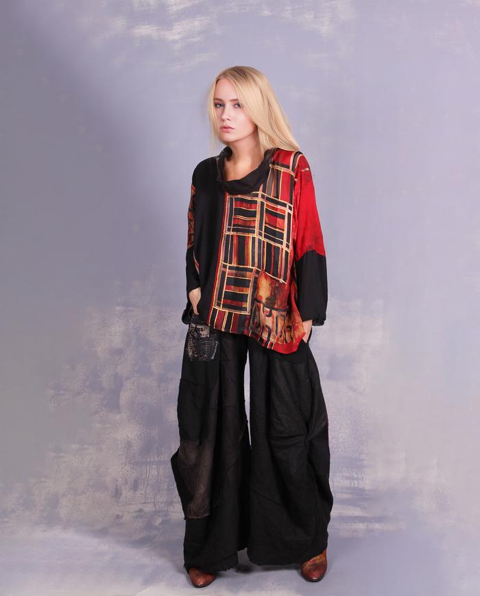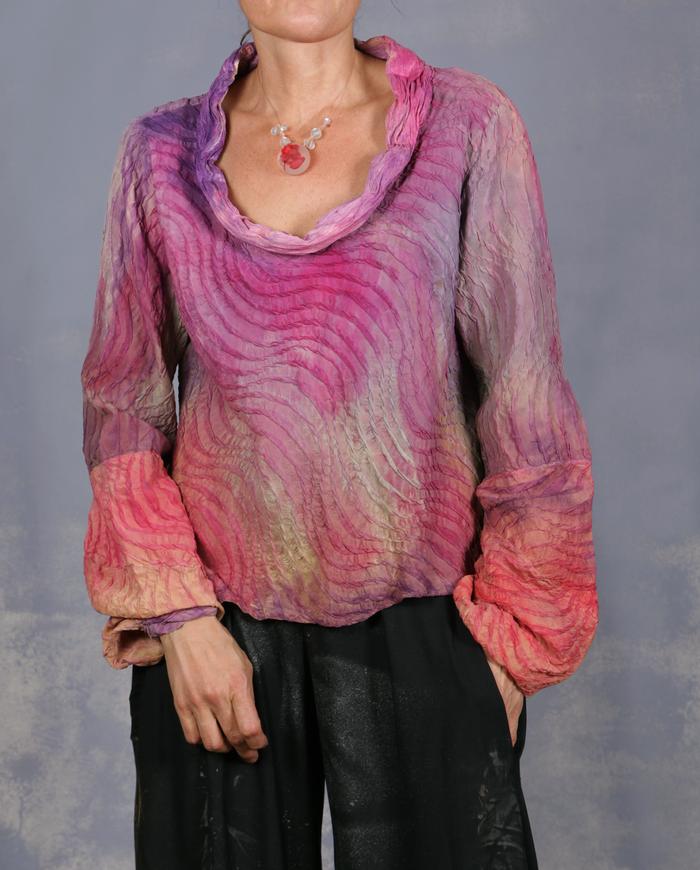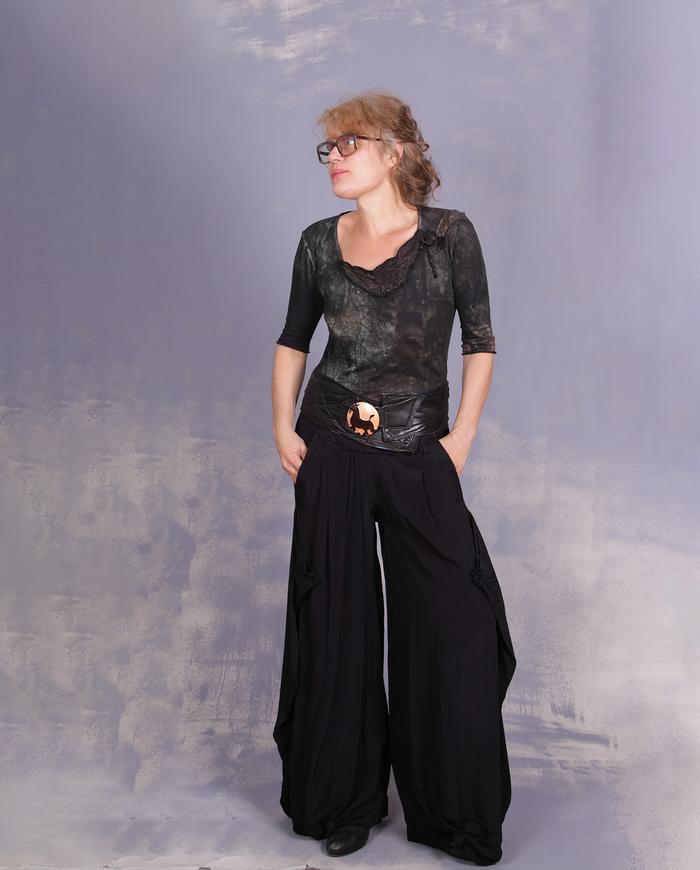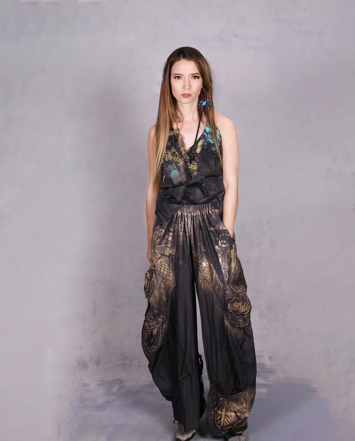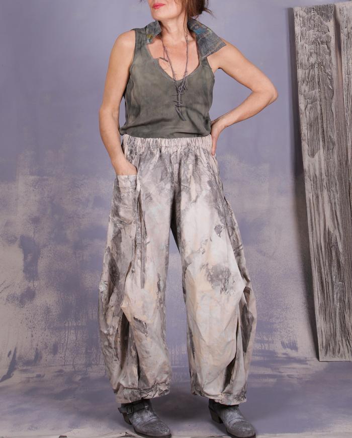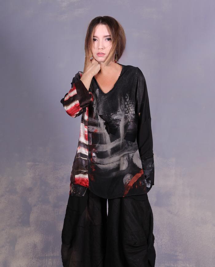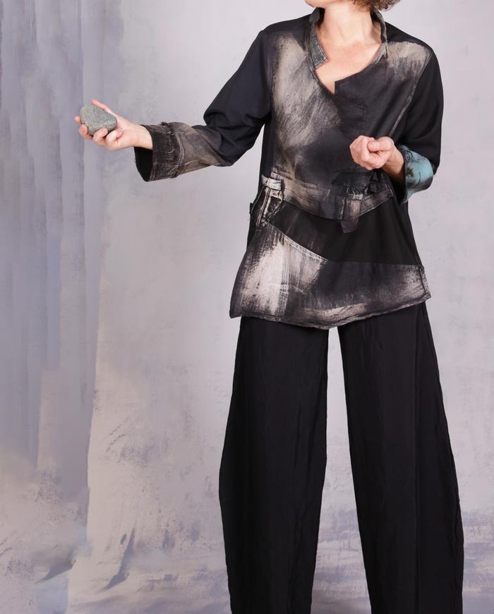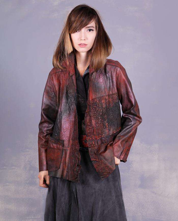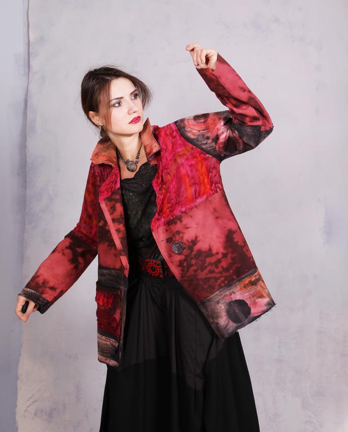 One-of-a-kind texture and fiber-art infused wearable art designer clothing, jewelry, and accessories ranging from avant-garde city style to Boho, lagenlook and evening couture, hand made entirely by the artist in the USA from all natural materials (silk, leather, cotton, linen), all featuring signature distressing and hand-painting.