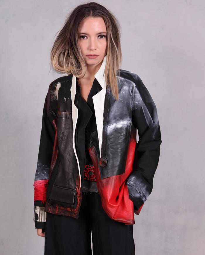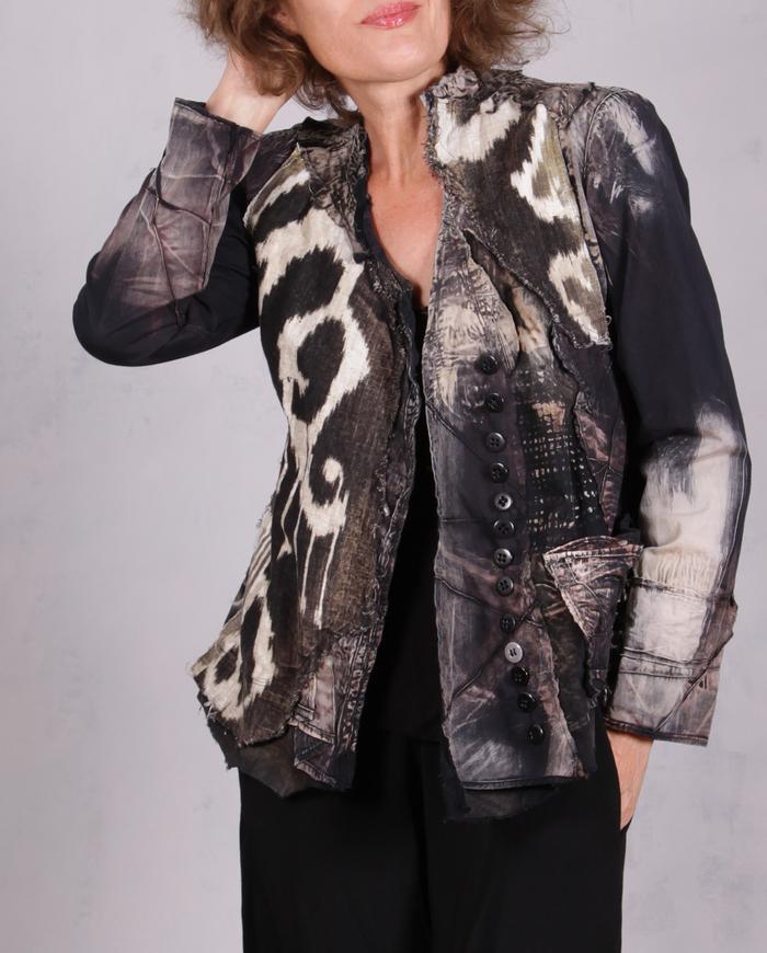 One-of-a-kind texture and fiber-art infused wearable art designer clothing, jewelry, and accessories ranging from avant-garde city style to Boho, lagenlook and evening couture, hand made entirely by the artist in the USA from all natural materials (silk, leather, cotton, linen), all featuring signature distressing and hand-painting.