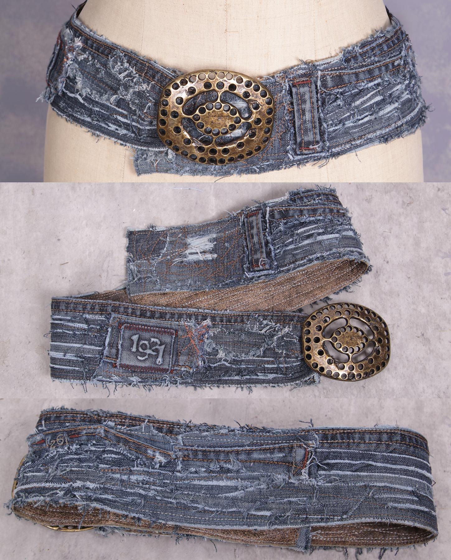 First, the buckle on this belt is just beautiful and so rare - it is a vintage piece made in Italy that you won't find anywhere else. Then, there is a fun accent on the belt - a raised '1921' area, very 3D, which is what gave the artist the idea for the belt to begin with. It is made out of recycled vintage jeans that had the logo. The raised logo here is actually a small pocket! The belt has vintage distressed leather backing and is stitched through with applique and raw edging. A wonderful modern artisanal piece that is as versatile as jeans themselves. Can be worn on the hips or on the waist and adjusted for length - please let us know the desired range you require. Product code: I6438