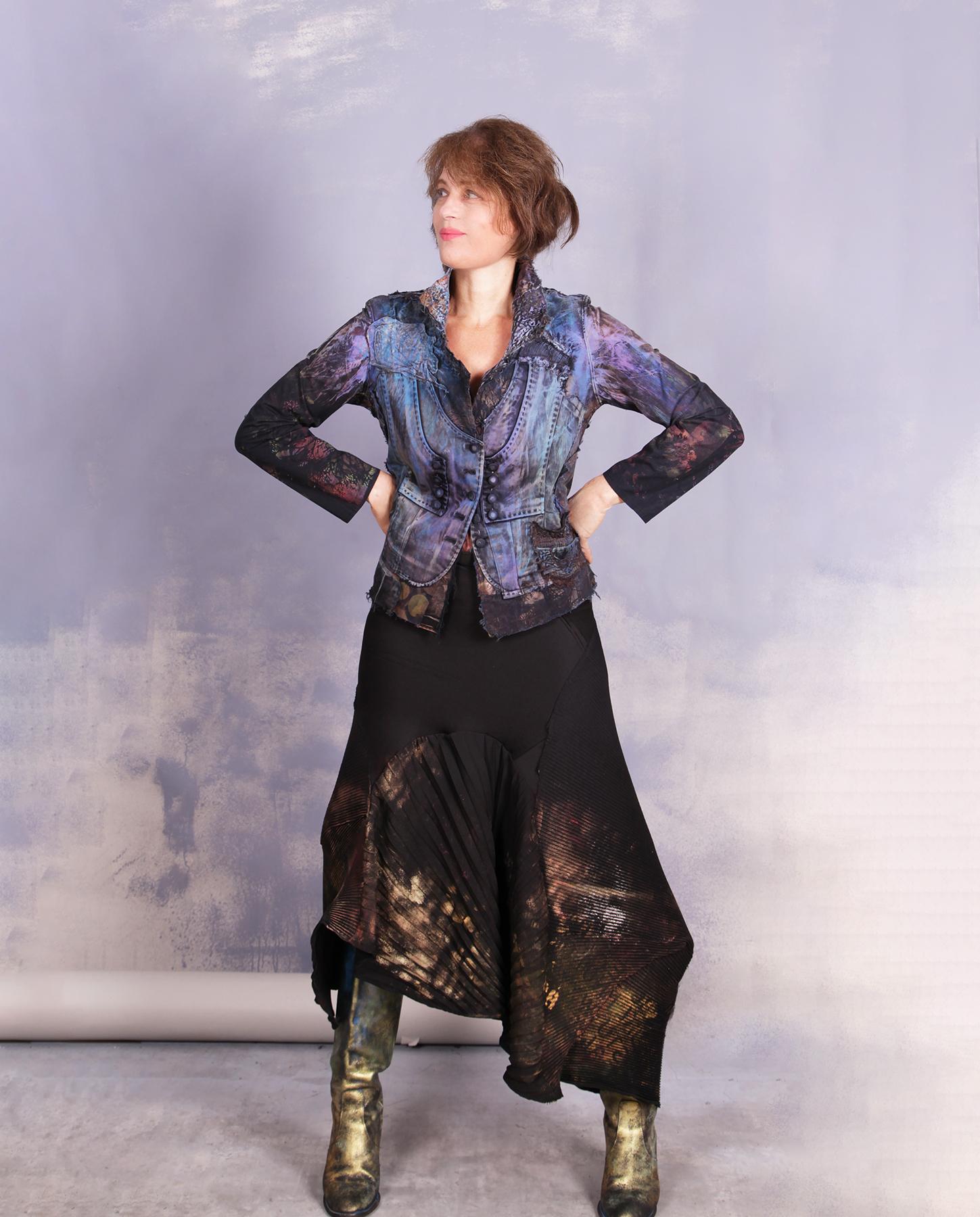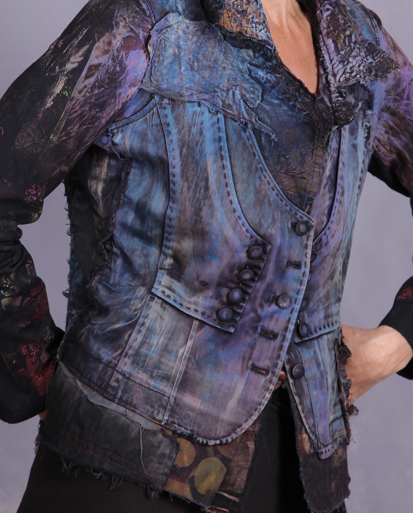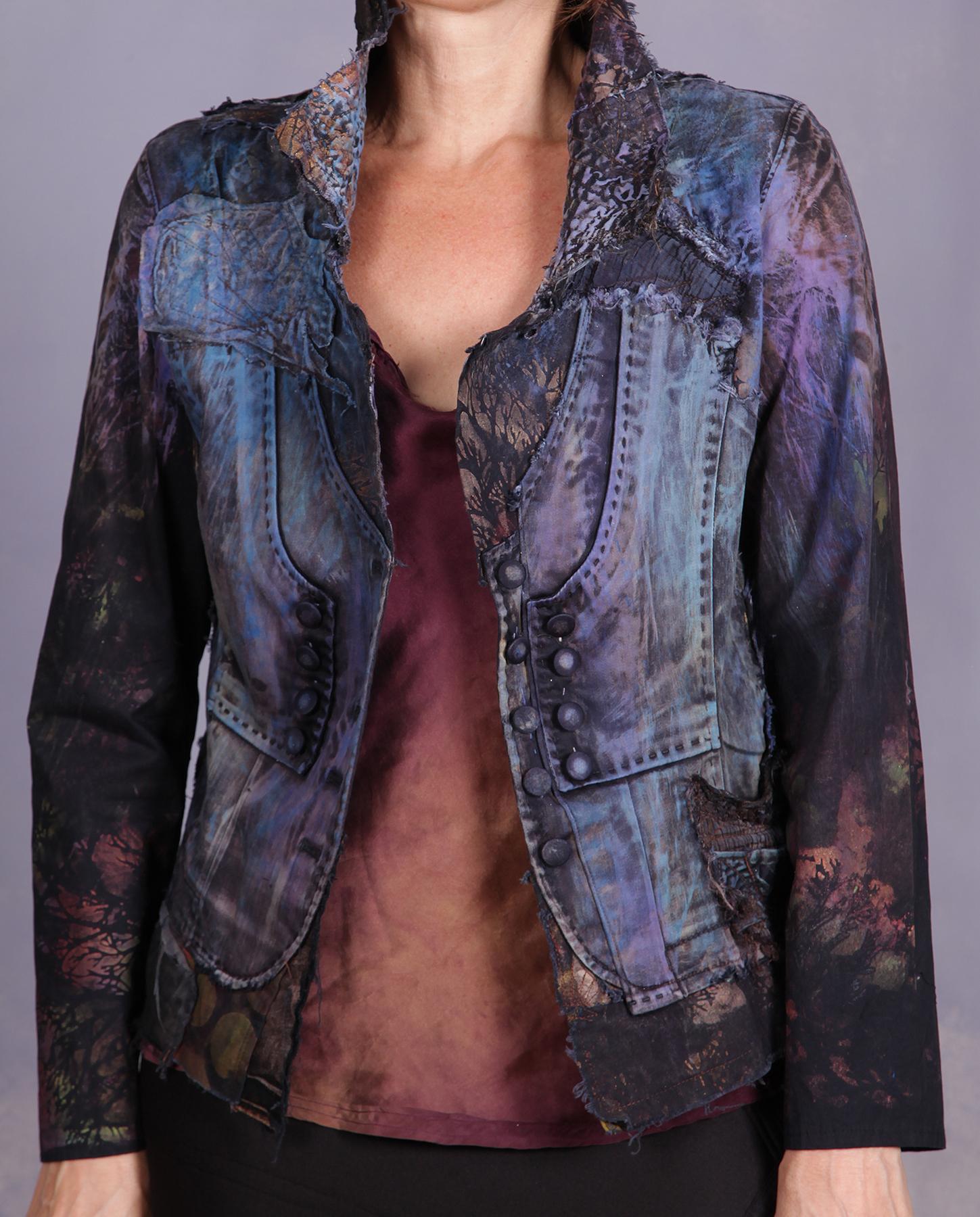 Another uniquely different piece from the artist - a fitted jacket that has a vest incorporated in it, so you really don't see right away if it is a vest over a blouse or a jacket. Made out of cotton with some stretch to it, assuring a perfect fit, it is lightweight, non-wrinkling and has intricate detailing throughout, with accents like a small textured pocket, stitched lines and fabric-covered buttons, to name just a few. It has been painted by hand in shades of purple and blue with rust and black added for a perfect color balance and visual harmony. The collar has been textured by hand with the artist's signature 'bumpy' look. Product code: E1479
