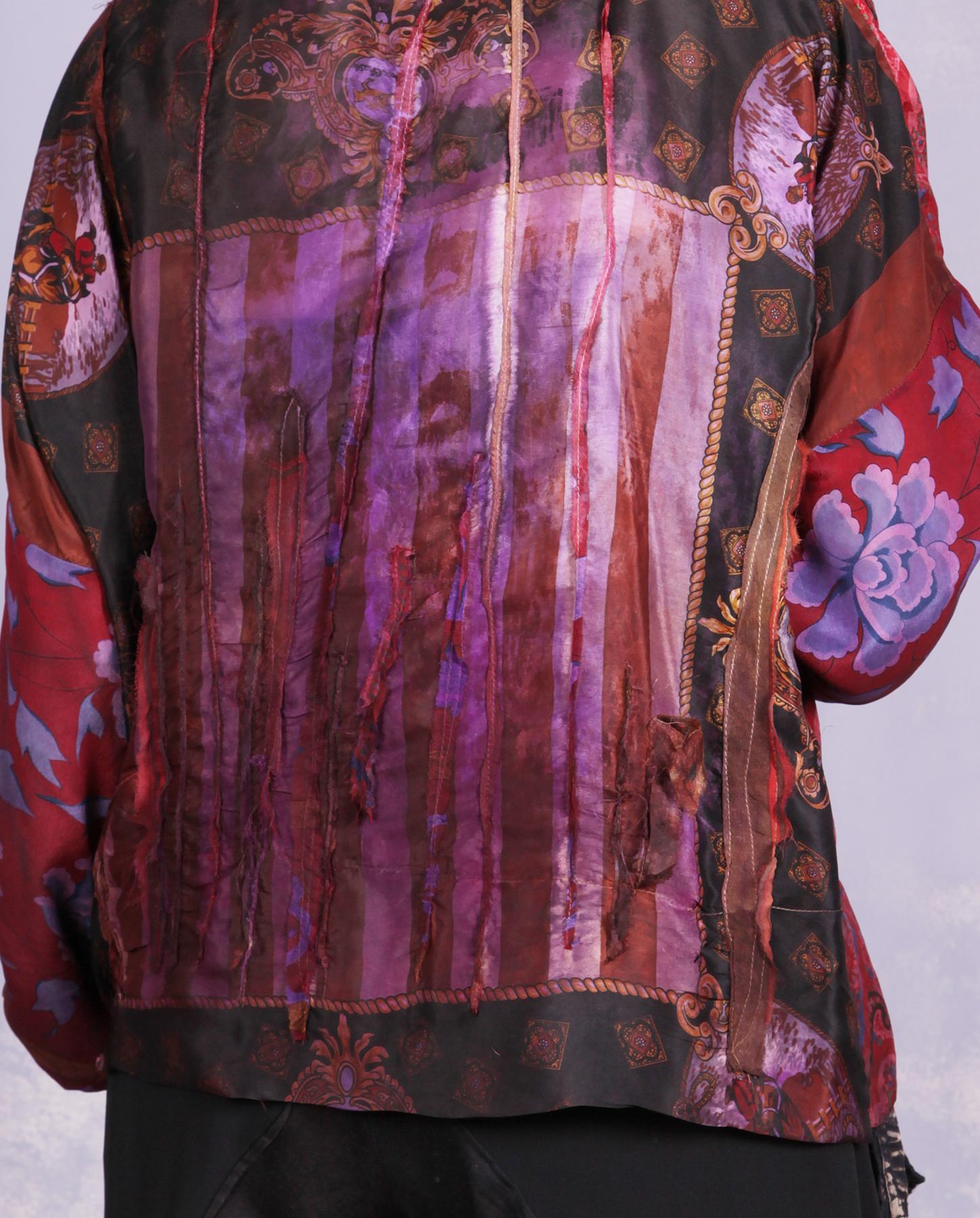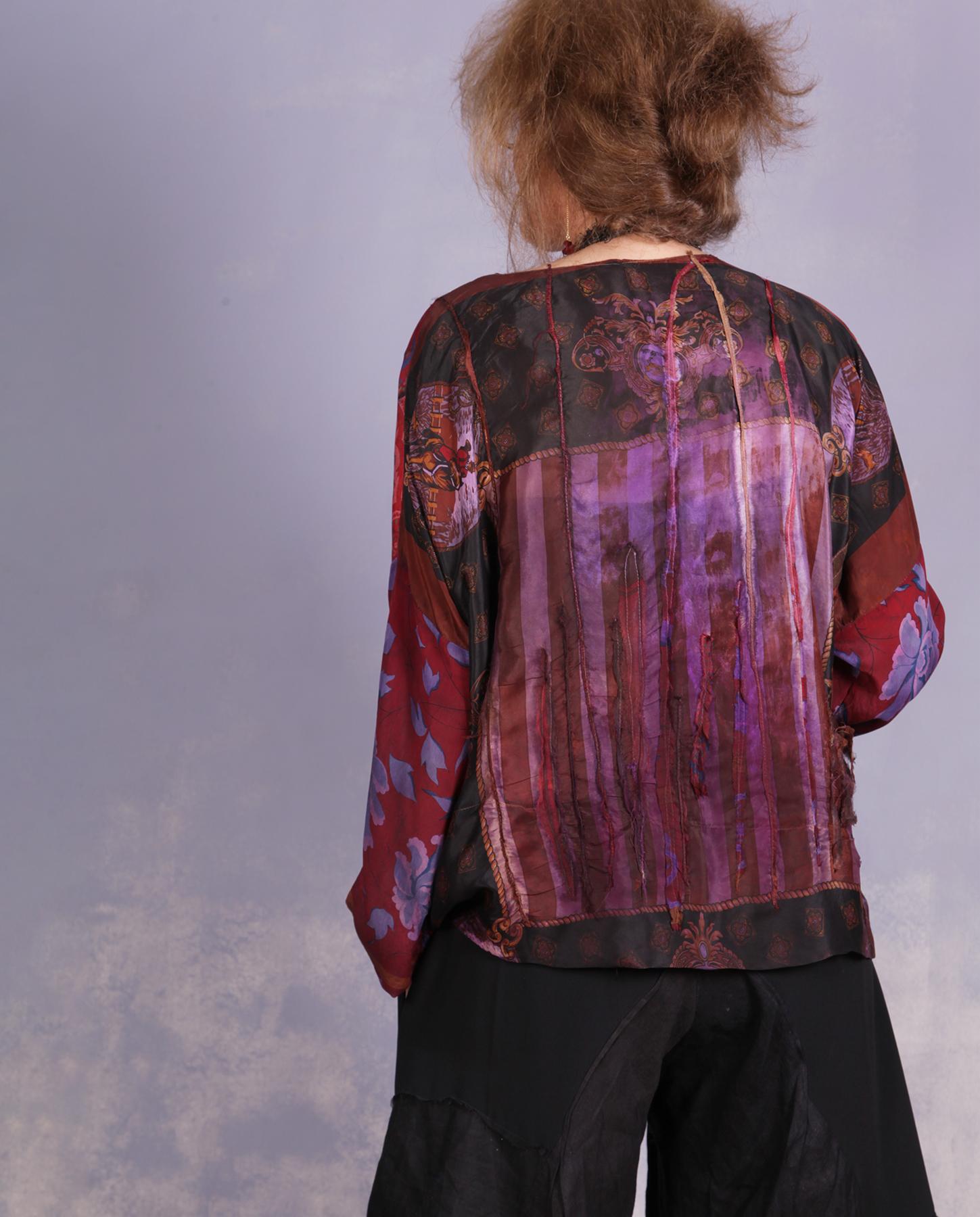 From the "Weightless Wonders" collection, featuring totally reworked antique and vintage scarves and graphic silk panels, this blouse combines three different designer vintage scarves in a mixture of traditional and unusual prints, with added silk appliqué in back. It is a unique mix of a traditional print in the front, semi-traditional floral print on the sleeves and a novelty print in back that you will love discovering for yourself. Made with a complex process of distressing and recoloring, it has deep colors of black and red for the main shades and is a great length for most outfits. Product code: Y6295