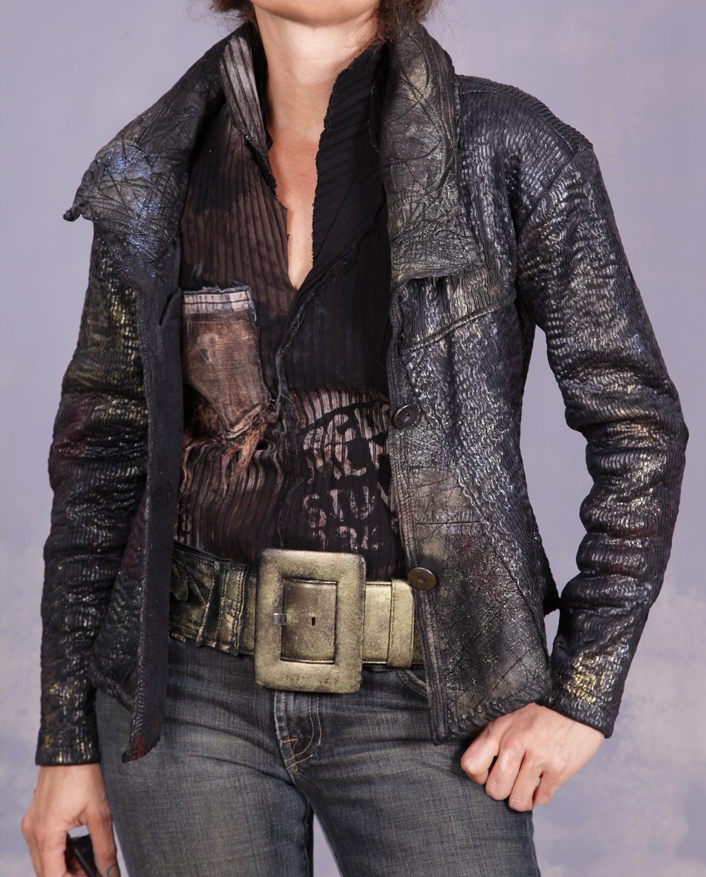 Made with the use of a large, unique vintage belt buckle from Germany, which is metal covered in lambskin, this art belt is a pure beauty to all senses: super soft, velvety on the underside, soft and textured on the face side, made out mixed lambskin leathers with different textures, some original, some added by hand, and beautiful in color, which is distressed iridescent green/gold/black. It combines a flexible portion with rigid part for closure. Truly beautiful in person, it can be worn with a wide variety of colors and outfits, and definitely with black. PLEASE NOTE: all belts are made with a lot of extra in case it is needed and unless requested, will be set to an average medium size for use, so please refer to the measurements and let us know if any adjustments are needed. Product code: U3692