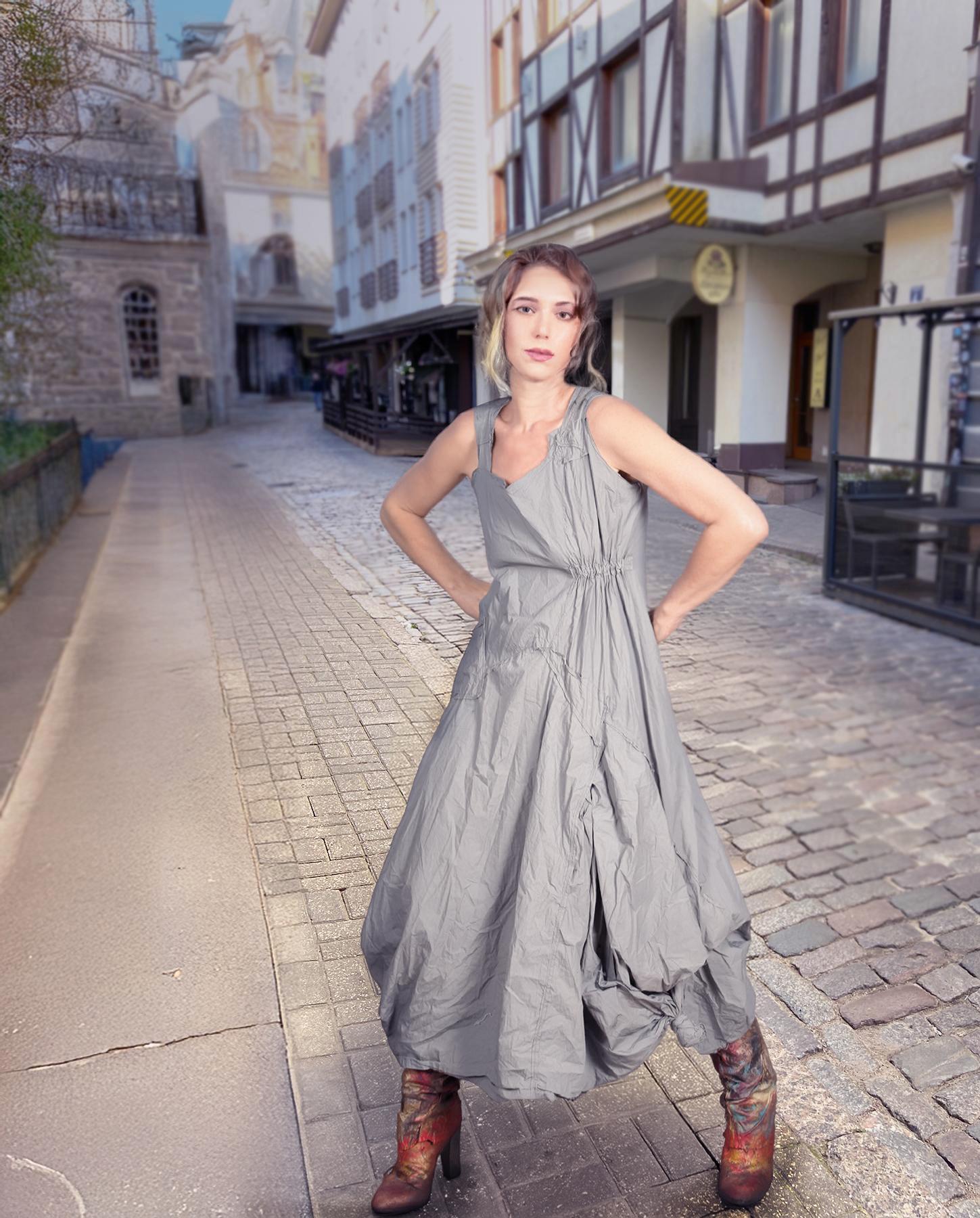 Featuring a great color that the artist calls 'modern khaki' because of the similar look and combination capabilities, in a pleasant cool neutral shade that is in between gray and green, this dress is breathable and crisp. Wear it in the summer as a sun dress or in colder months under jackets and with boots for a great modern boho look. Top quality Italian cotton is perfect for the look and feel of this creation. Product code: K6620