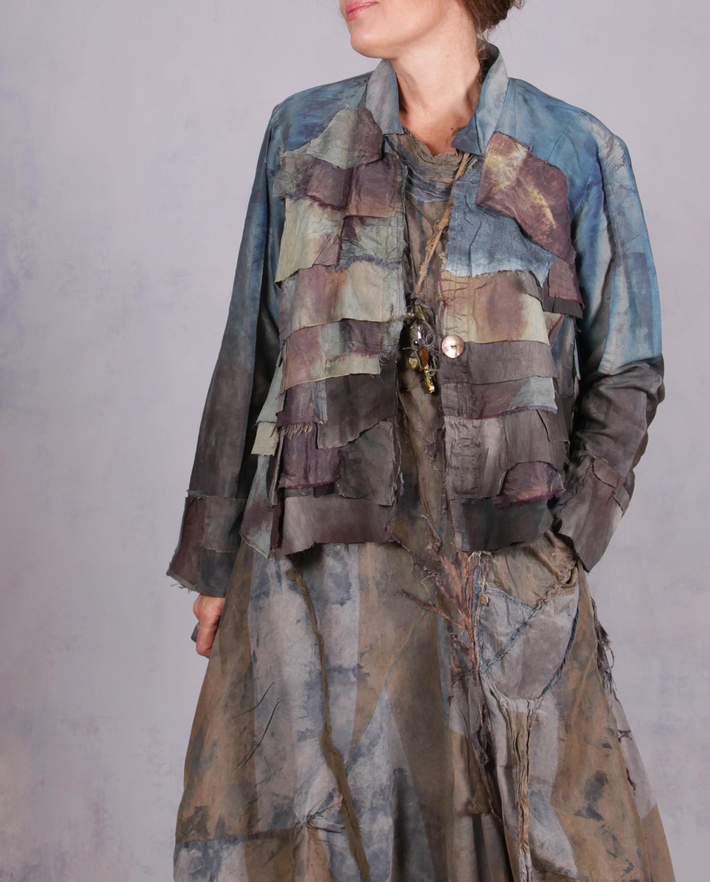 Built-in sleeves, slightly asymmetrical design, applique, hand-painted, distressed, raw edging.