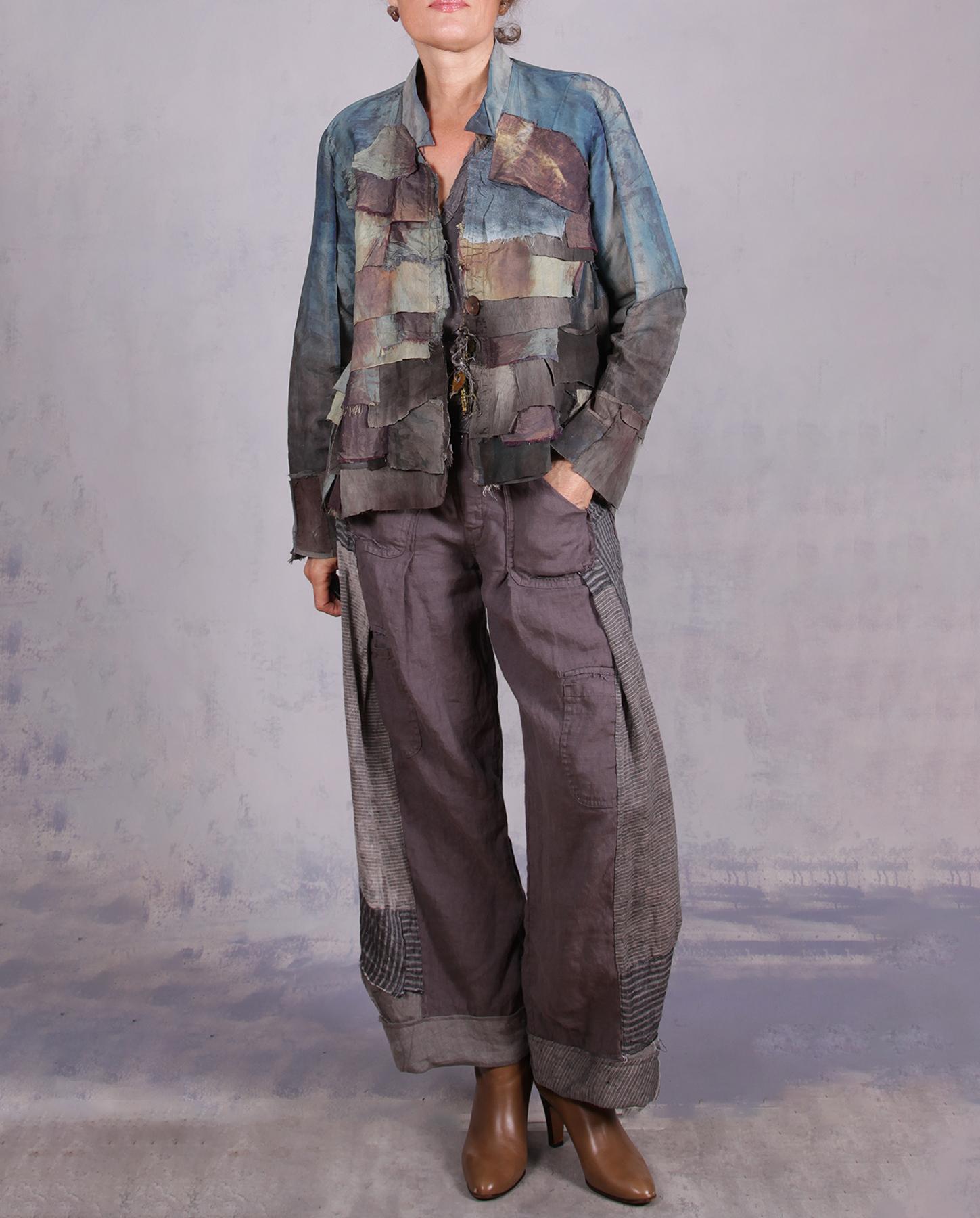 The dreamy colors of this artful jacket from the Mille-feuille collection are deep and mysterious, the half-tones adding to each other harmoniously over the half-indigo, half-teal base. The jacket is lightweight, made out of silk for the base and mostly silk for the applique of 'leaves'. Each piece of the applique has been individually hand-painted and assembled as a whole over the jacket with meticulous care of overlap and proximity of different colors and textures. You will discover lots of subtle details, like little triangle tips of the collar, for instance. The colors are a great match to a variety of tops and bottoms, with just a few options shown, many pieces on the website with work, if you are not sure, we are always happy to advise. Currently there is no closure made, it can be put in upon request at no extra charge. A charming, chic piece you will enjoy wearing. Product code: R9721