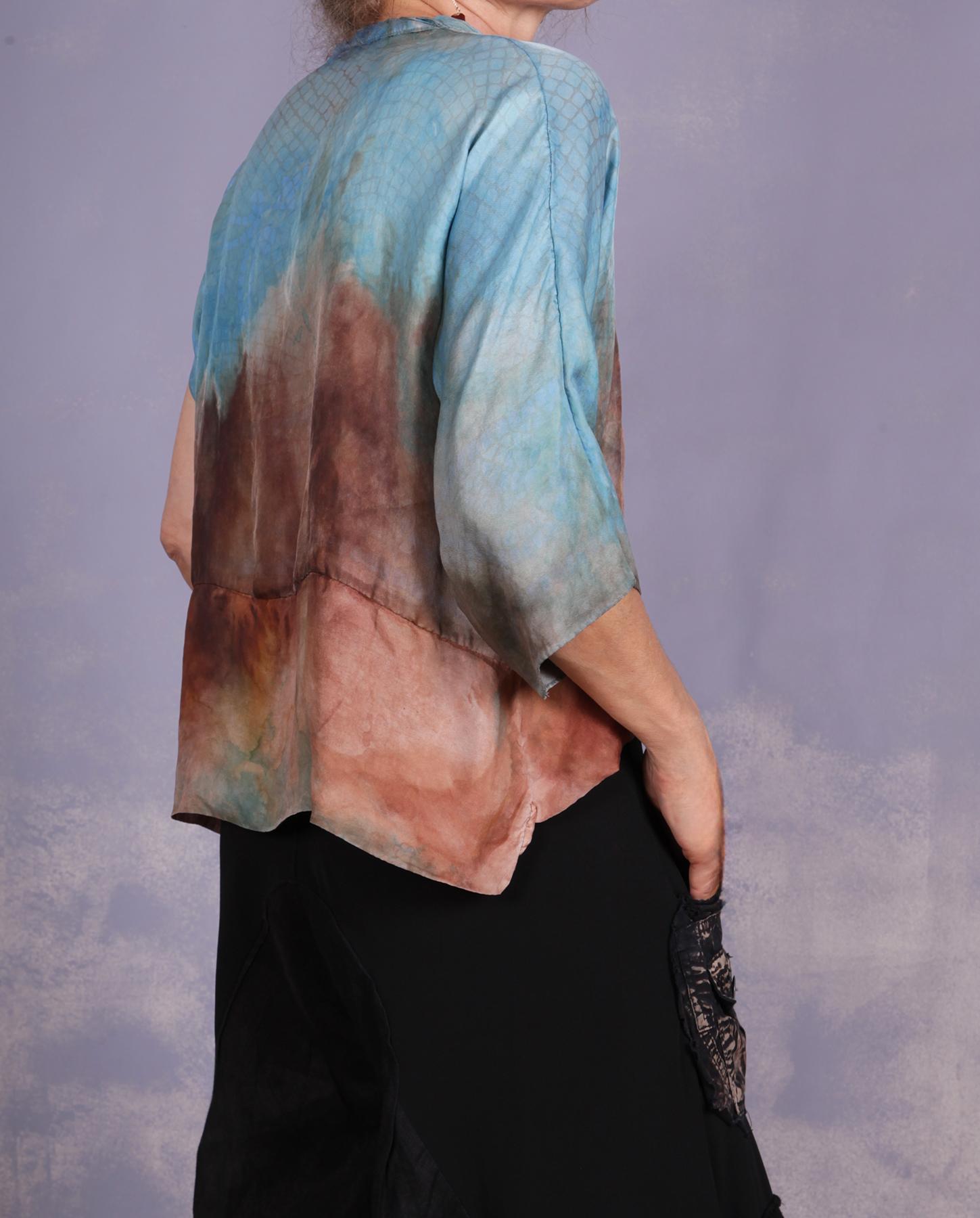 From the "Weightless Wonders" collection, featuring totally reworked antique and vintage scarves and graphic silk panels, this modern blouse features a scarf made in Italy for the Museum of Modern Art collection that has a mosaic pattern. Combined with other lightweight silks, it has an asymmetrical construction - one raglan sleeve, one cap sleeve - and has been painted in complimentary shades of rust/terracotta and blue/aqua. Comfortable, breathable and easy-care, perfect to take with you on trips as well! Product code: Z9041