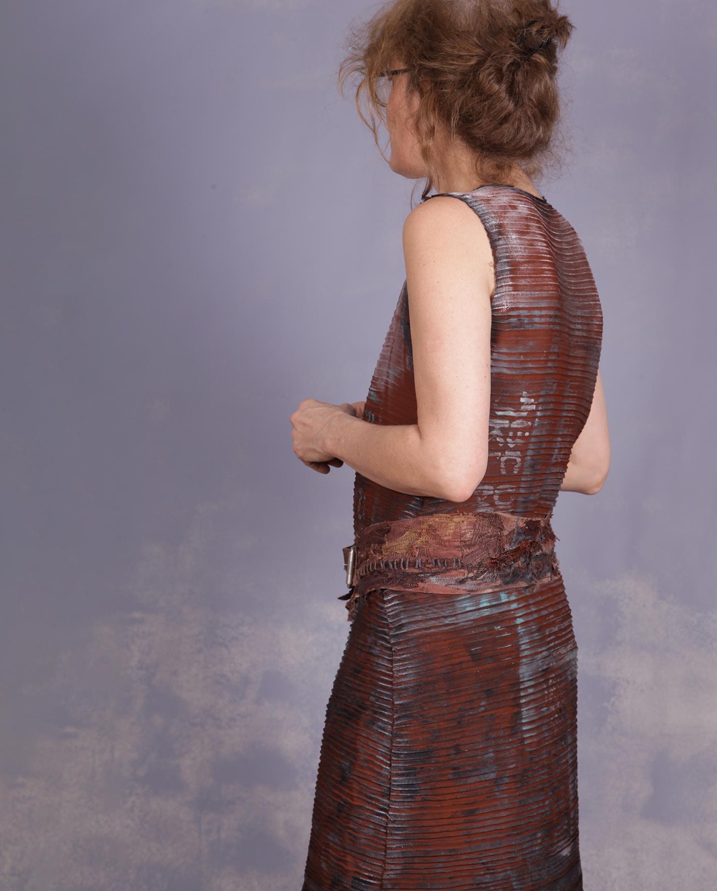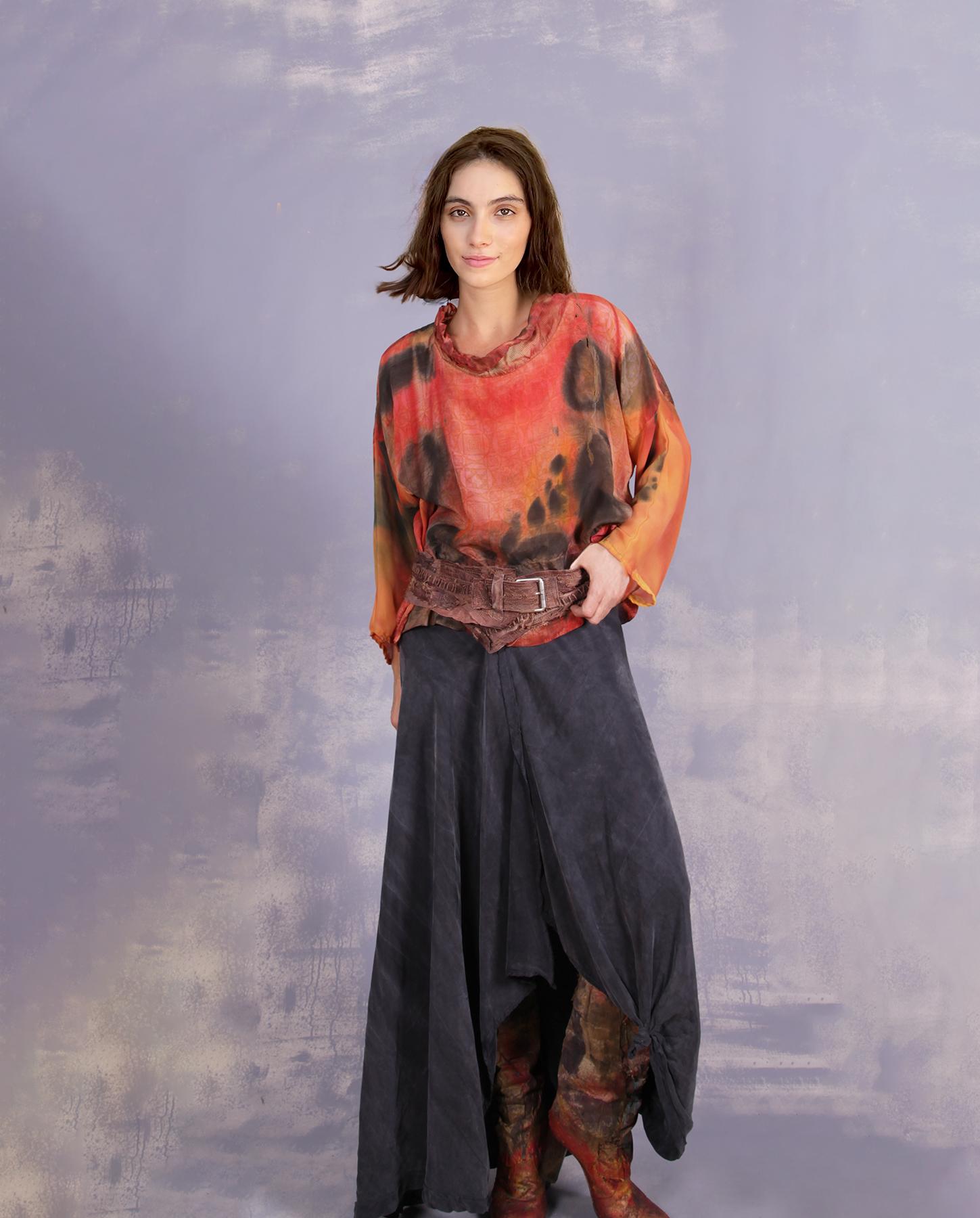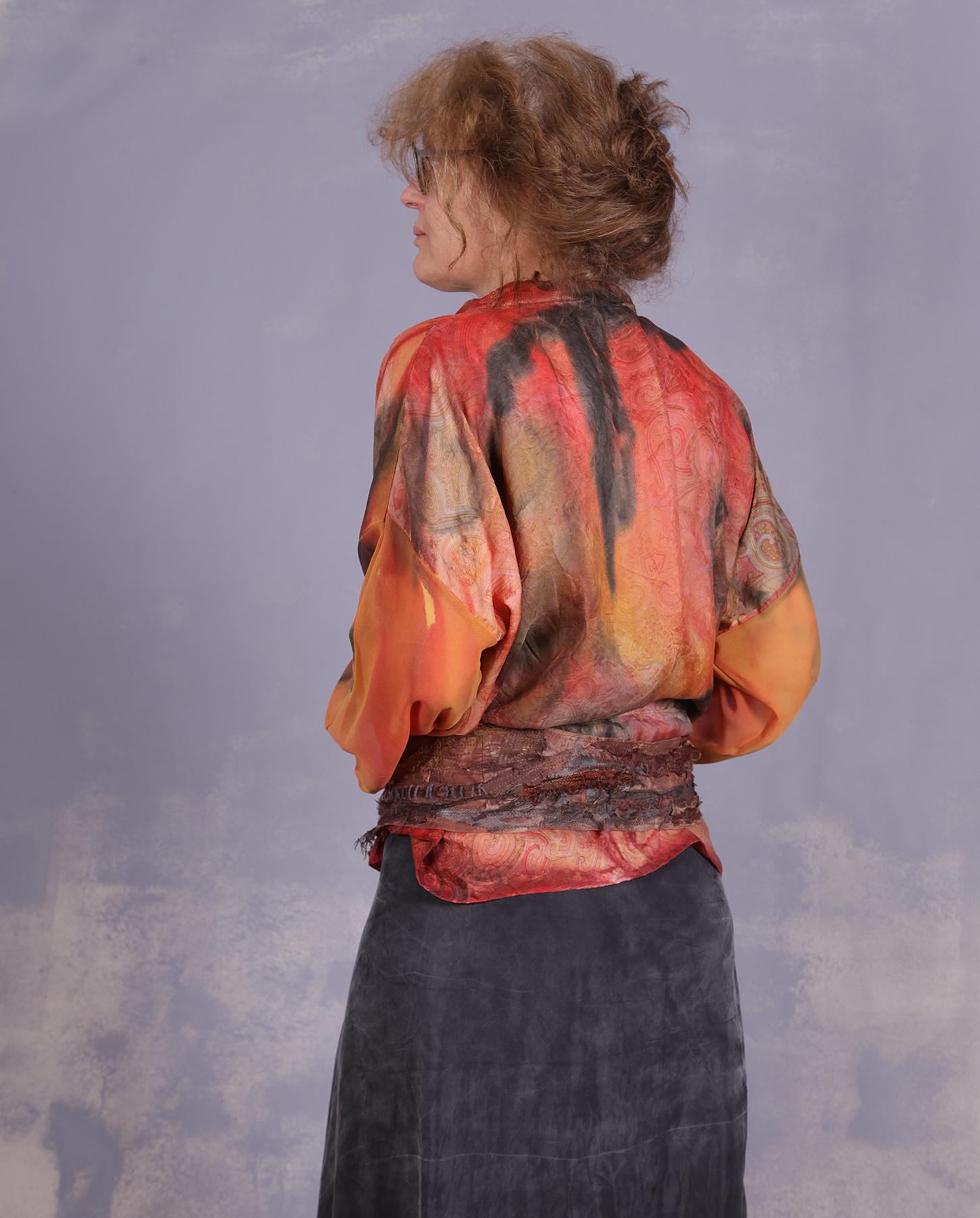 Made with the use of all the artist's signature techniques, this distressed, detailed belt is a perfect addition to many outfits, with its neutral brownish shades. Features lots of applique in silk and other natural fibers over leather and hand stitching. Adjustable, it will fit a variety of sizes and can be worn on the hips or on the waist. As with all belts, it can be modified to fit your needs for length or width, just let us know. Product code: E8375