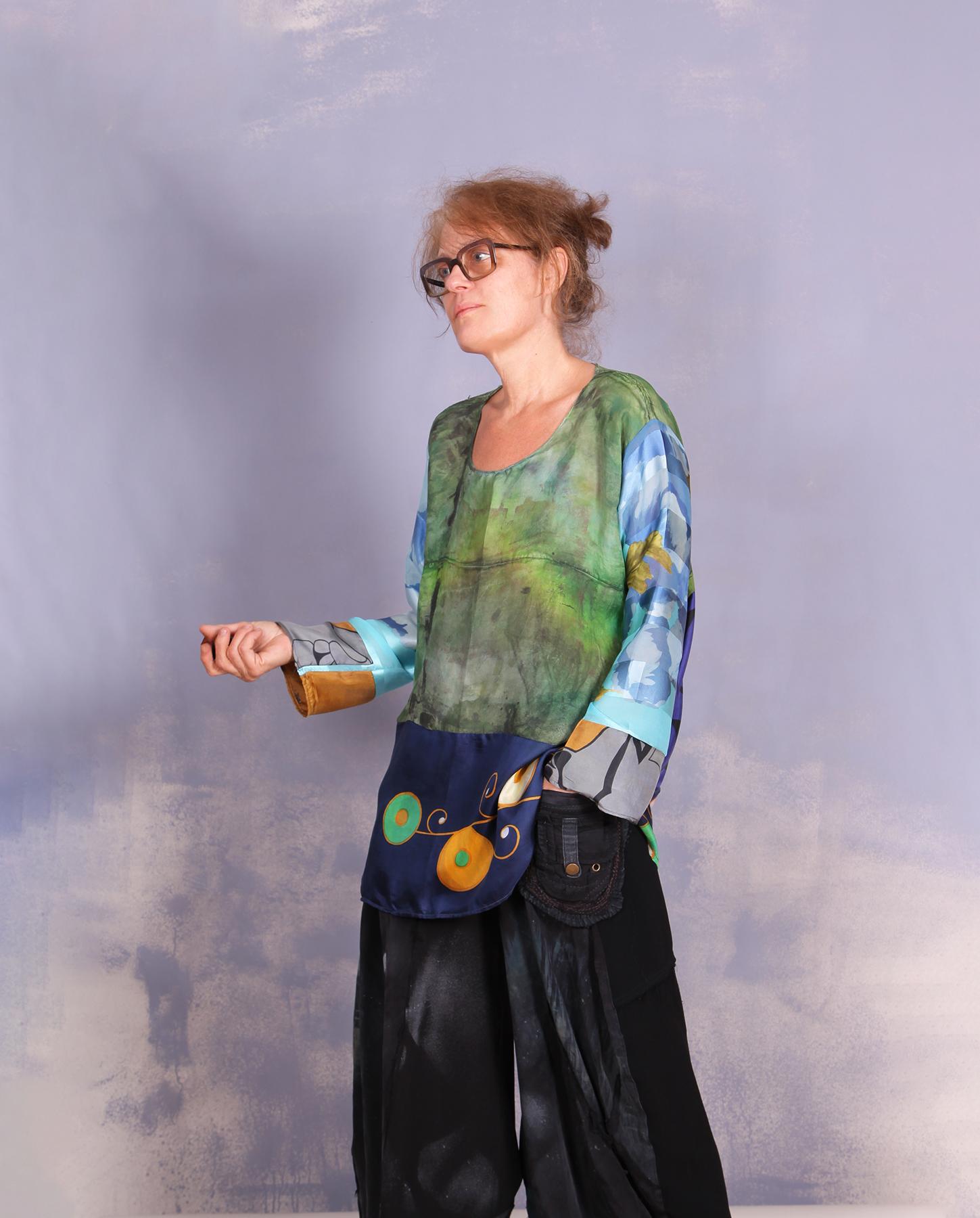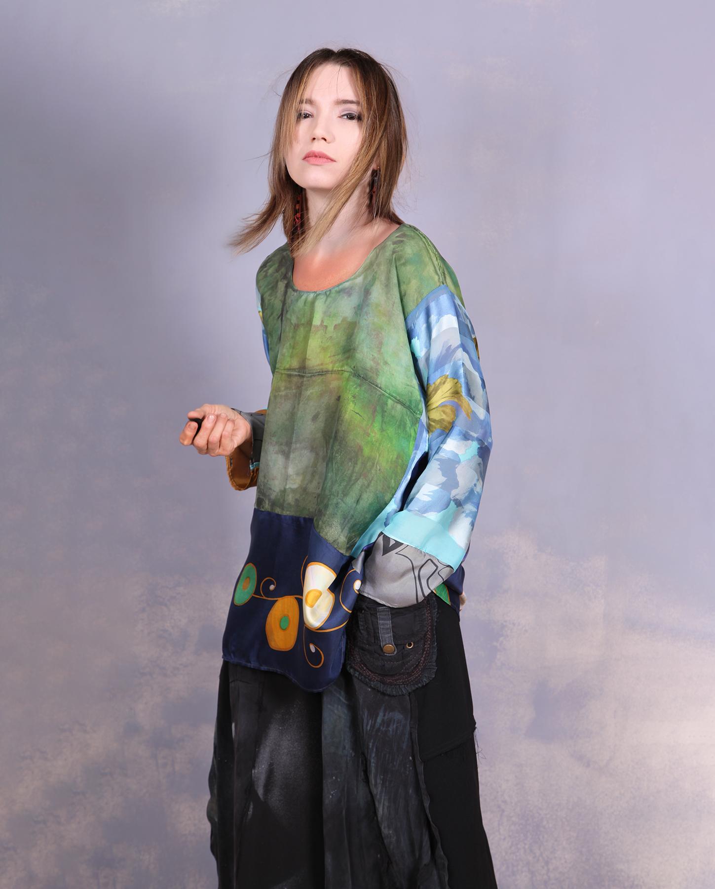 With the body painted in the impressionistic style, bottom trim more of an art deco feel, and watercolor abstract floral sleeves, it really is like the different painting styles are having a conversation, and a very harmonious at that. This unique, irreproducible art piece combines hand-painted silk with antique silk panels, all different types, and all lightweight, for that airy, pleasant feel. A straight-down design makes it a flattering silhouette. A beautiful piece to take on a cruise, it will billow in the wind and is weightless, so won't add to your luggage, plus easy care (washable). Product code: Y7656