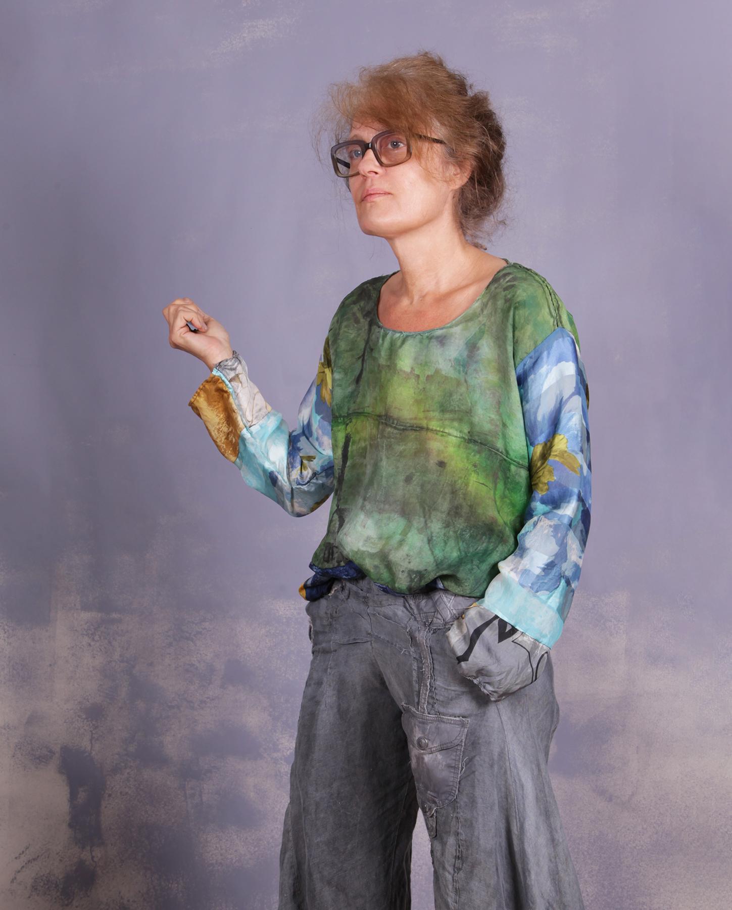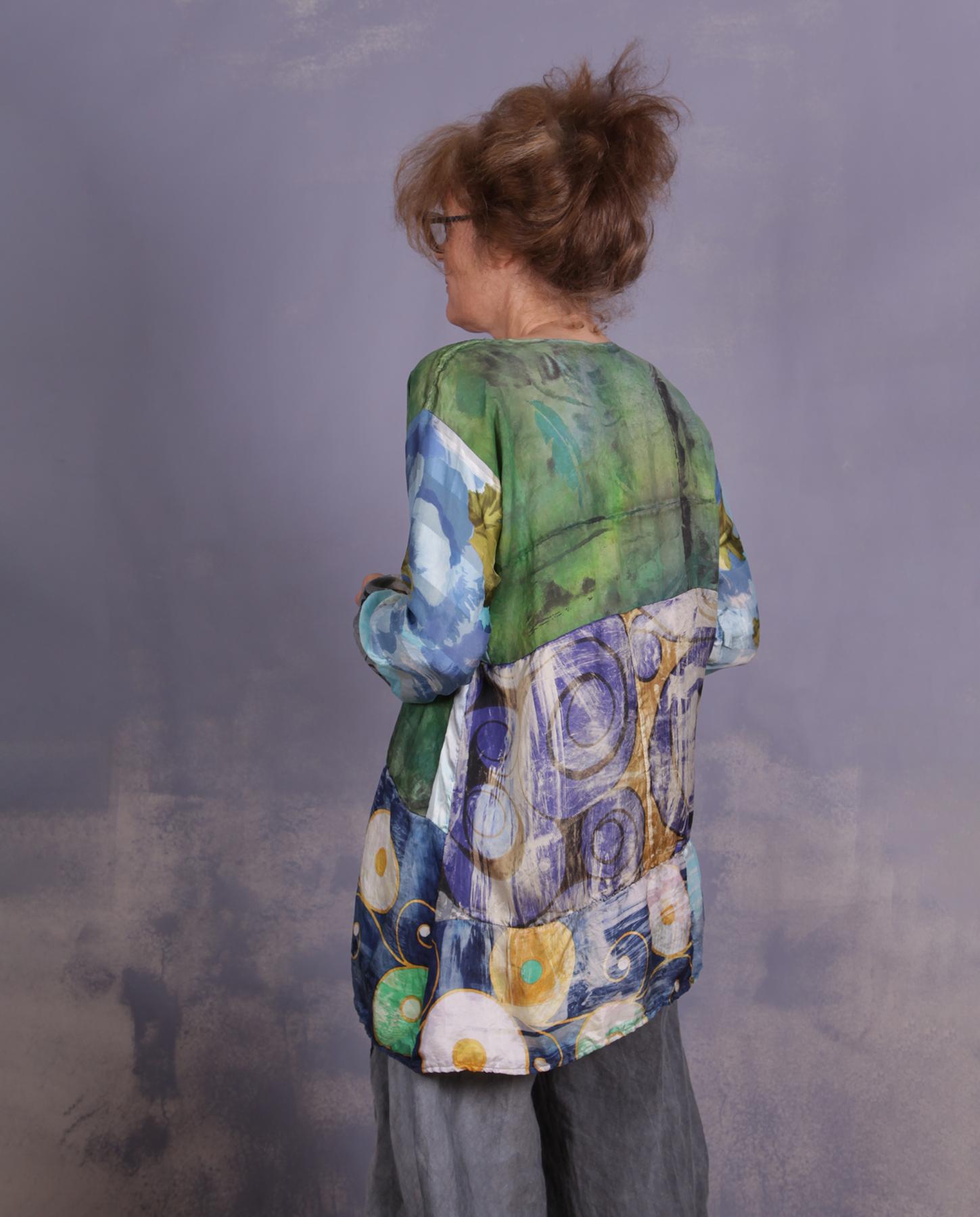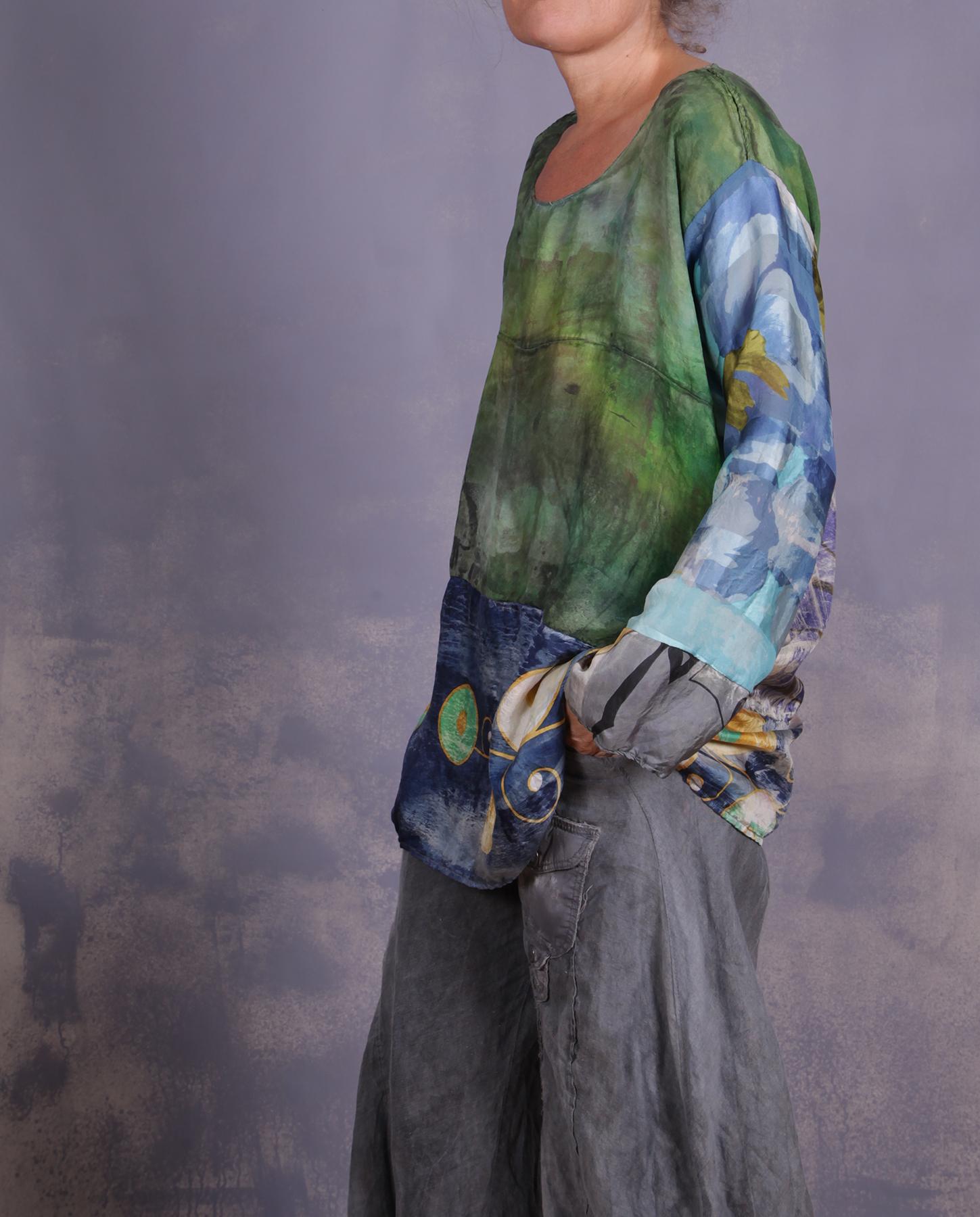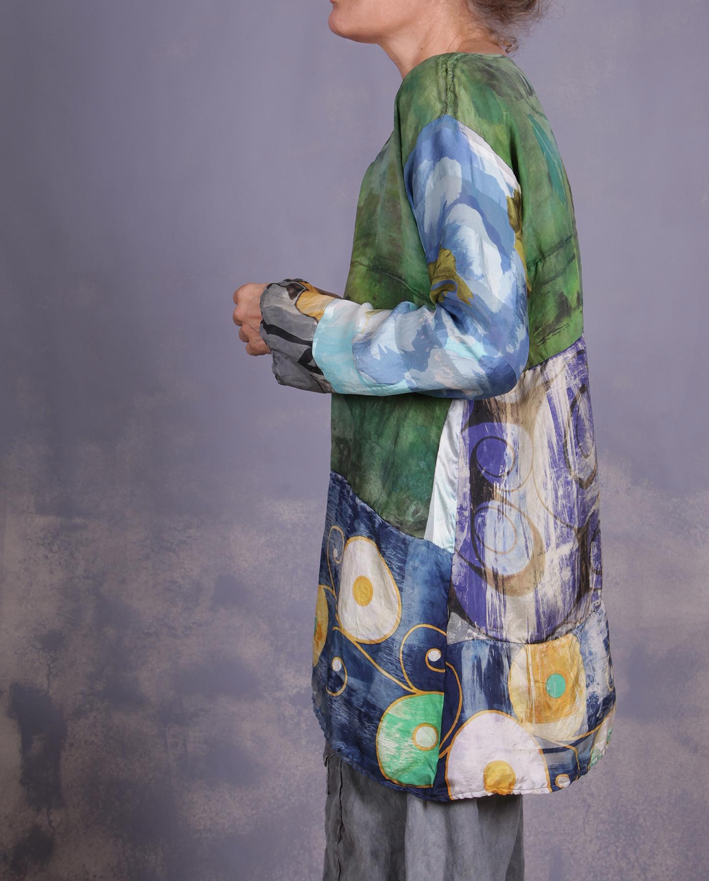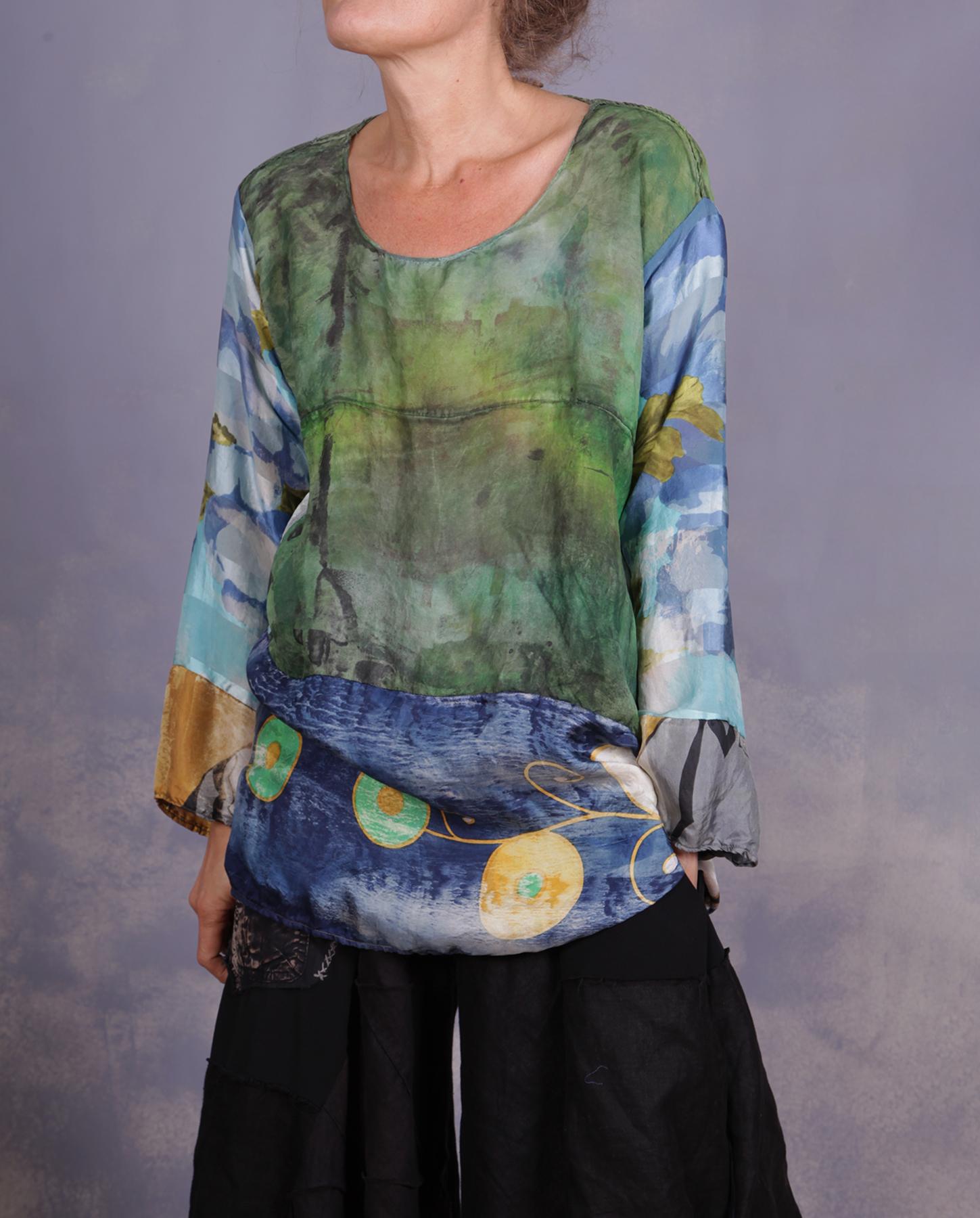 From the "Weightless Wonders" collection, featuring totally reworked antique and vintage scarves and graphic silk panels, this blouse has a body painted in the impressionistic style, bottom trim more of an art deco feel, and watercolor abstract floral sleeves. It really is like the different painting styles are having a conversation, and a very harmonious one at that. This unique, irreproducible art piece combines hand-painted silk with antique silk panels, all different types, and all lightweight, for that airy, pleasant feel. A straight-down design makes it a flattering silhouette. A beautiful piece to take on a cruise, it will billow in the wind and is weightless, so won't add to your luggage, plus easy care (washable). As all the light silk pieces, it can be easily tucked in for a different look, or tied on the side. Product code: Y7656