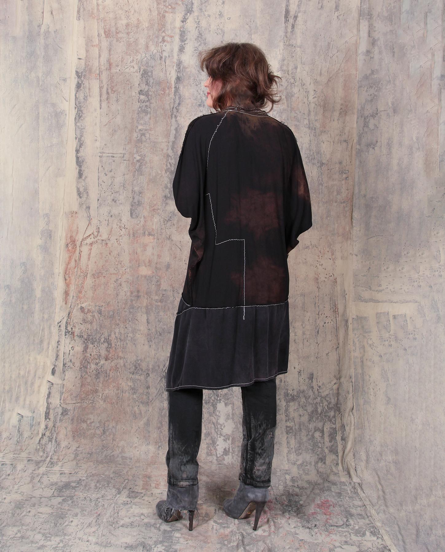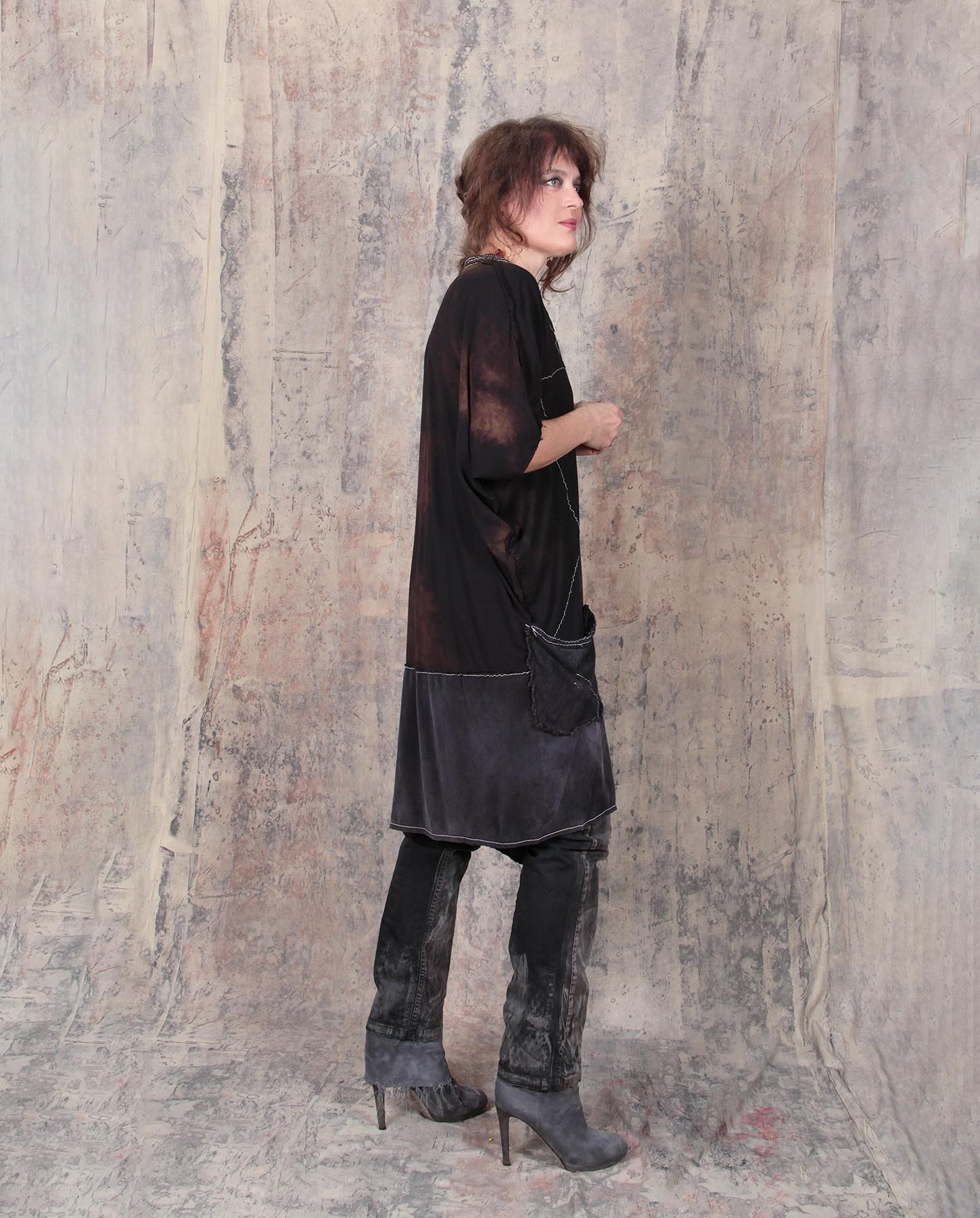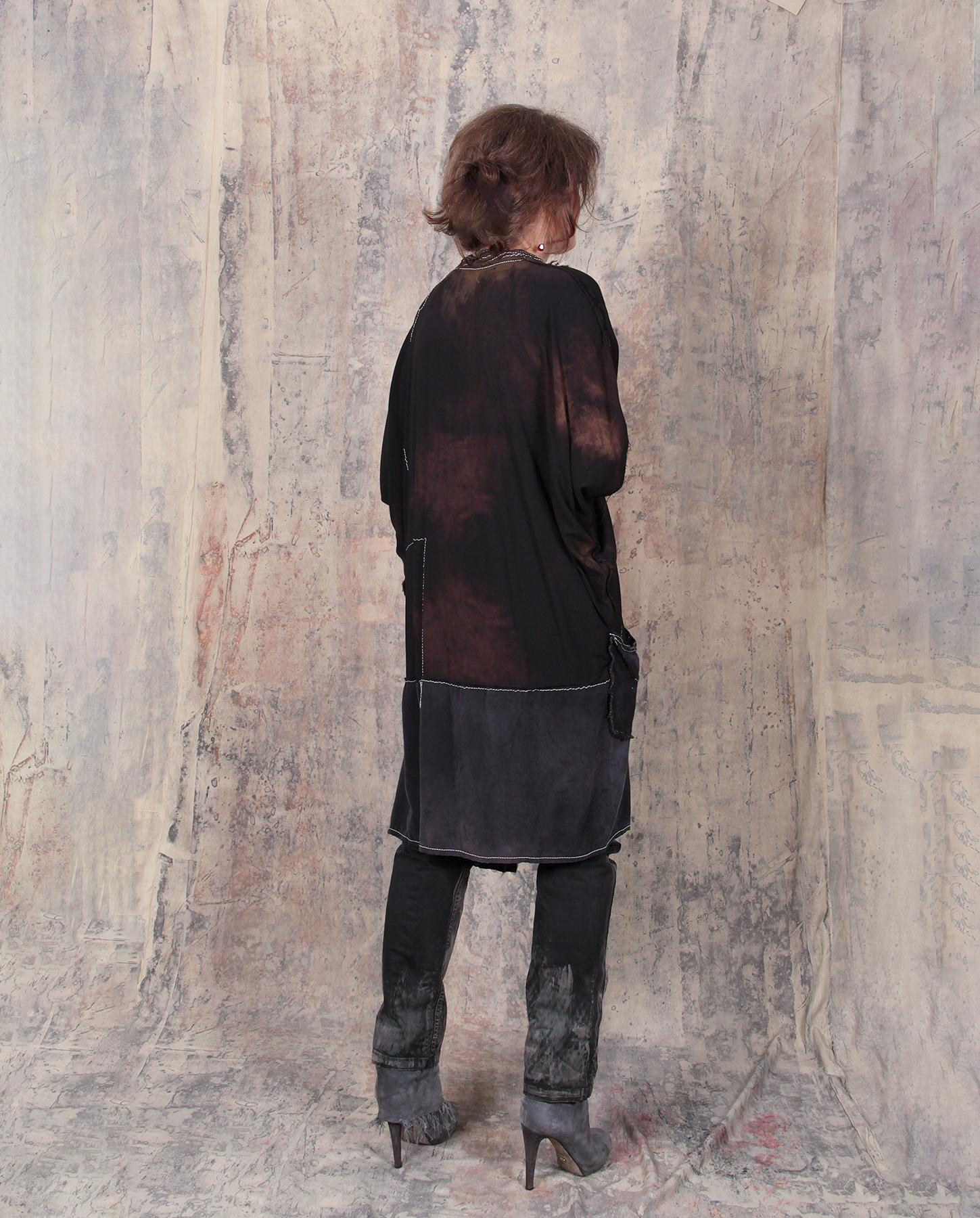 A comfortable, modern, casual piece which is an easy choice for everyday, work or play. Medium weight, it combines soft viscose and cotton/lyocell twill, both giving it a nice drape and a pleasant weight. Batwing sleeve design has an off-off shoulder arm opening, making it like a cocoon around the body. Best for smaller sizes, it needs rooms to breath and hang around the body. Product code: J4581