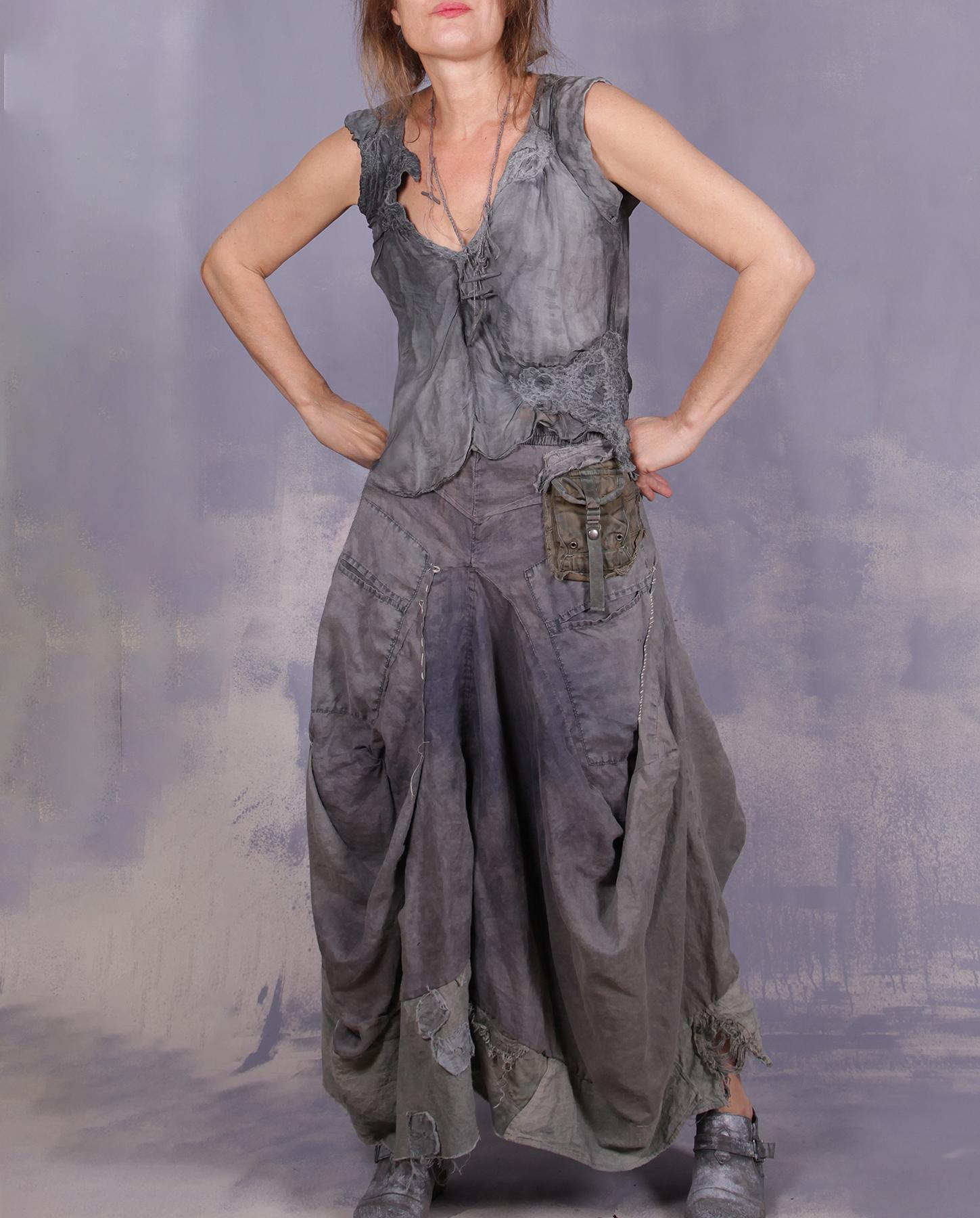 Asymmetrical, mixed fabrics, needlework, hand-knitted inserts, applique, hand-dyed, raw edging.