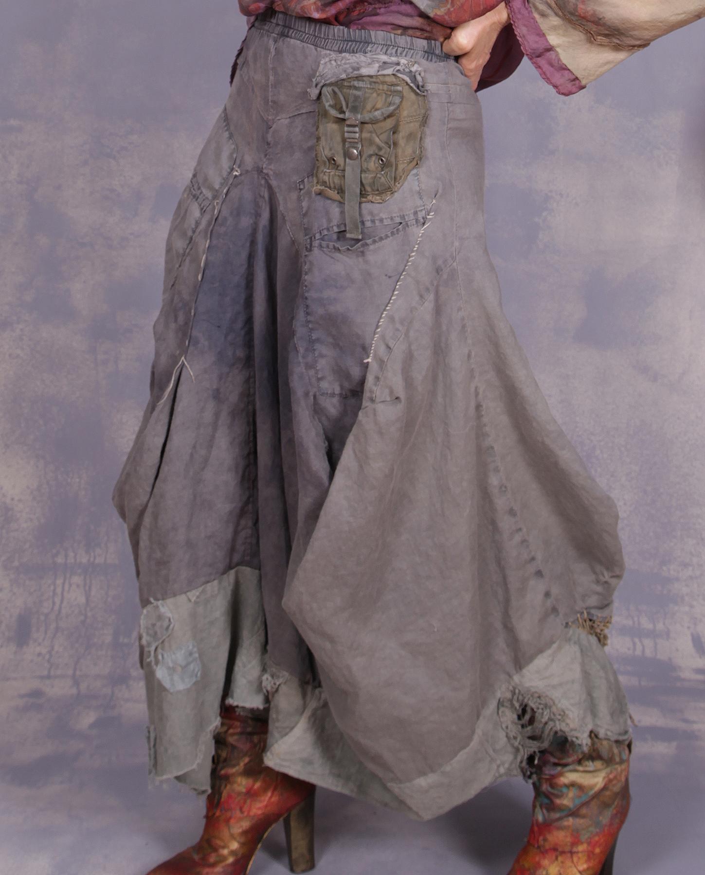 This detailed, mixed European linen full skirt has a 'wow' effect both for the wearer and the observer - with its twists and turns, fluffiness, and contemporary detailing which includes multiple pockets, needlework, applique and hand-knitted openwork insert on the bottom. Neutral mixed gray hand-dyed colors make it versatile and combinable with unlimited possibilities for tops and jackets. Elastic waist assures a good and comfortable fit. Medium in weight, it has asymmetrical bottom and an all-around silhouette. Product code: Y2355