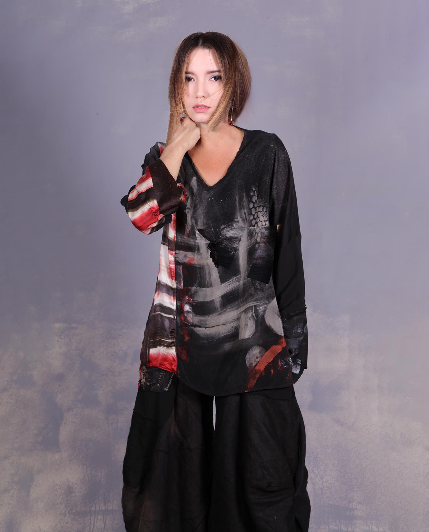 From the "Weightless Wonders" collection, featuring totally reworked antique and vintage scarves and graphic silk panels, this blouse is part of the 'adventure' in black and red, encompassing black tops with different accents in red. It has a fluid form, with a great drape and a comfortable fit, along with mixed silks and other fabrics, offering different textures and visual effects. The 2ply Bemberg crepe feels cool against the skin - you will enjoy it in warmer months. The blouse has more color all-round compared to the other pieces in this mini-series, and features asymmetrical length and type sleeves, with different inserts and hand-painted accents. Visually intriguing, it can be worn with a variety of outfits and is great for travel. As with all lightweight silk items, it can be easily tucked in or tied on the side for a shorter version and a different look. Product code: I1937