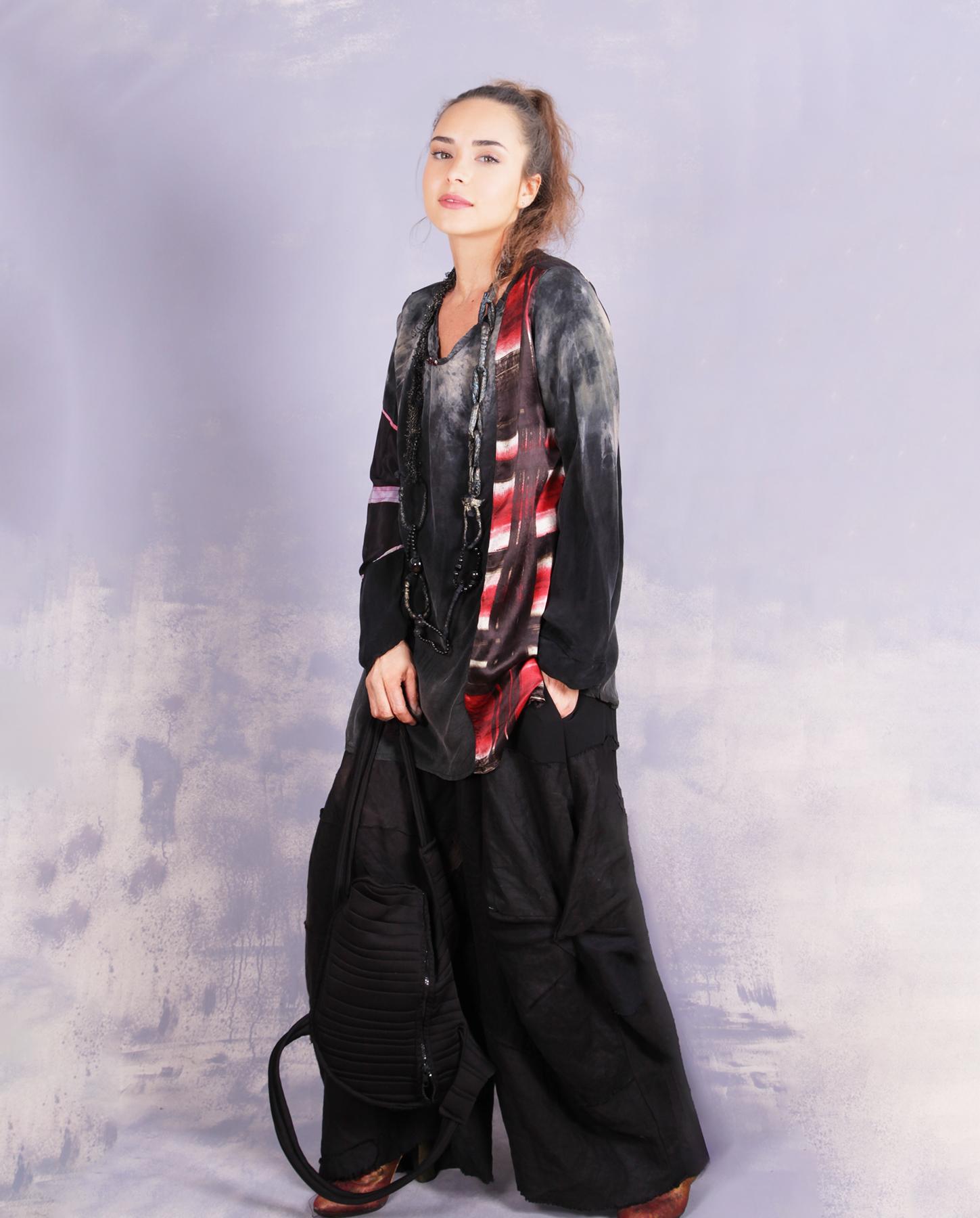 From the "Weightless Wonders" collection, featuring totally reworked antique and vintage scarves and graphic silk panels, this blouse is part of the little 'adventure' in black and red with black crepe as the base and red silk inserts as accents. It has a fluid form, with a great drape and a comfortable fit. With 2ply crepe as the base, it will move around the body with ultimate ease and feels cool against the skin. Features 3D accents around the neckline, which is a modified V-neck, and hand-painted distressed silk inserts in back and on the side. Visually intriguing, it can be worn with a variety of outfits and is great for travel. Product code: P3843
