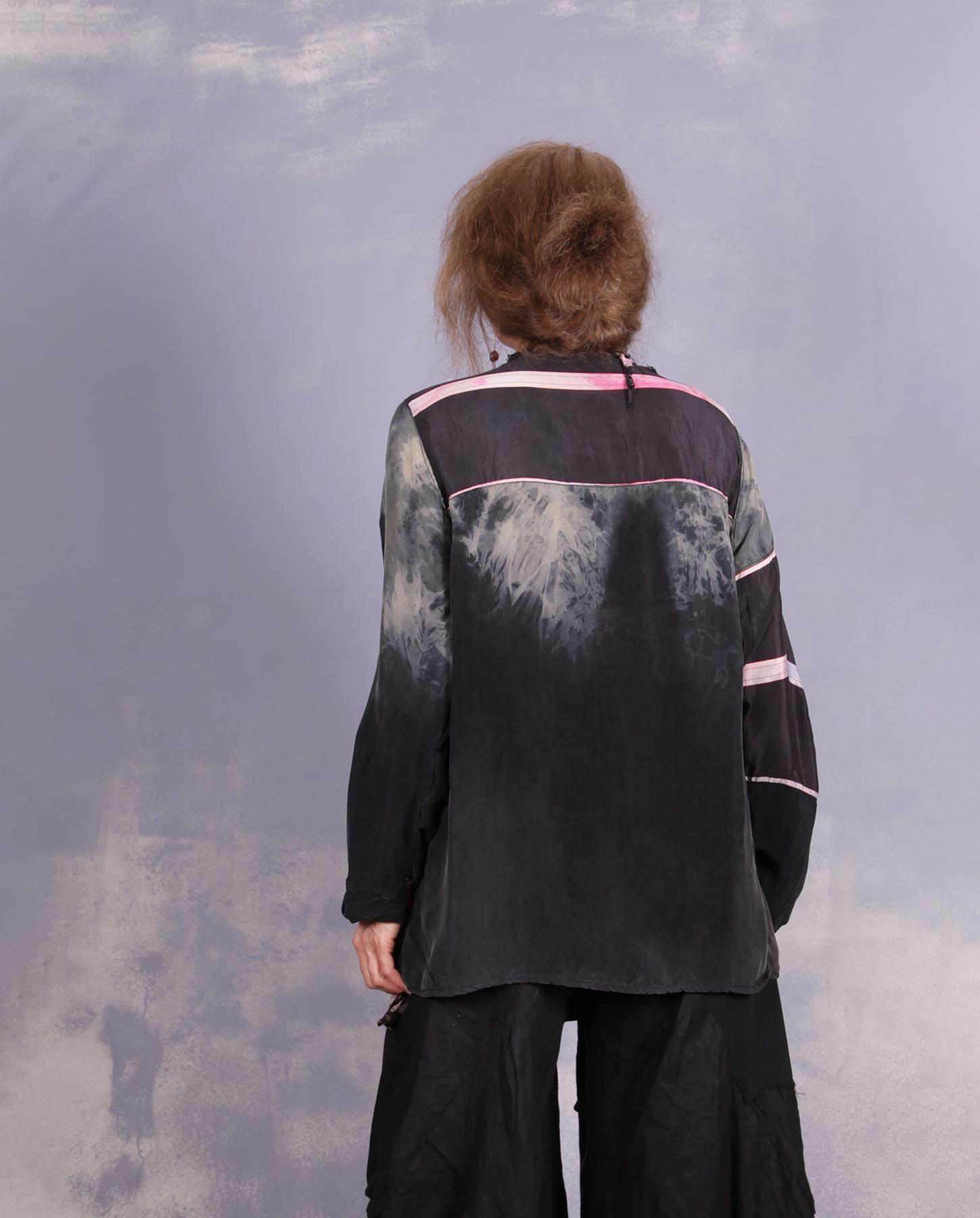 Built-in sleeves, modified V-neck, 3D accents around neckline, mixed silks, hand-painted, asymmetrical.