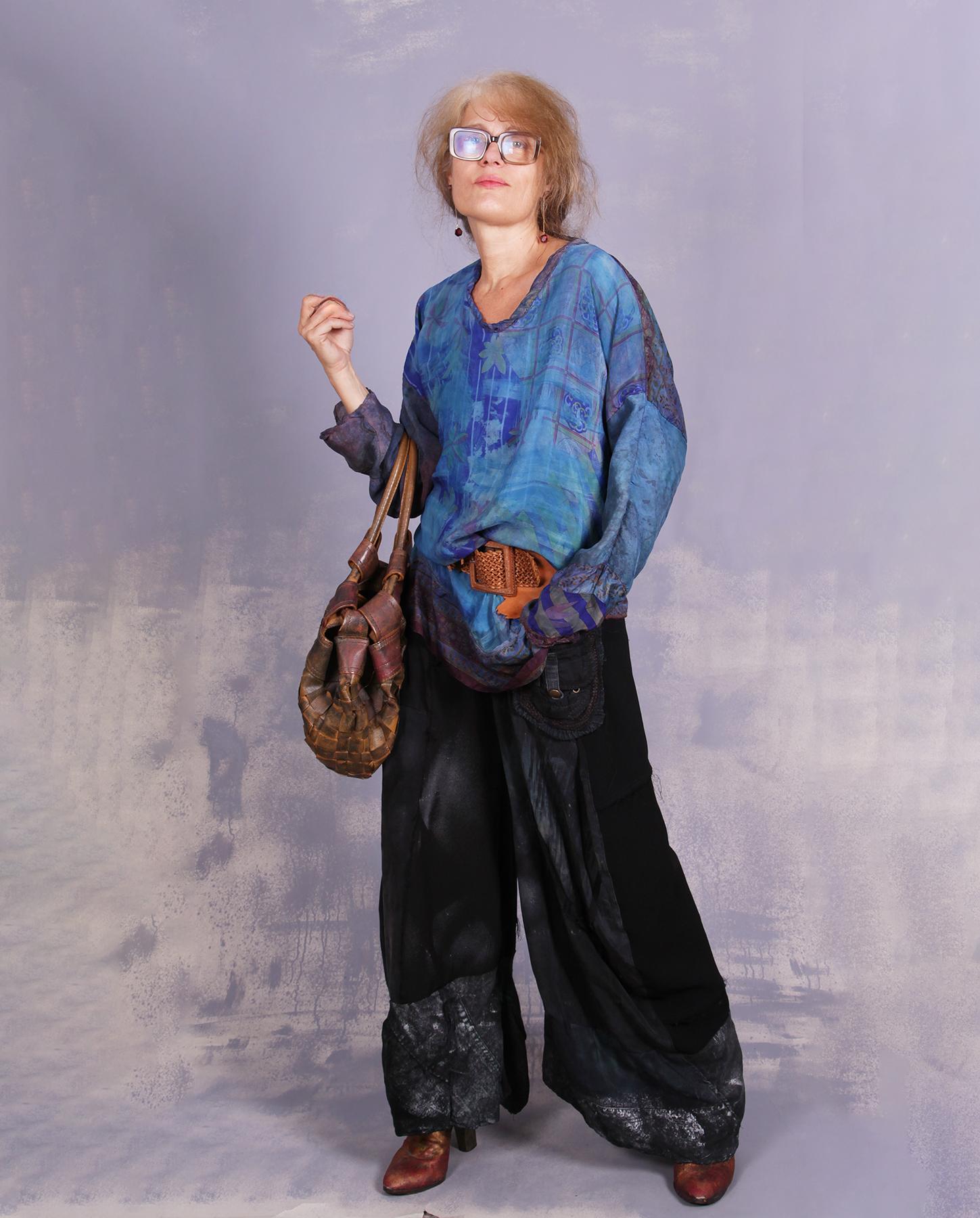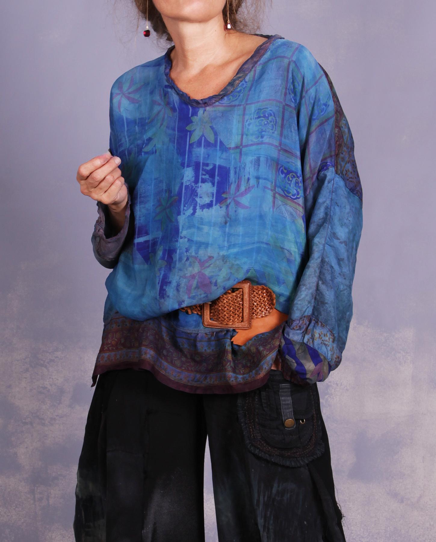 From the "Weightless Wonders" collection, featuring totally reworked antique and vintage scarves and graphic silk panels, this piece has a gorgeous blue color, mixed interesting patterns and versatility - wear it as a dress or a tunic or belted/tucked in/tied as a shorter blouse. Very lightweight, it feel amazingly light and pleasant when on. Made out of four different vintage silk scarves from Italy, it is artful, modern and feminine all at once. The different patterns mix organically as a result of the process the artist created for working with scarves which by themselves, as they are, can rarely be combined in one finished pieces. A wonderful top or dress you will definitely enjoy wearing and perfect for travel. Product code: N3857