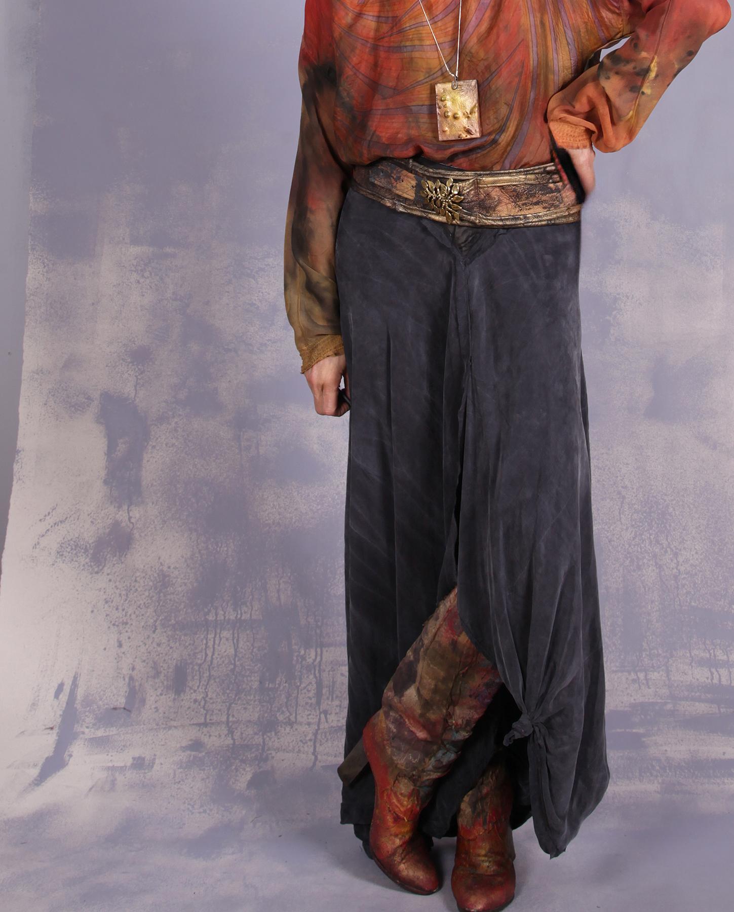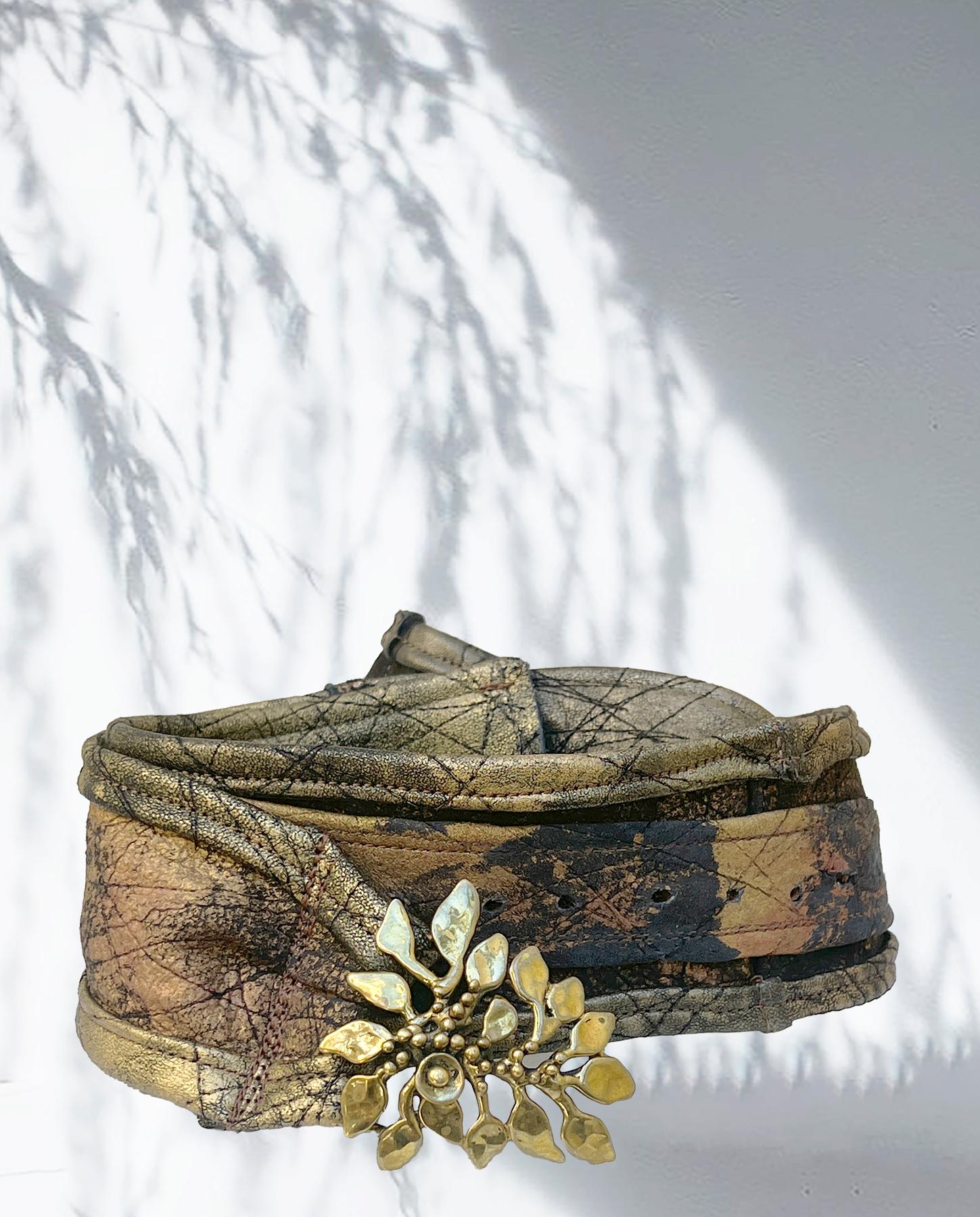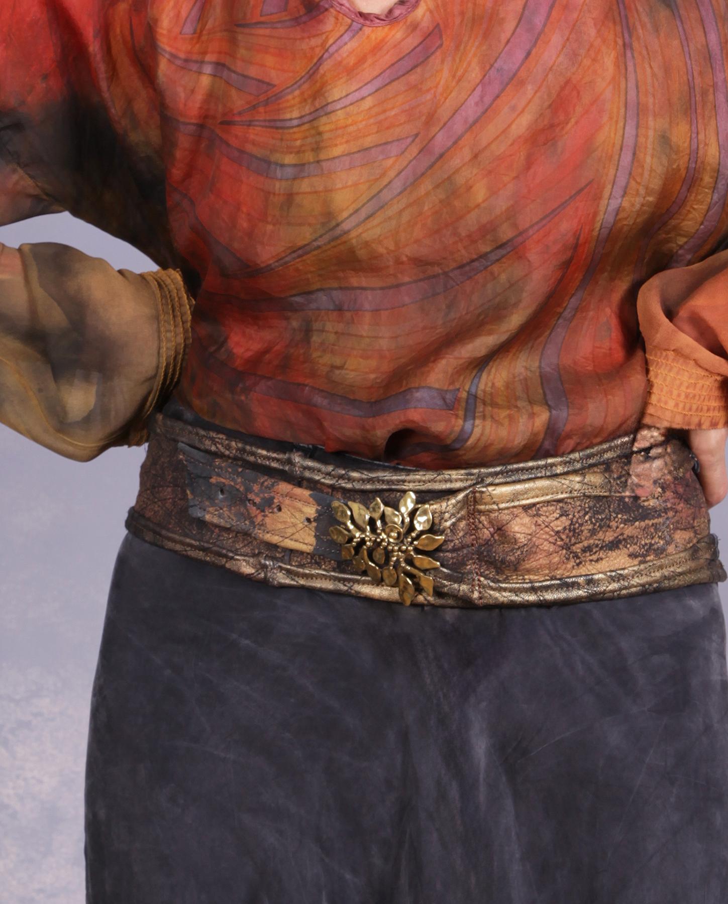 Featuring a unique, collectible vintage solid brass buckle in the shape of a tree branch, this soft and pliable recycled leather belt has been hand-textured and hand-painted with rust, bronze and antique gold accents over black. It can be worn on the hips or on the waist and is meant to be adjusted to the desired size upon purchase (has a feature of further adjustment built in too). Very versatile with its color scheme and is a fun addition to any outfit, just a few examples shown here. Product code: F2494
