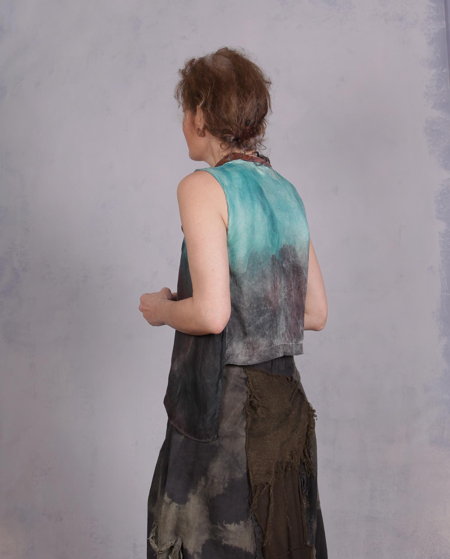 There is something so alluring about this top - it may be the color combination of bold turquoise and brownish tones, or the visual 'burst' on the bottom above the overlay next to the small pocket, or the slightly rounded V-neck, trimmed in painted silk... This artful top has a masterful combination of different silks to assure perfect balance and an unexpected difference between the front and that back, hand-painted in a stonewashed look as if to 'talk' to the front in a different language. A wonderful addition to many different outfits. Product code: B0844