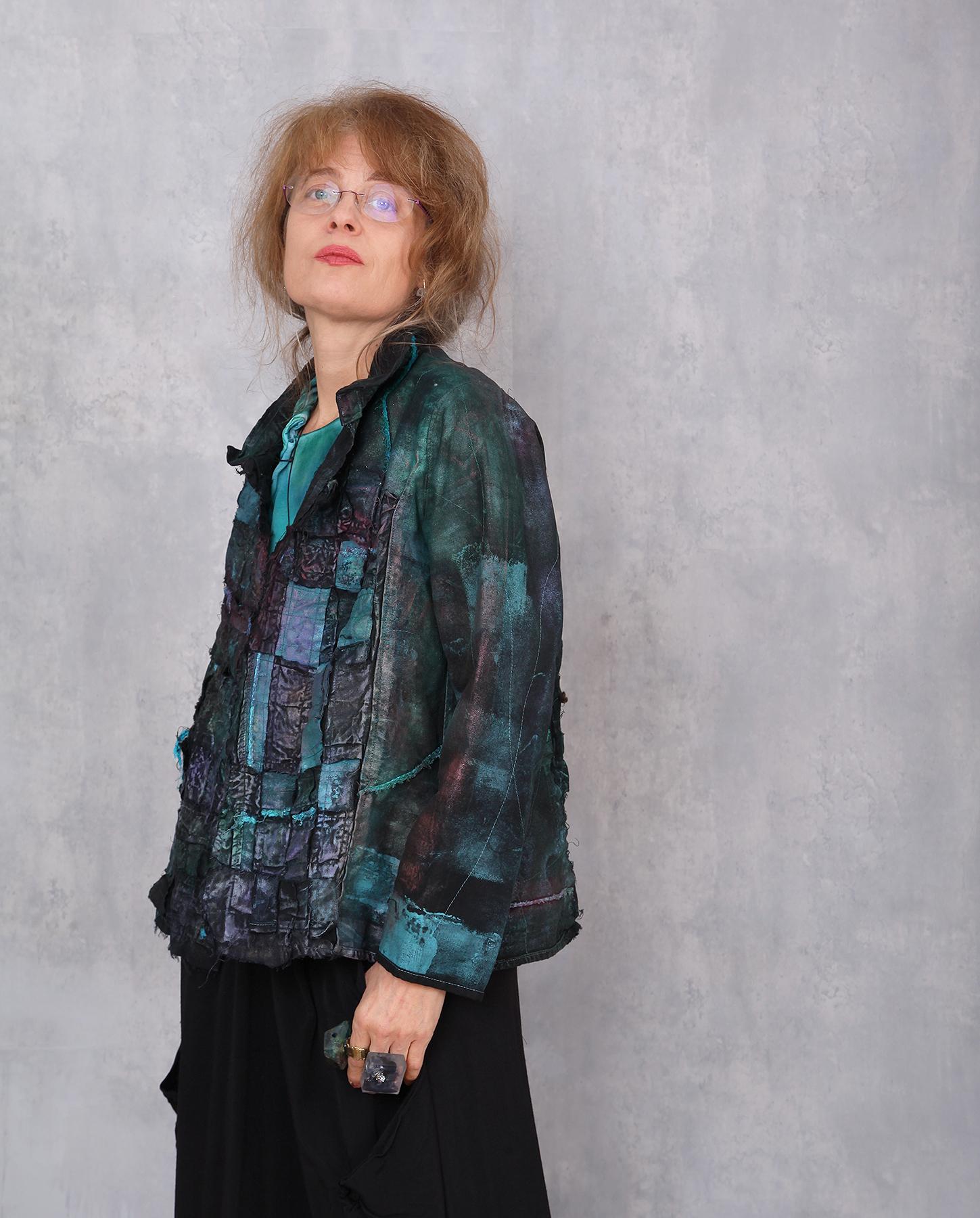The body of this jacket has been woven by hand by the artist basket-weave style, making it appear like it is made of many differently sized squares and rectangles. Added to that intricate styling is applique and raw edging. Painted by hand in sparkly metallic colors of teal deep copper, emerald green, wine and more with black as the base neutral shade to tie it all together. Lightweight, comfortable and easy care, it will take you through different outfits throughout the year. Product code: W4348