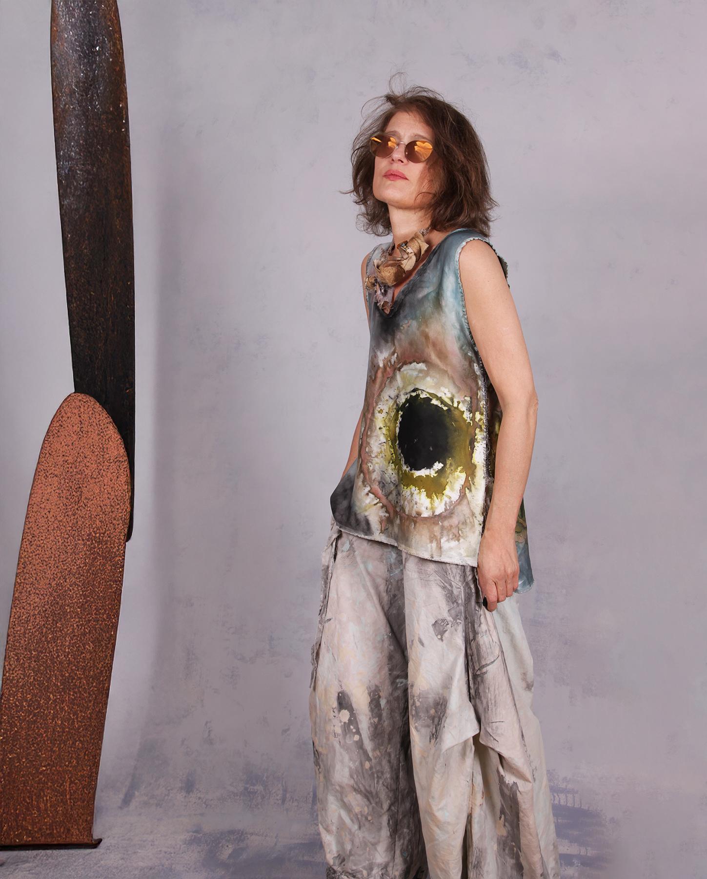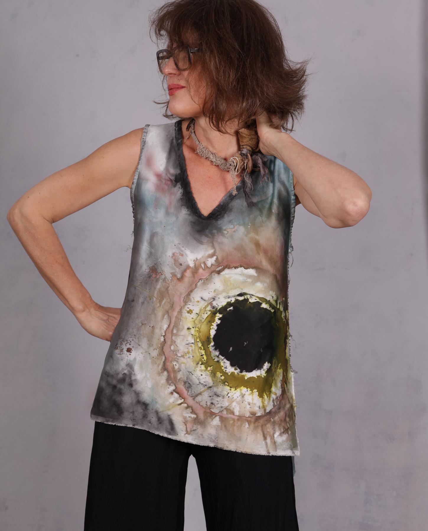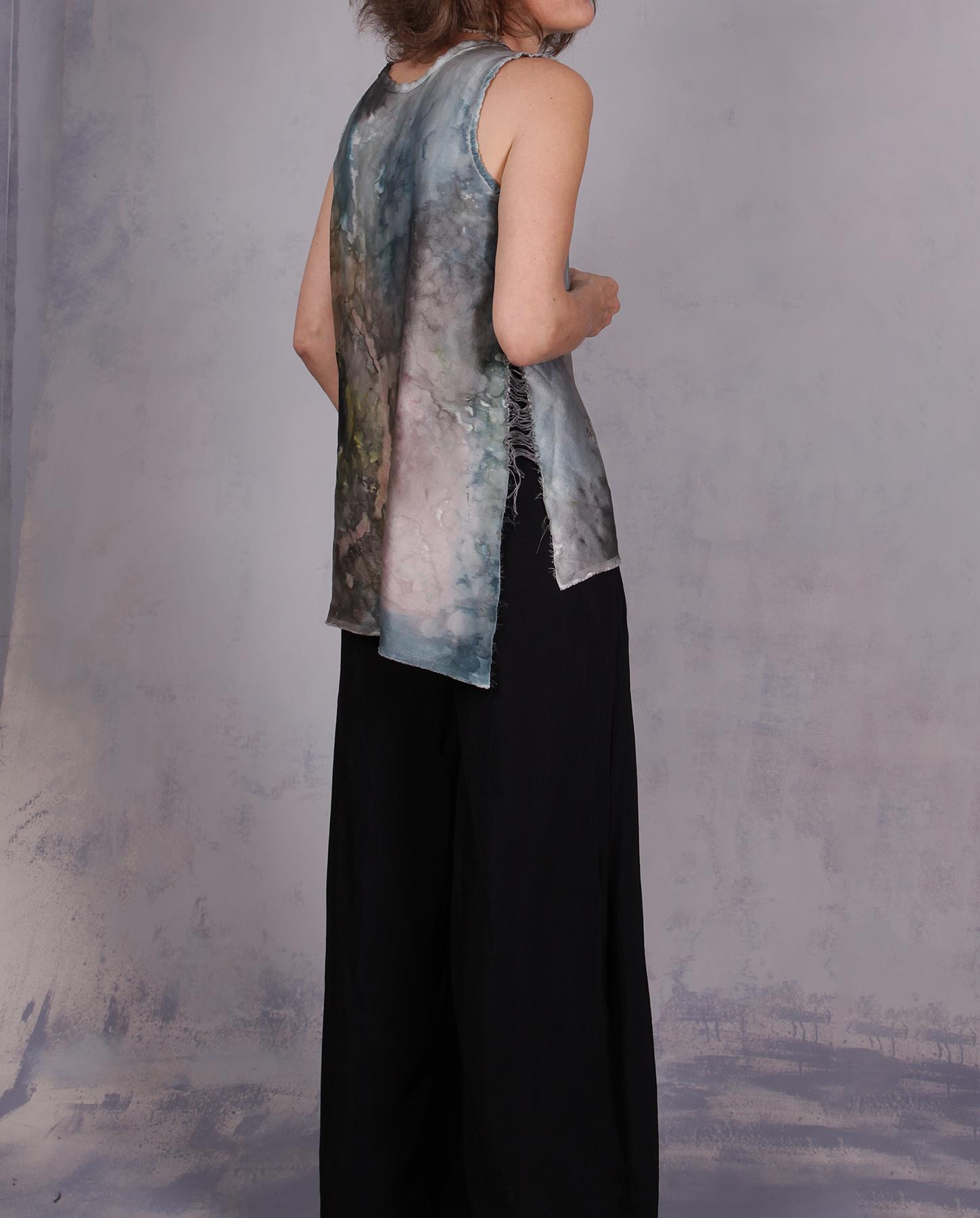 This pure wearable art blouse is high couture in every way - crafted from a heavier, luxurious lustre silk that catches the light with every movement, it falls beautifully around the body and has a pleasant weight to it. If you don't want the lustre, you can wear it inside-out on the crepe side that looks almost exactly the same. A narrative of moody, atmospheric tones unfolds across the garment, featuring a washes-of-ink print that resembles a stormy sky or a delicate watercolor painting. This creative piece is defined by its asymmetrical silhouette and signature structural details. The sides are joined by intricate hand needlework in Belgian linen, with some raw edging, creating a deconstructed, ladder-like effect that provides both ventilation and a unique visual rhythm. For ultimate comfort against the skin, the V-neckline and armholes are finished with a soft silk trim, ensuring a gentle touch and a clean, sophisticated edge. Balancing raw, hand-worked elements with the opulence of fine silk, this blouse offers a soulful, "wearable art" alternative to the classic sleeveless top. It can be easily dressed up or down, hence the title - you literally can wear it all day long with equal ease! Non-wrinkling and easy care as well, perfect to take on trips. Product code: G5464