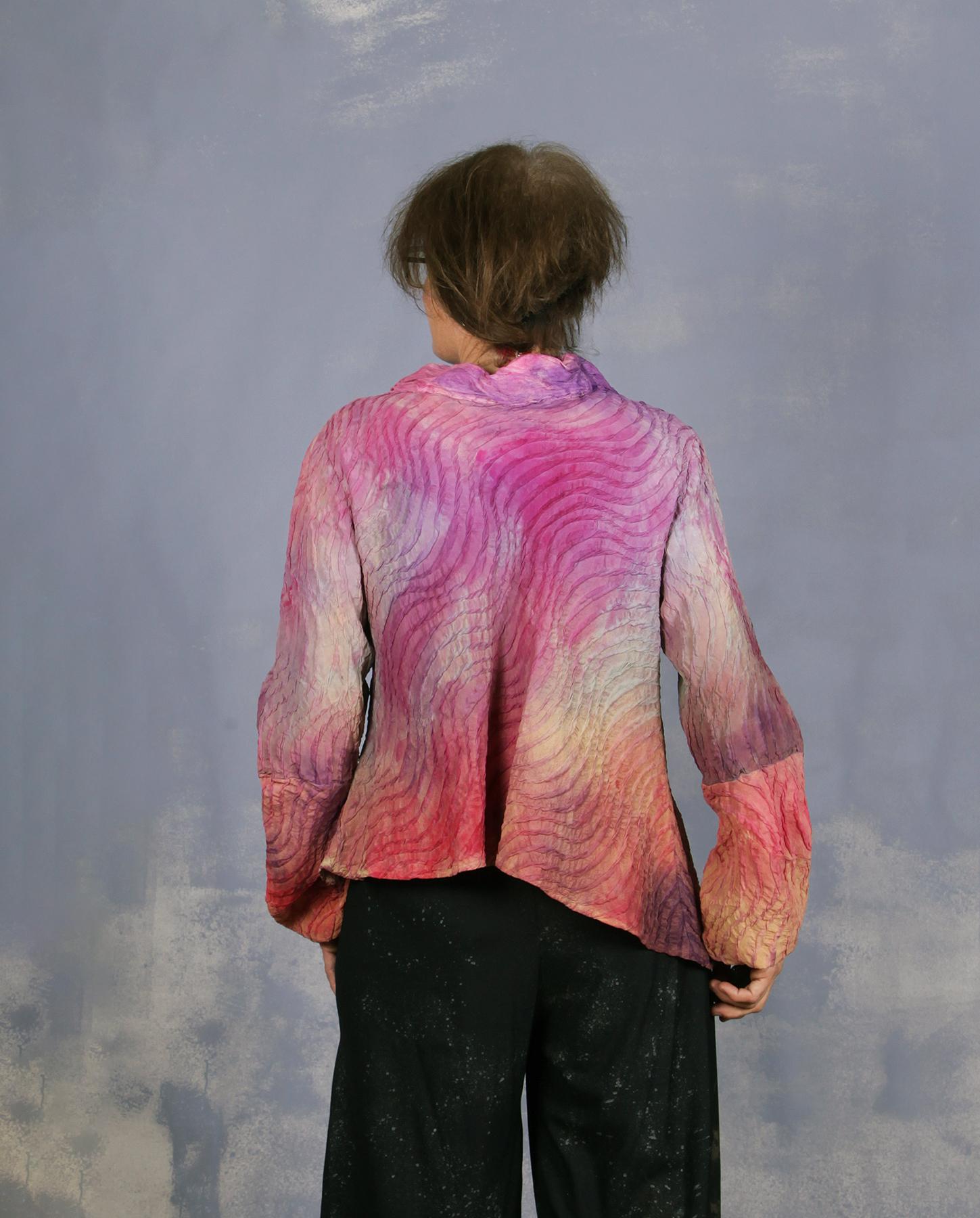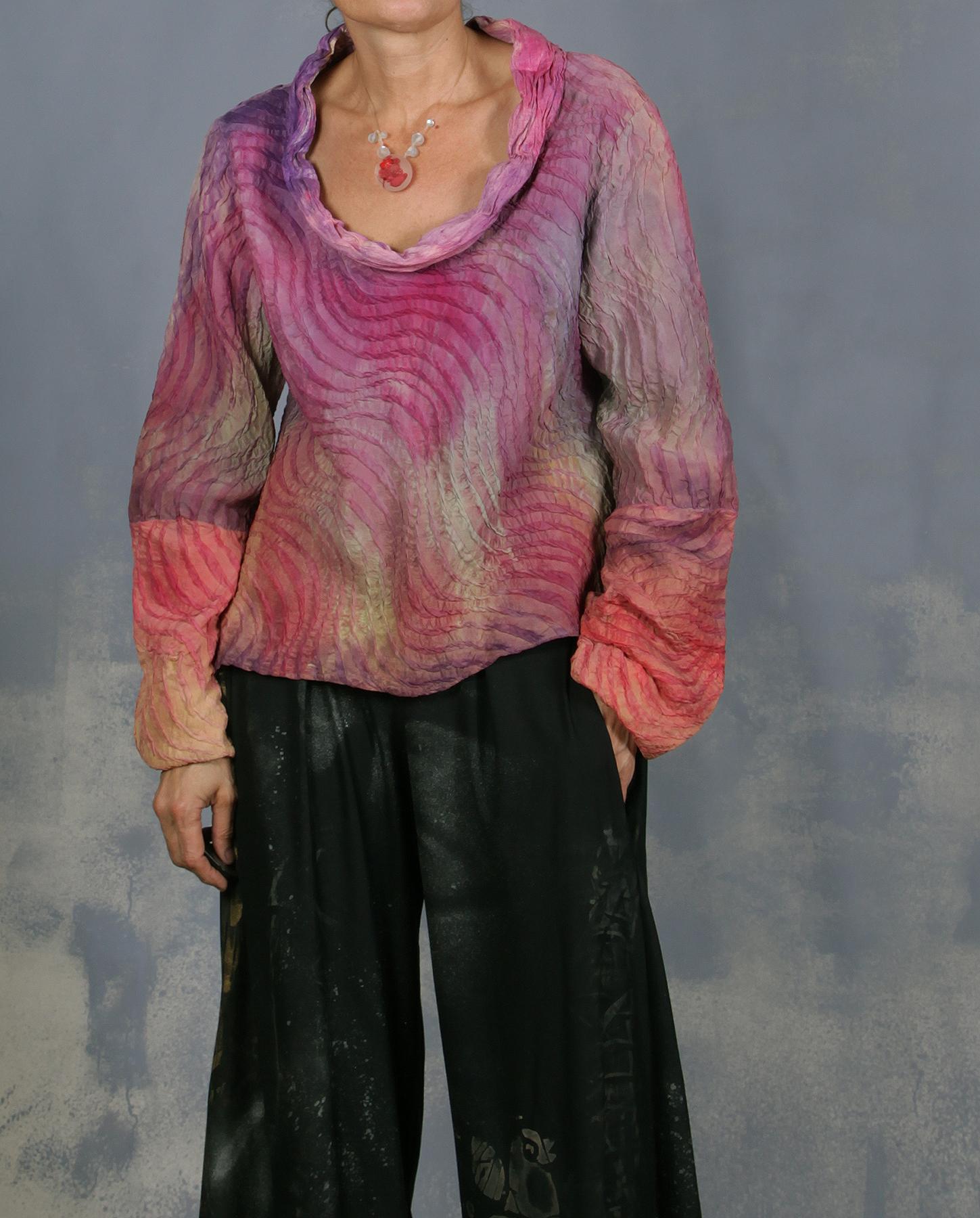 Showcase yourself to the full with this artistic creation! Made out of amazing silk with spongy raised texture, the blouse features sculptural asymmetrical sleeves, deep scoop neckline, trimmed in layers of crinkled taffeta silk, semi-bias cut that creates beautiful lines on a body and a gorgeous silhouette in the back, and of course masterfully mixed hand-painted colors. It really does not need any additional description - definitely speaks for itself. Lightweight and non-wrinkling. Because of the cut it will fit from small to medium. Product code: B6114
