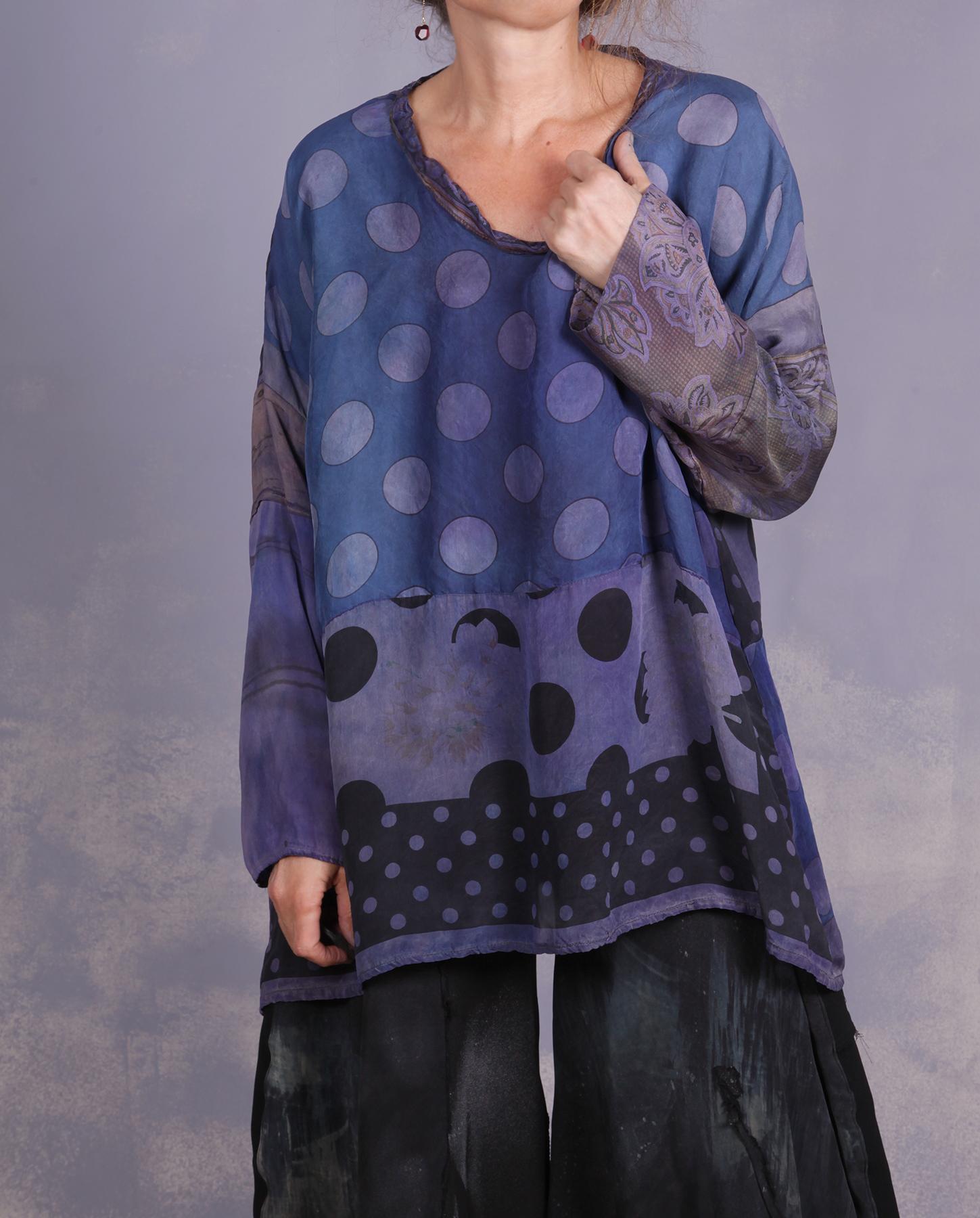 From the "Weightless Wonders" collection, featuring totally reworked antique and vintage scarves and graphic silk panels, this tunic/blouse is perfectly whimsical and utterly comfortable and breathable, lightweight yet not weightless, with a great drape and soft to the touch. It has been made out of four vintage scarves, combined perfectly to play on the classic patterns of flowers, polka dots and paisley (which is very subtle compared to the centerstage dots). Made with a roomy design, it will fit a range of sizes and can be tucked in or belted for a shorter look - or if you would prefer, it can be permanently fitted and shortened upon request. A great modern piece on a classic theme you will enjoy, for travel as well. The artist was able to preserve the name of the designer on one of the scarf panels (Adrienne Vittadini) - have fun looking for it! Product code: L9856