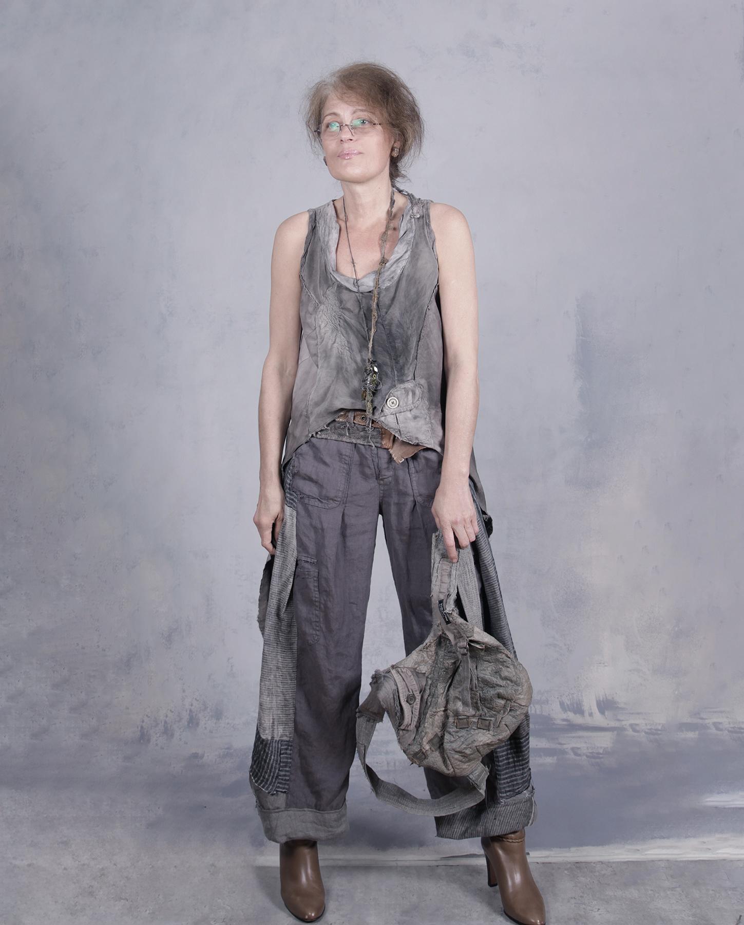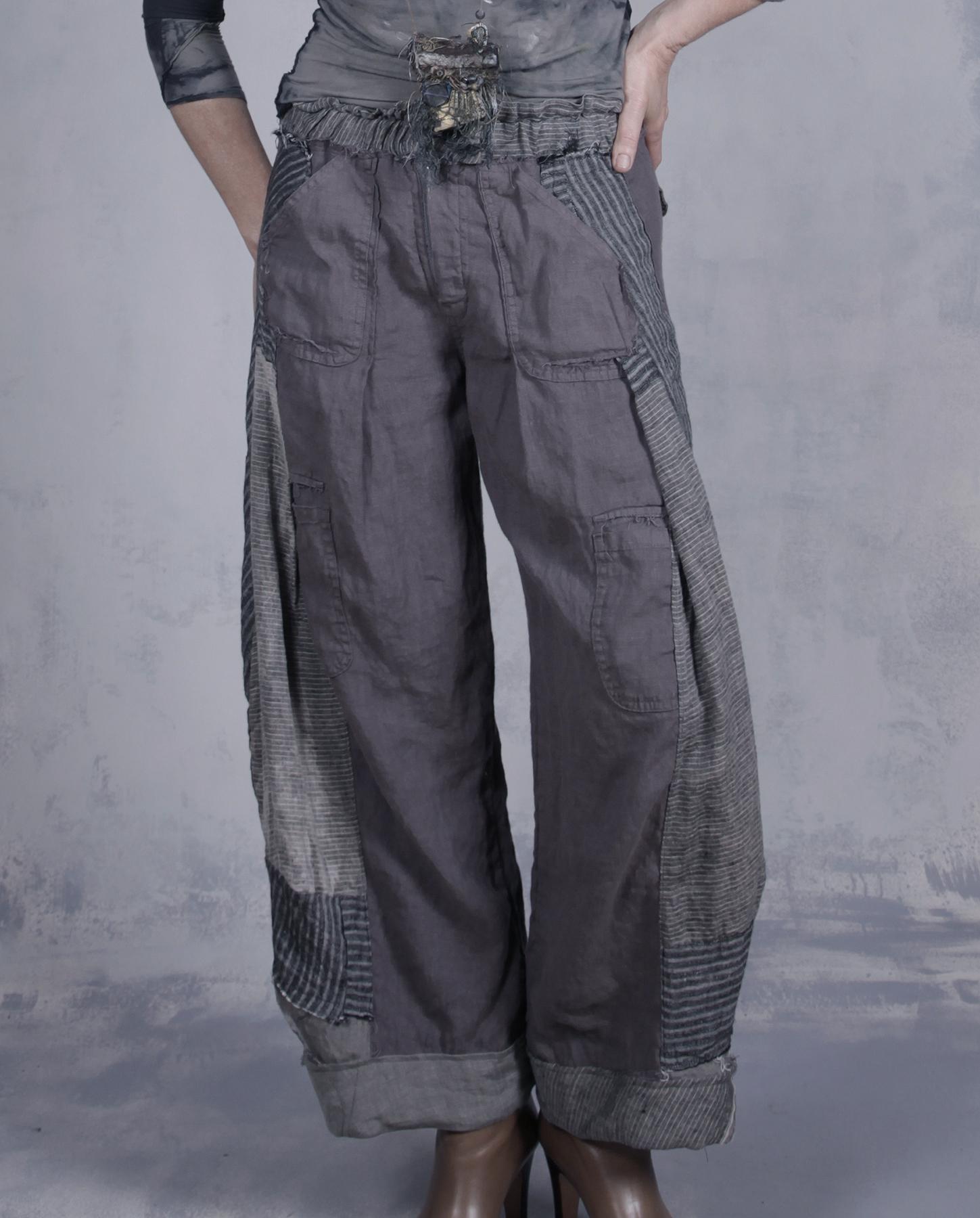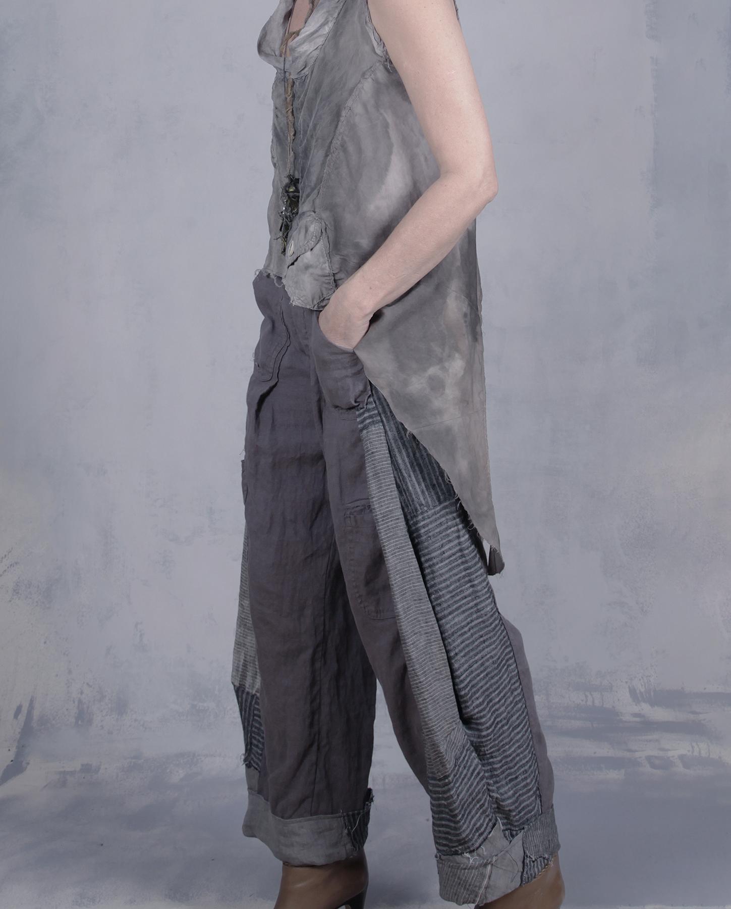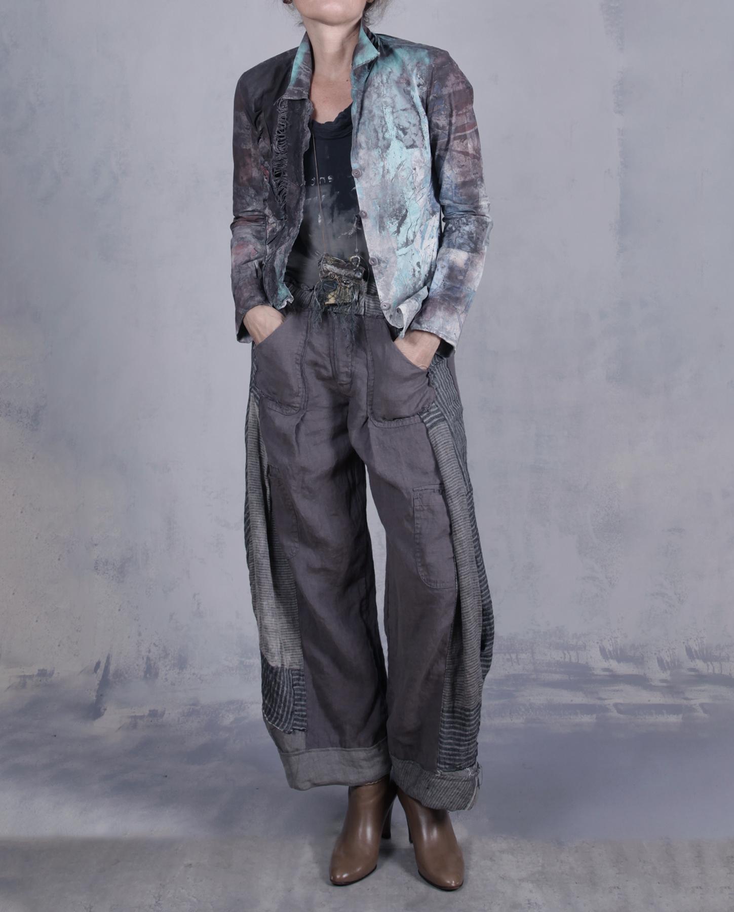 Here is a pair of pants that will go literally with everything - at least in terms of what the artist creates, as shown in just a few examples. With their neutral gray color scheme, moderately wide leg, fitted top, slightly tapered bottom and unusual angles, they are comfortable and versatile, and can be worn with boots or flats or even strappy sandals if you want to dress them up, which is also a possibility with the right top and jacket. The pants combine three different types of European linen and have a zipper front, two front pockets and back pockets as well. The top is elastic for a better fit. They have been slightly distressed in different areas to give the color more depth and enhance the artistic feel. A great everyday pair you will enjoy throughout the year. Product code: Y9469