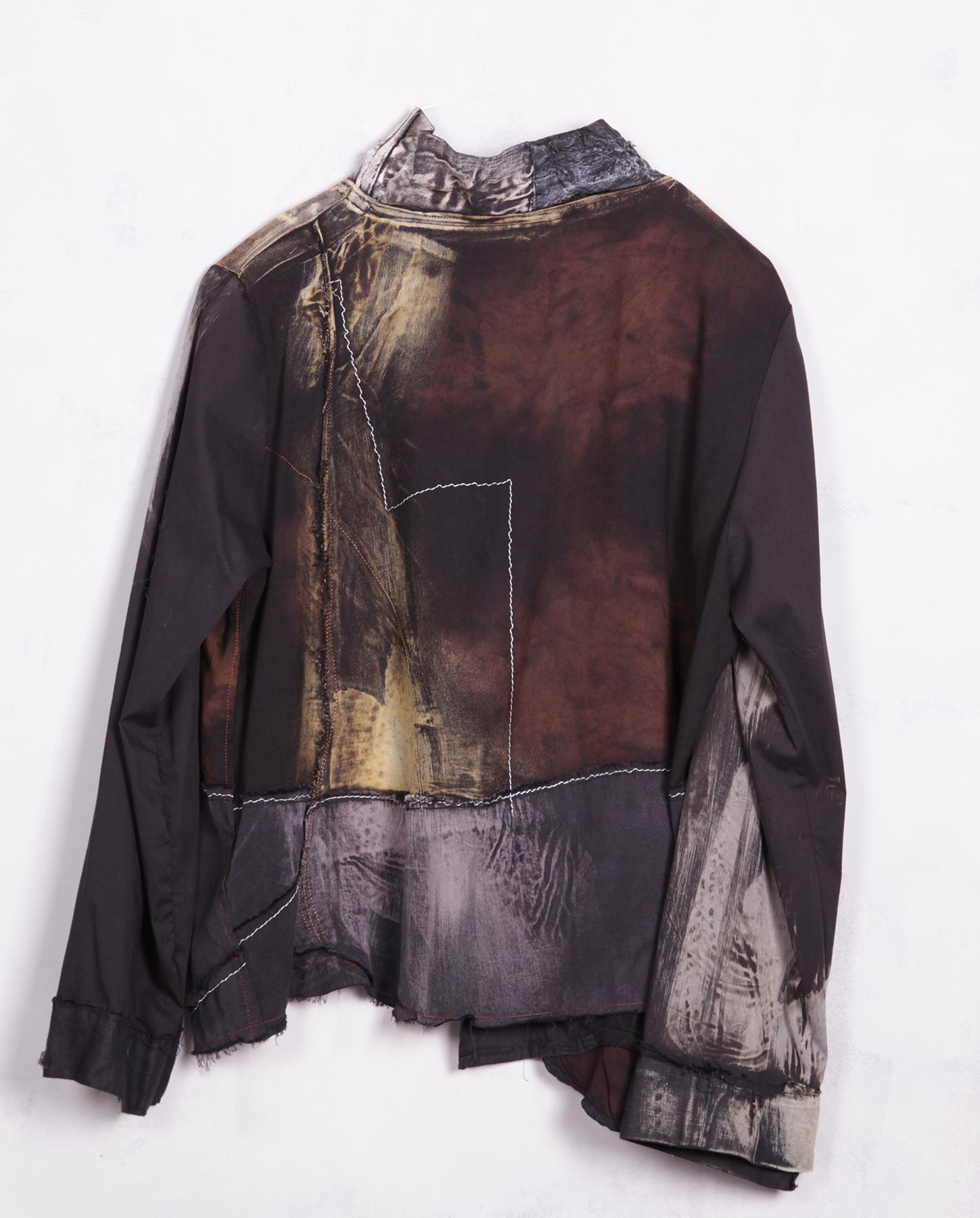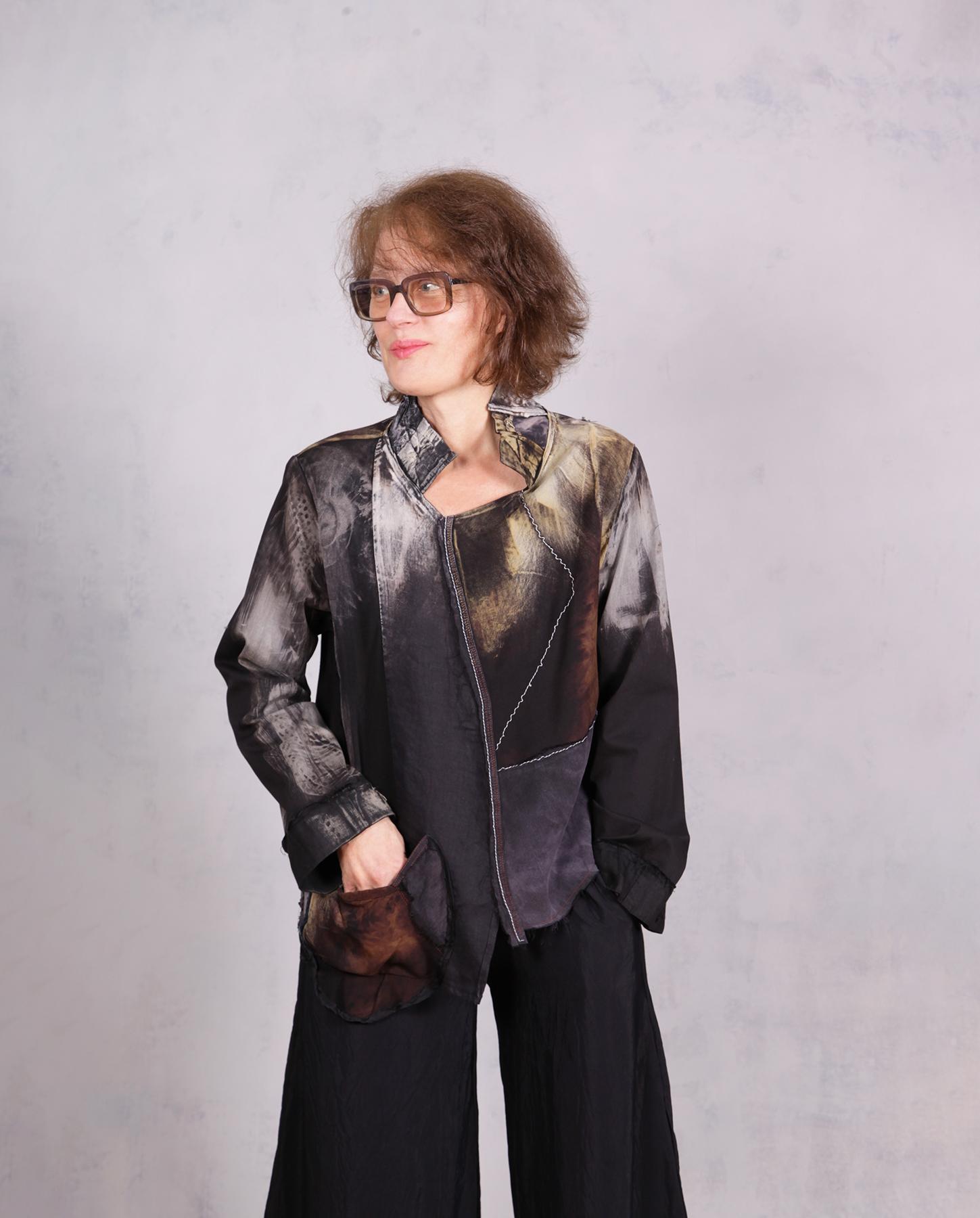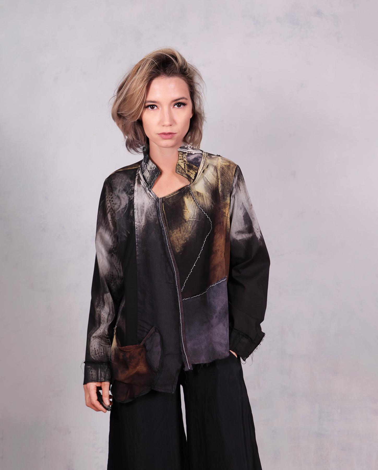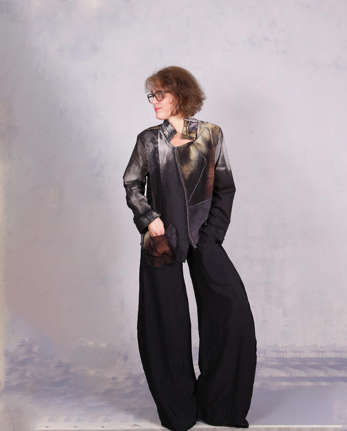 This blouse is pure art-to-wear, with its harmonic color play, intricate detailing and overall construction. All the different shades set against black are deep and intriguing, with many variations as a result of careful hand distressing. The contrast top stitching adds yet a different dimension to this already multidimensional pieces. Fluid, with lots of drape, it combines various natural fabrics that are soft and pleasant to wear. Asymmetrical overall construction will fit a variety of sizes, from small (shown) to large and possibly XL (please check measurements). As with all items, it is washable and dryable and perfect to take along as it is wrinkle resistant. Product code: H2963