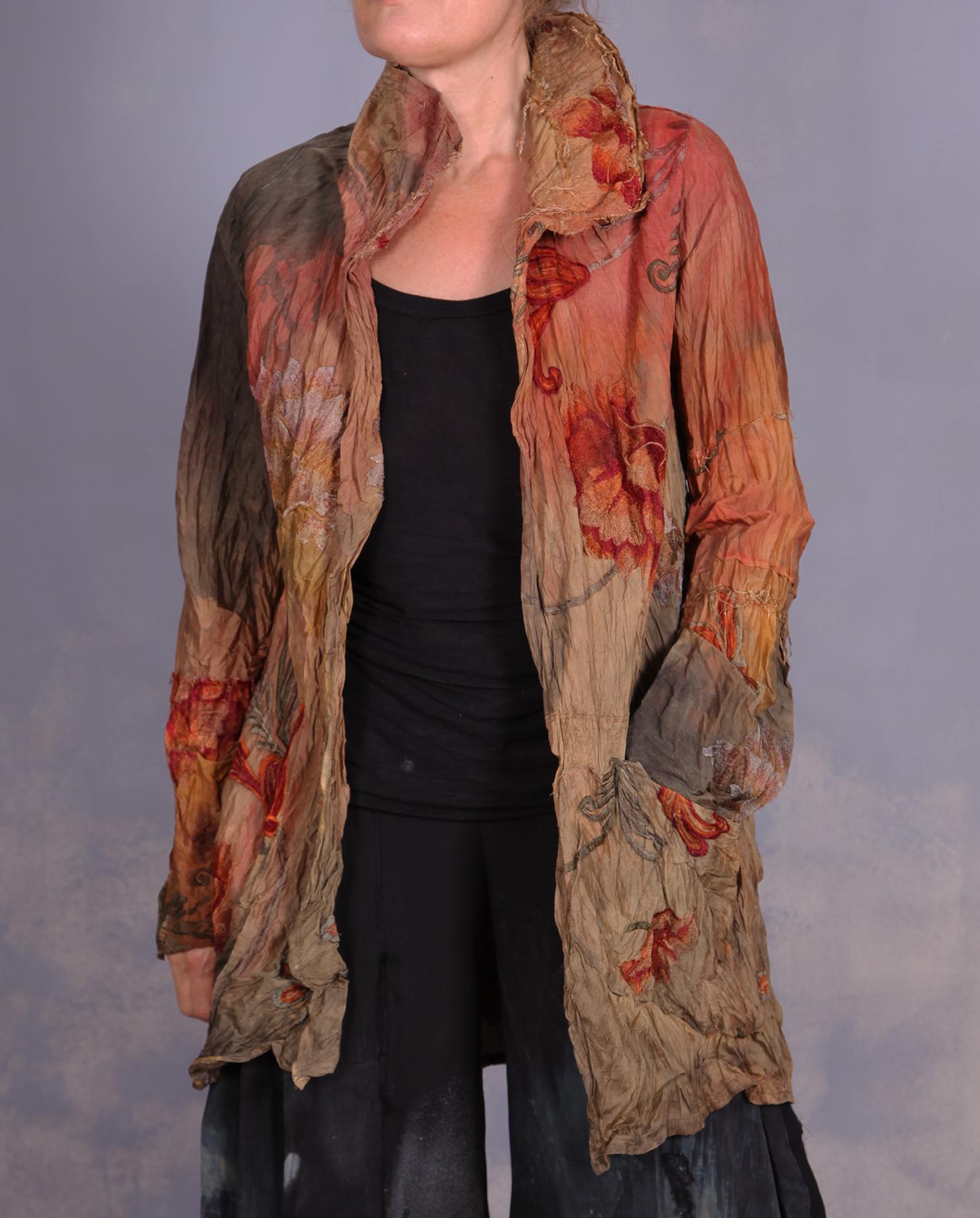 This chic creation has a perfect weight - not too light but not heavy either, a nice drape, and rich colors with a slightly distressed look, with a touch of raw edging, which was meant to offset the floral design, thus making a generally traditional look come across as very contemporary. The fall palette brings to mind images of fallen leaves, especially considering the slight texture to the fabric. The antique silk has dense, beautiful floral embroidery throughout which adds to the weight of the otherwise very light silk. Easy care (washable), it can also be dried crinkled up for a different fit and different look (see one of the pictures, and let us know which way you would like to receive it). The jacket will work well as true to size or oversized, as shown. Doesn't currently have a closure but a button closure can be put in upon request. Product code: X7365