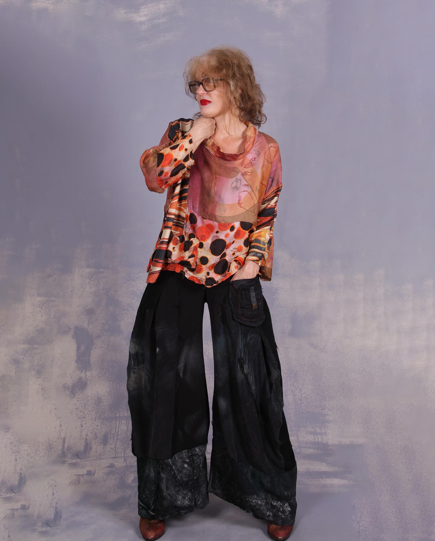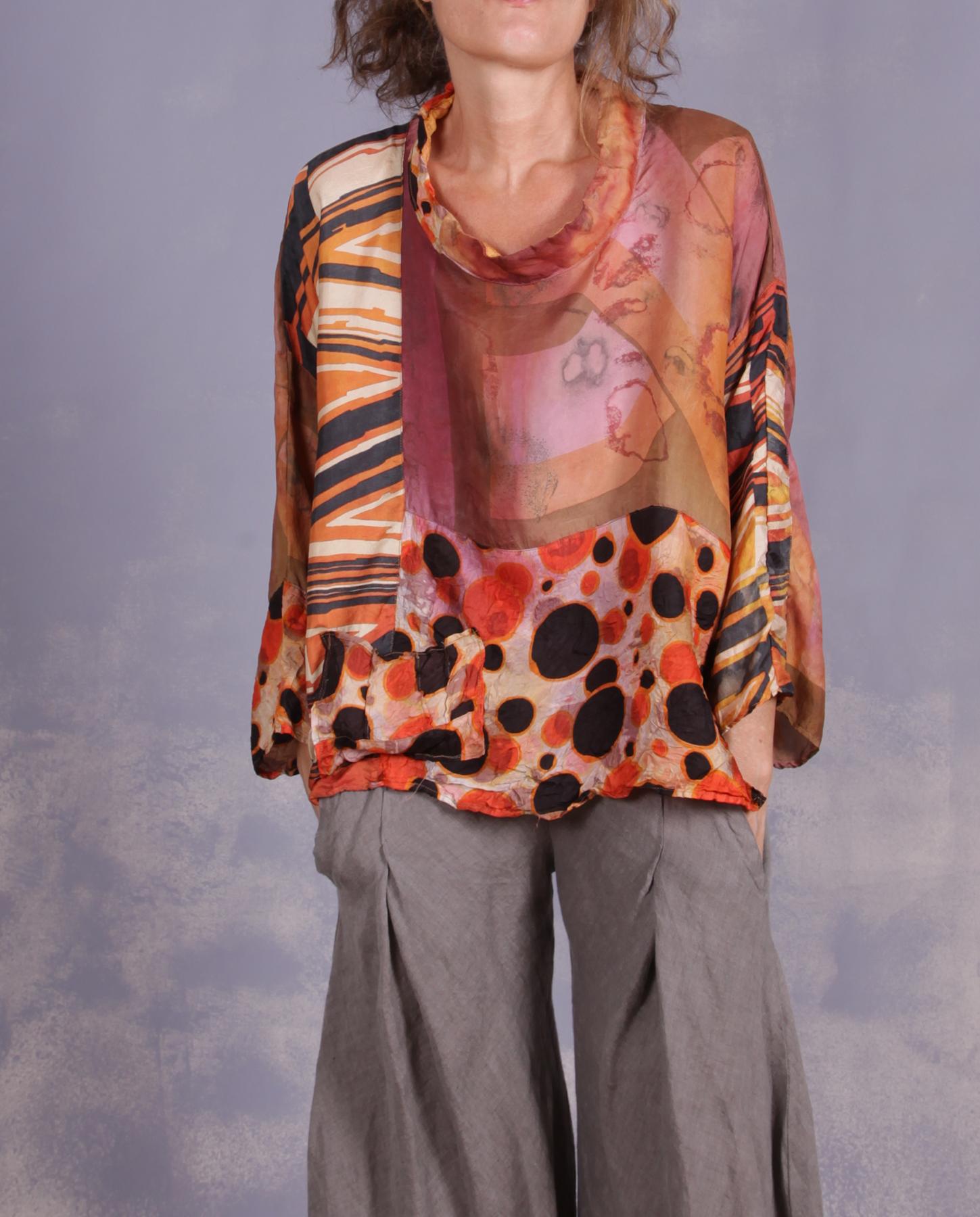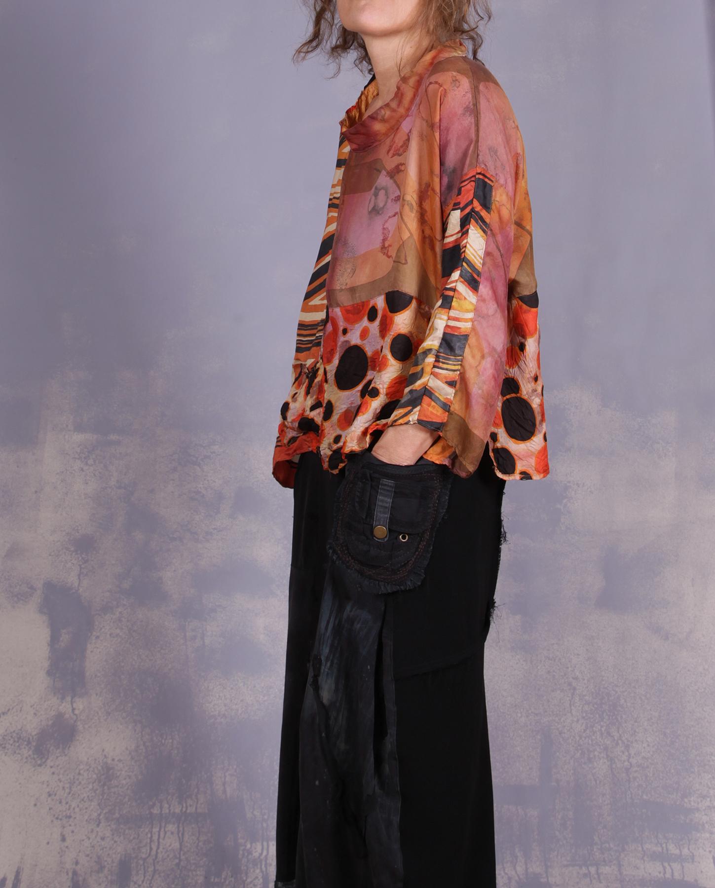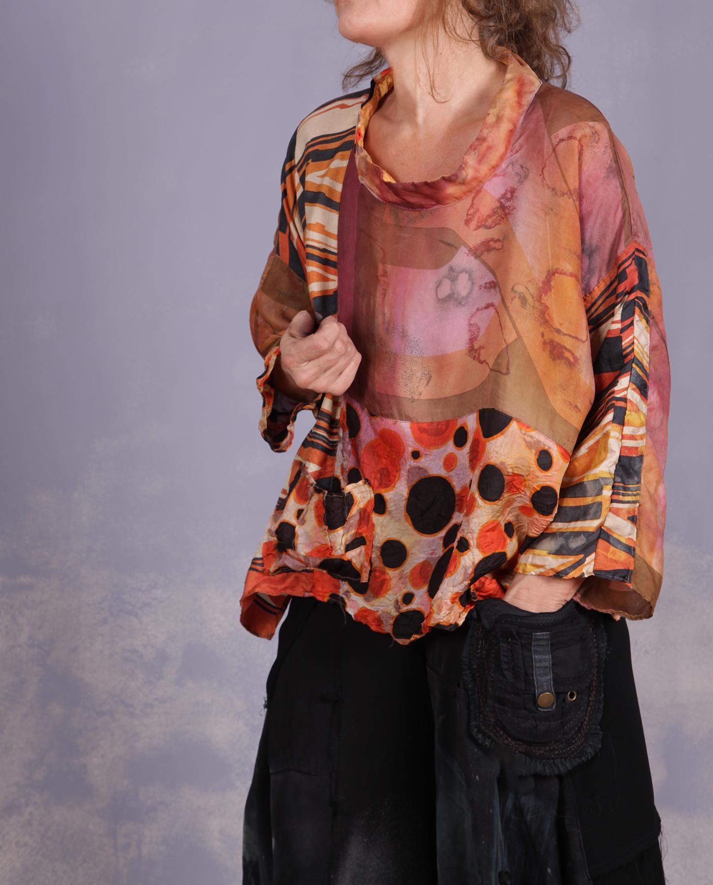 From the "Weightless Wonders" collection, featuring totally reworked antique and vintage scarves and graphic silk panels, this blouse is so much fun all-around! With its mixed graphics of the Op Art era and different textures, all brought together by a befitting hand-painted design, it stands out as an artistic piece and is very pleasant to wear. The bottom can be either crinkled as shown or pressed out for a smooth, flat look which is also cool and makes the top a bit more swingy. Four different scarves from Spain and Italy from the 70s-80s have been used in the creations of this fun piece. It has enough room to fit a variety of sizes (shown on small). Product code: K3772