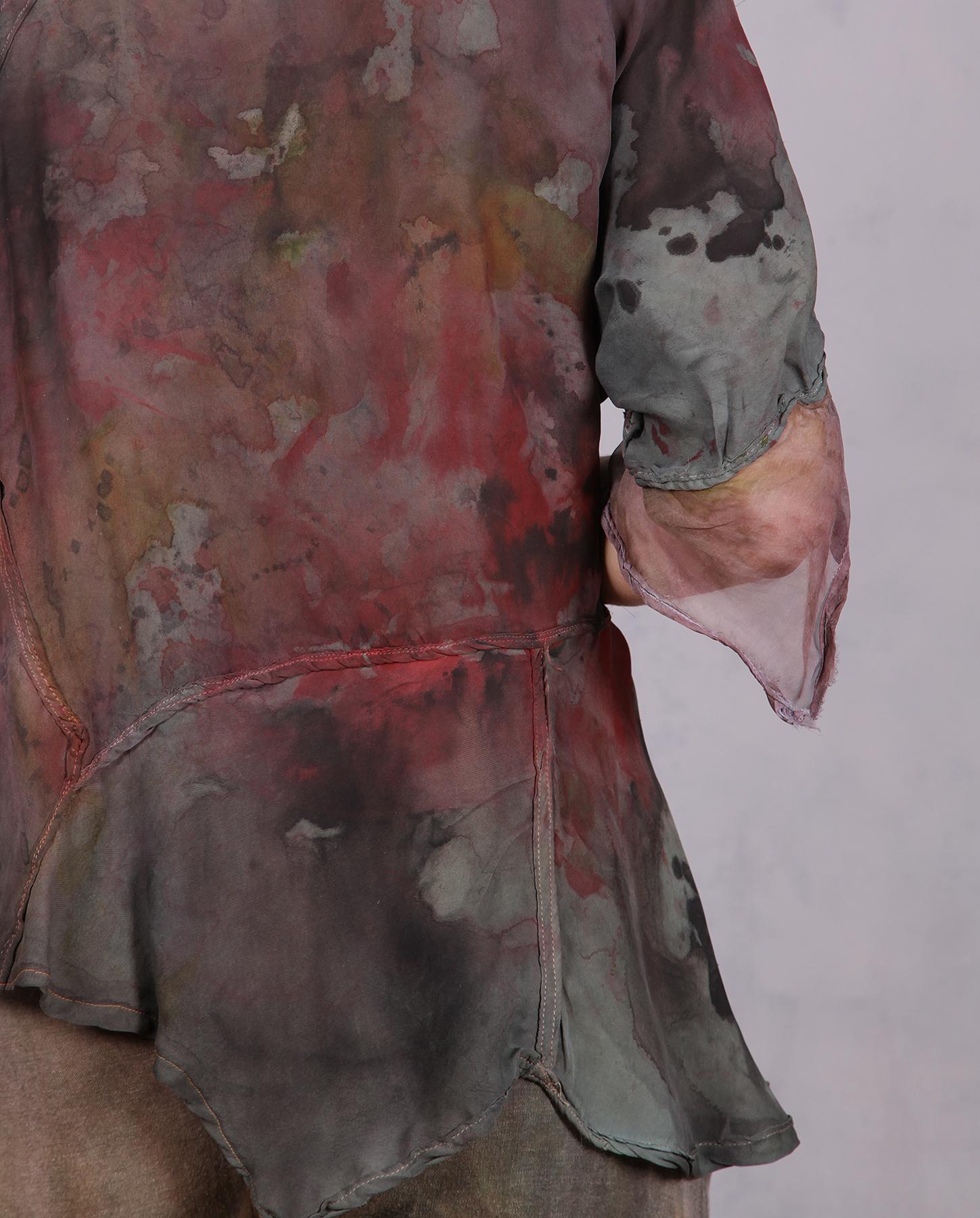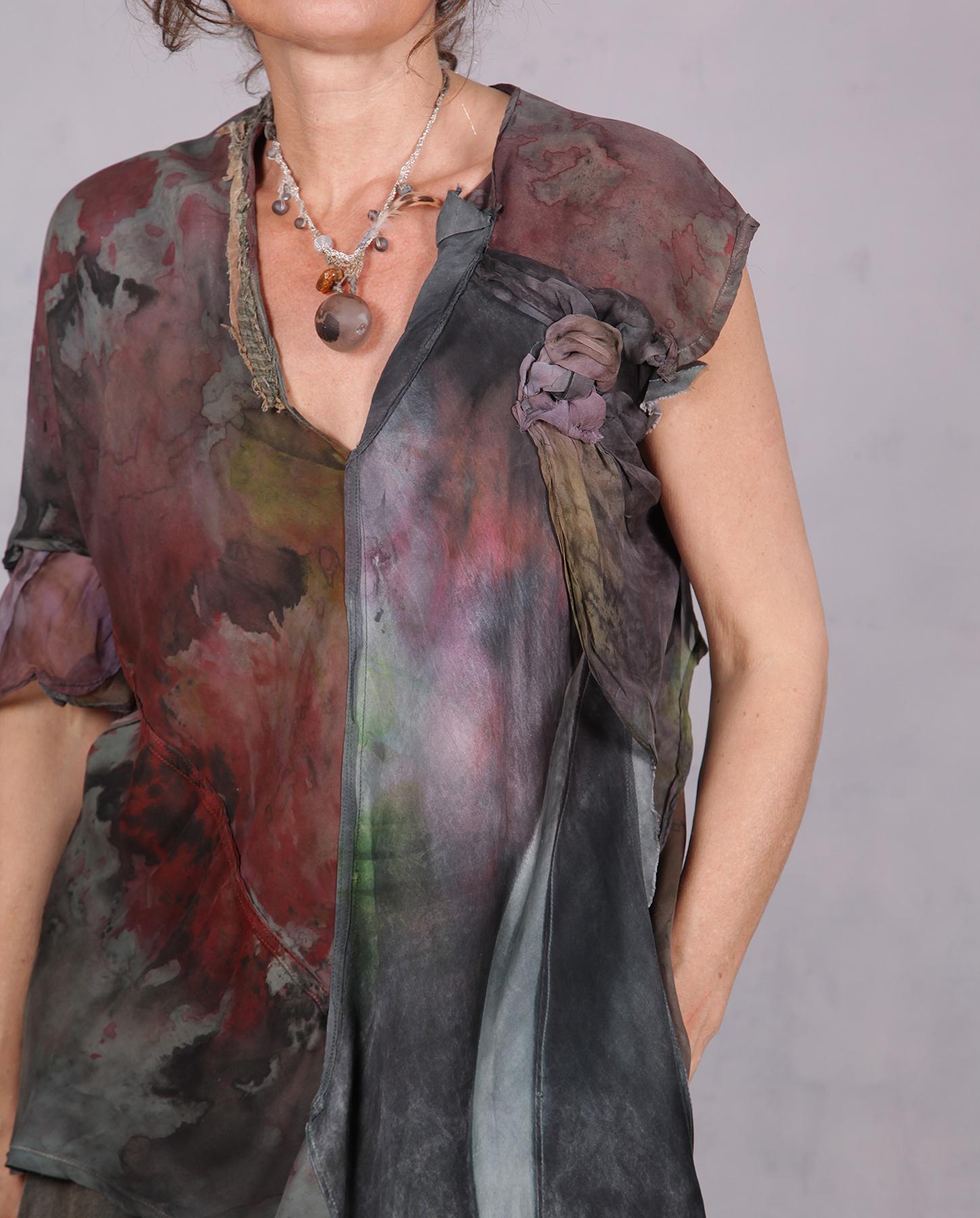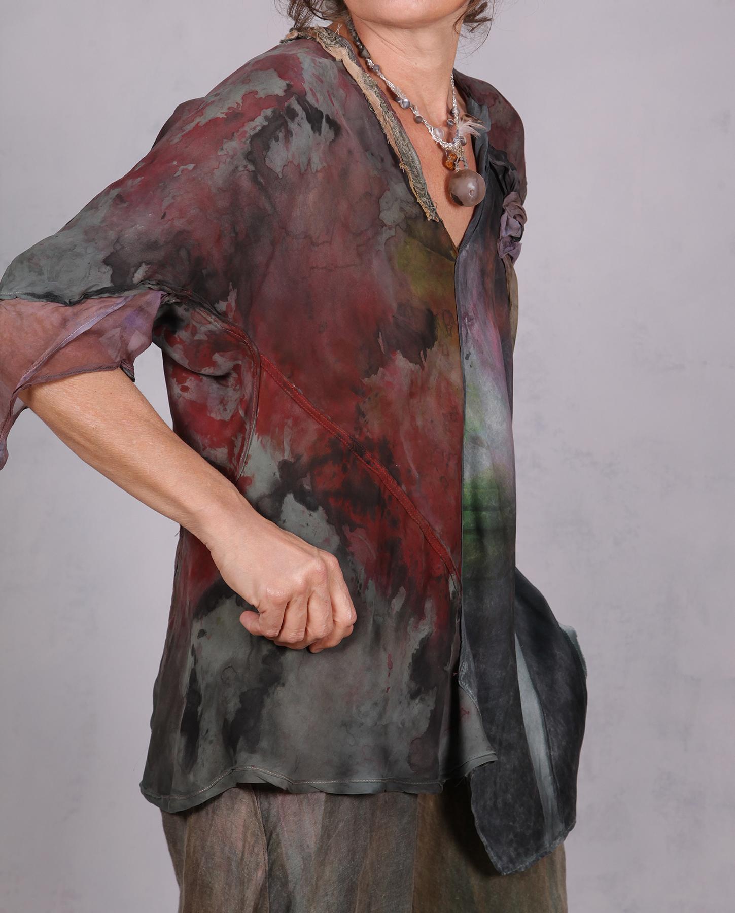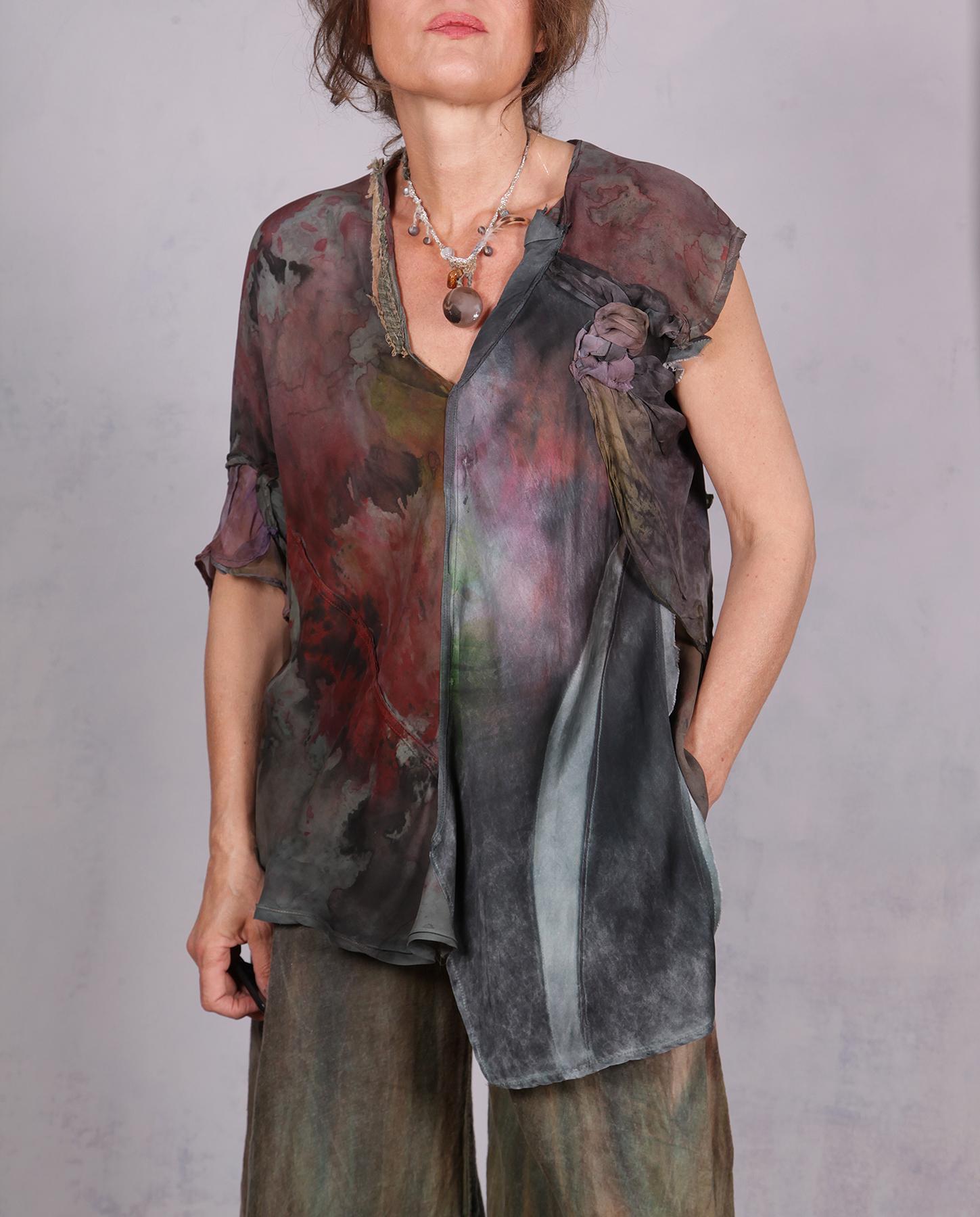 This silk top is a playful exploration of form and texture, capturing the artist’s spontaneous approach to wearable art she creates - always from the feel of the moment. The design is grounded in a rich, earthy palette—shades of moss, terracotta, and deep slate—that feels like an abstract landscape brought to life on fabric. Its asymmetrical silhouette is defined by a fluid bias construction, allowing the garment to skim the body with an effortless, feminine grace while maintaining a sharp, modern edge. It features a mix of silk varieties, most notably in the mismatched sleeves, which utilize different weights and lengths to create a sense of balanced disorder. In the back, the hem tapers into soft, petal-like curves, adding a delicate, organic touch to the more structured, deconstructed front. The knotted rosette on the shoulder is made out of hand-painted soft silk and is a wonderful 3D accent to the overall piece. Product code: B2867