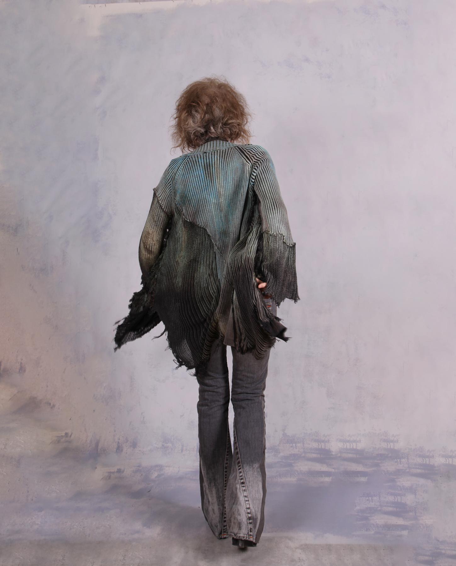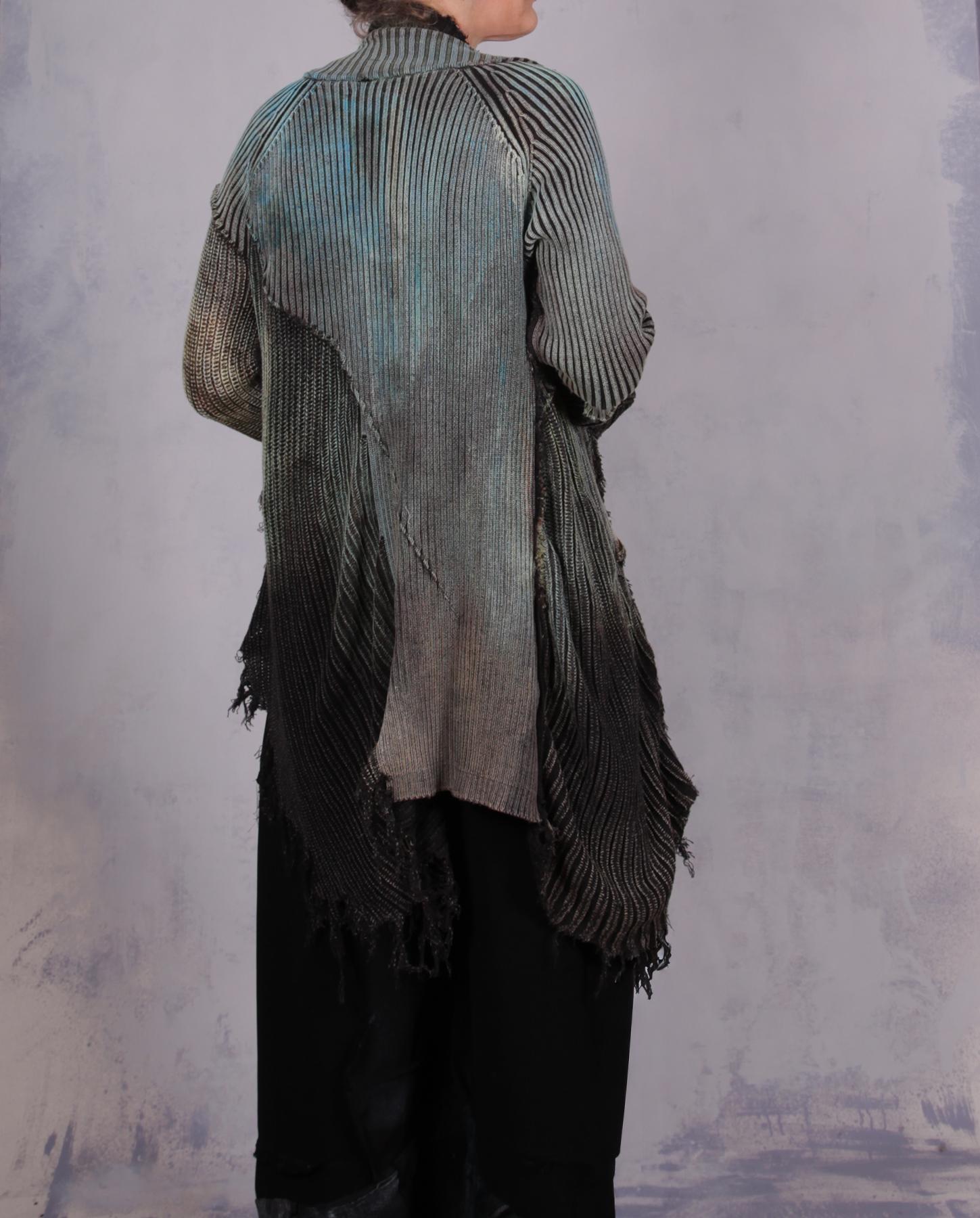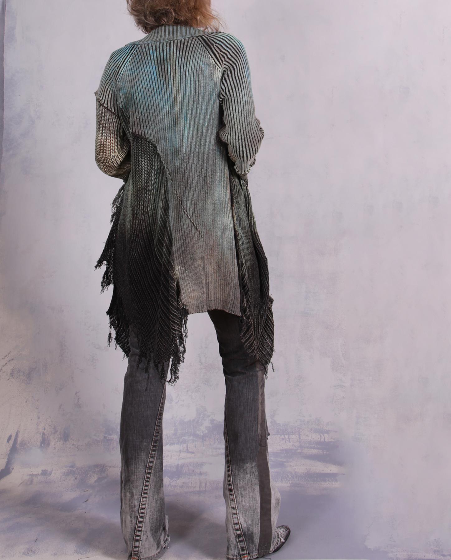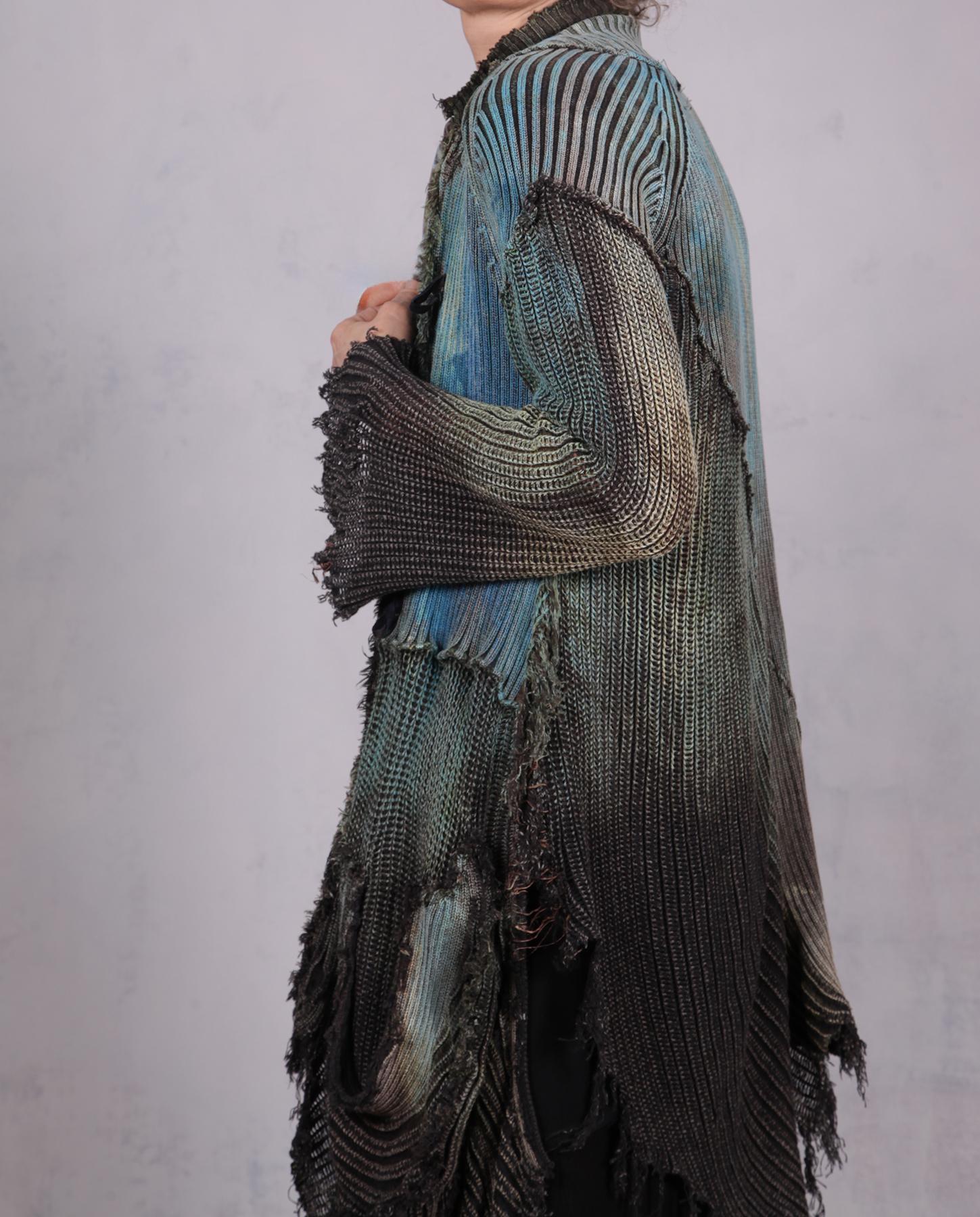 A recognizable signature knit from the artist - a highly detailed, distressed, hand-painted with unusual lines and raw edging - this cardigan is an ultimate wrap-around for when you need to be cuddled. Heavier cotton gives it a nice weight, while the overall style and detailing have an ultramodern, artistic, expressive feel. Great worn open or buttoned-up, over tank tops, dresses or with skirt or pants/jeans. It has quite a bit of stretch for an easier fit, and will work for a variety of sizes depending on your preference of how much you want it to hug you when buttoned up. Shown here on size small, 5'5". The closure is a multiple-button loop type, with more buttons going down the side without loops, just. for the look. the scoop pocket adds a wonderful depth to this piece, too. Product code: L0630