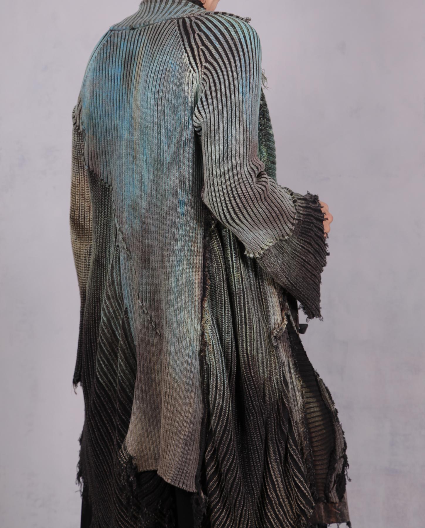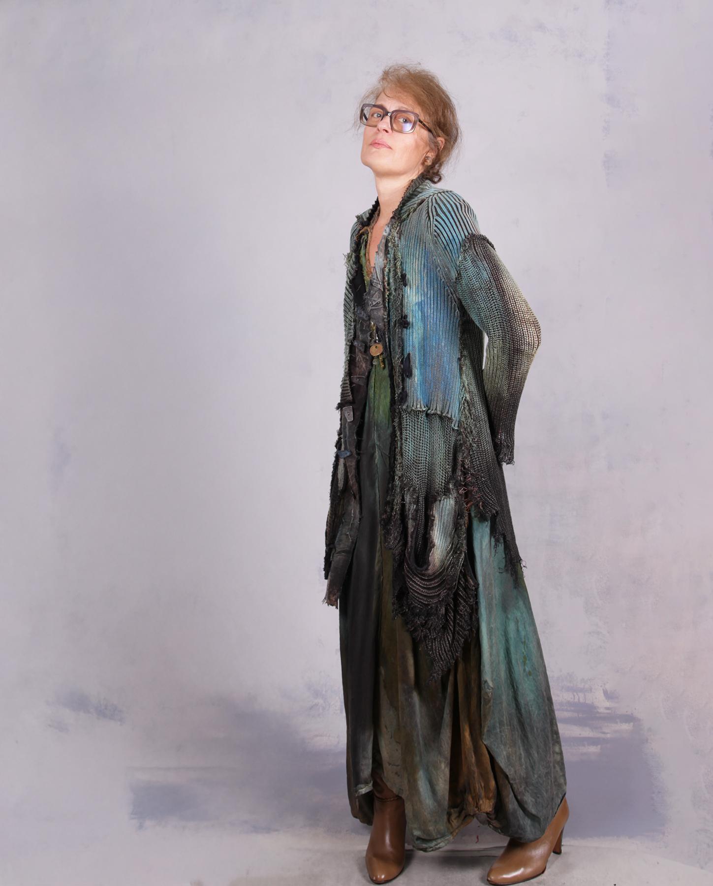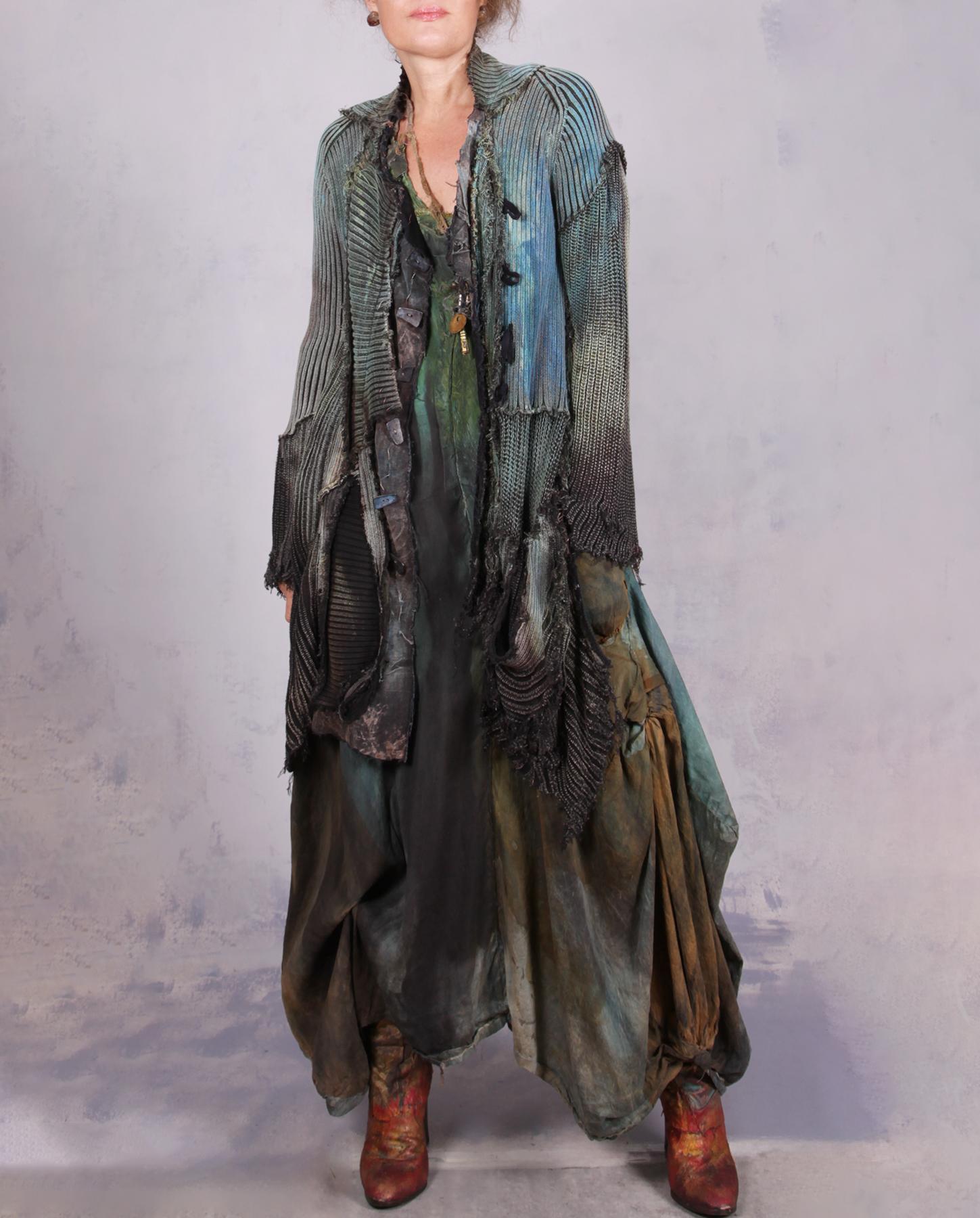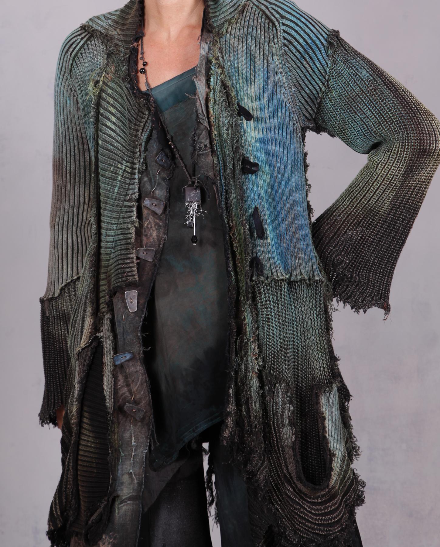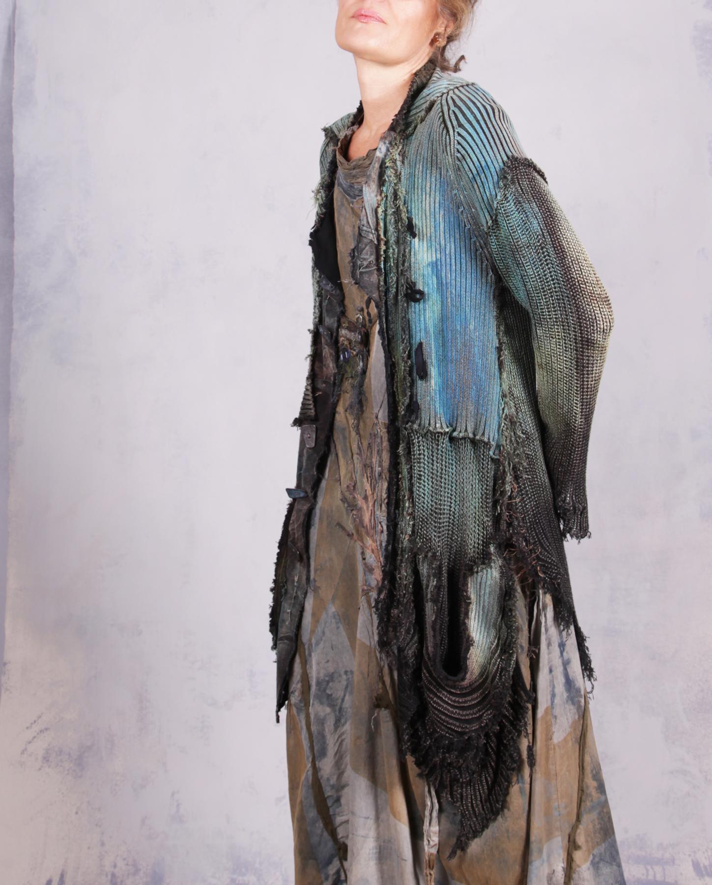 A recognizable signature knit from the artist - a highly detailed, distressed, hand-painted with unusual lines and raw edging - this cardigan is an ultimate wrap-around for when you need to be cuddled. Heavier cotton gives it a nice weight, while the overall style and detailing have an ultramodern, artistic, expressive feel. Great worn open or buttoned-up, over tank tops, dresses or with skirt or pants/jeans. It has quite a bit of stretch for an easier fit, and will work for a variety of sizes depending on your preference of how much you want it to hug you when buttoned up. Shown here on size small, 5'5". The closure is a multiple-button loop type, with more buttons going down the side without loops, just. for the look. the scoop pocket adds a wonderful depth to this piece, too. Product code: L0630