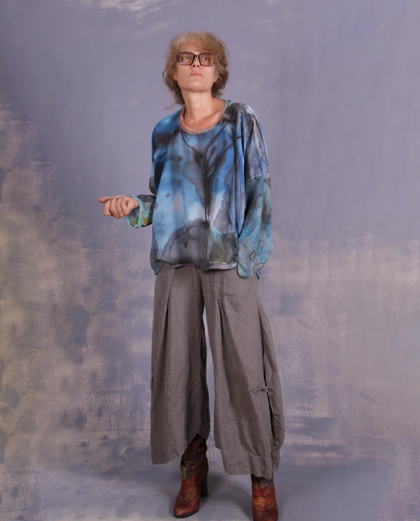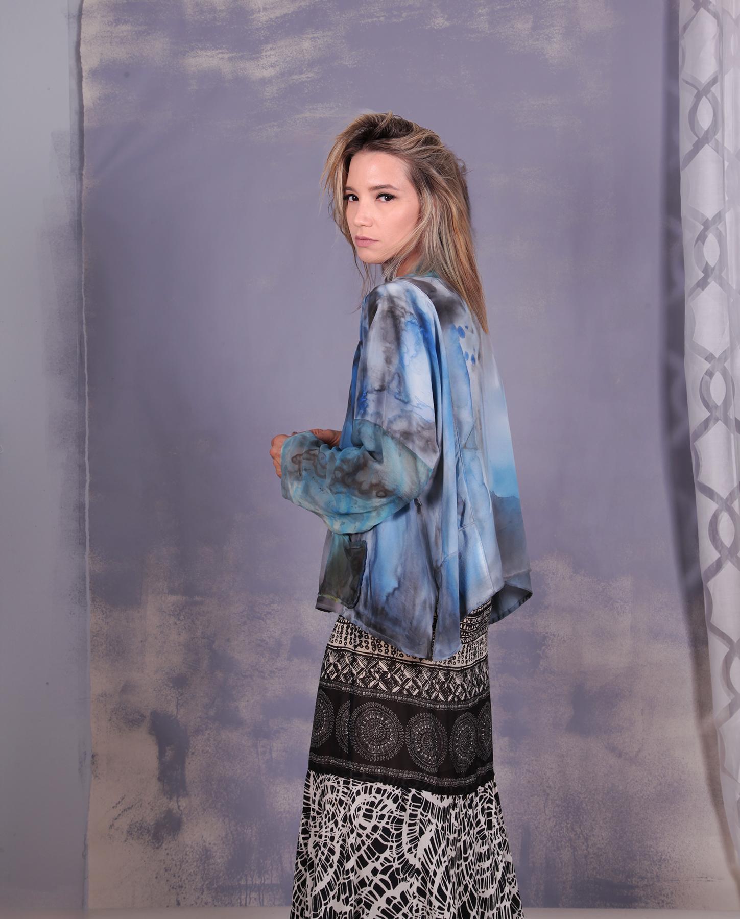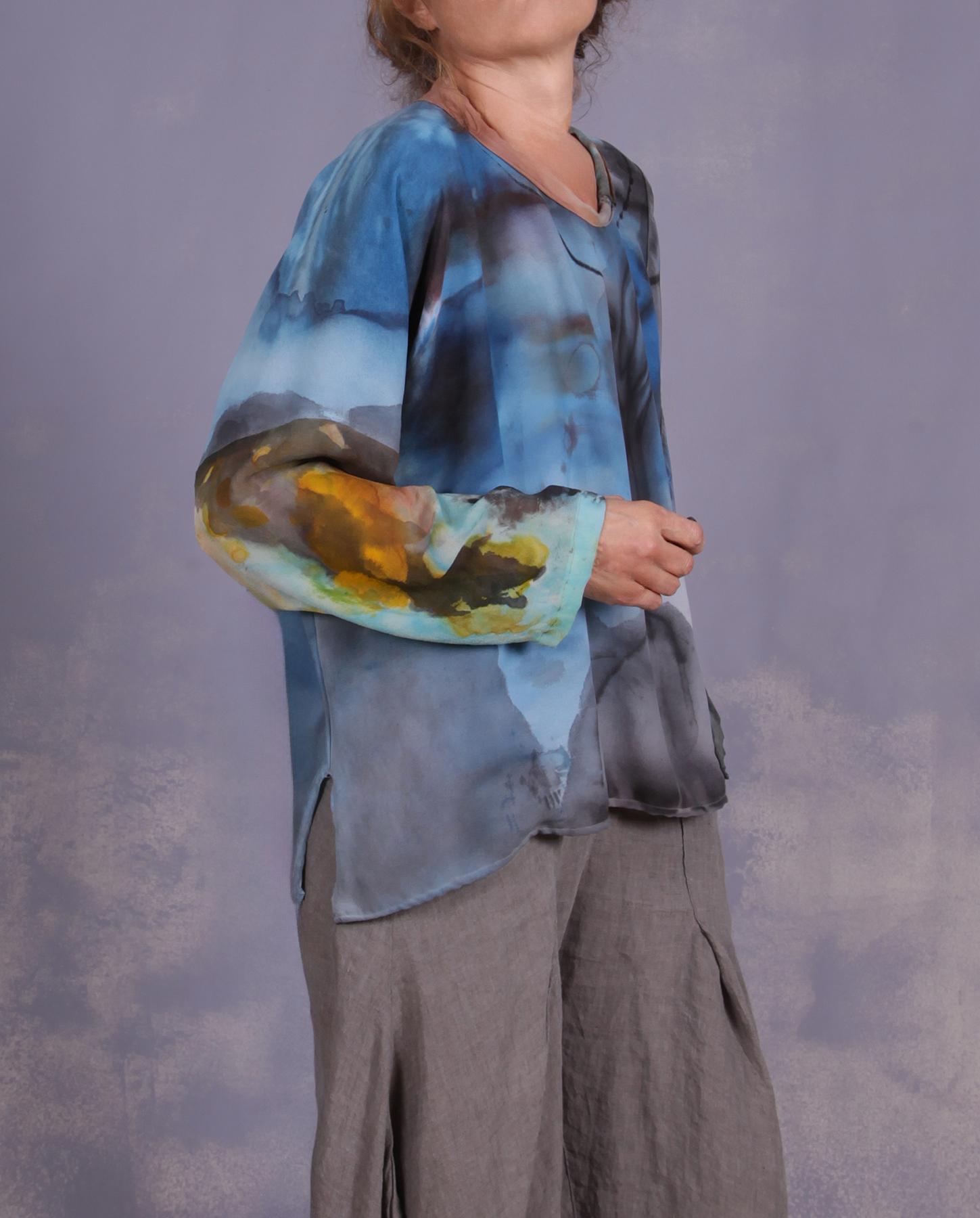 This unique blouse is roomy, with a great drape, comfortable, non-wrinkling and easy-care, hand-painted watercolor style in a dreamy way. With the sky blue as the main shade, it really is like floating in the sky! The semi-sheer sheer georgette silk of the sleeves feel wonderfully light and fluid. Dress it up or down, and the sizing is free so it will fit a variety of requirements (shown on small). Product code: K6030