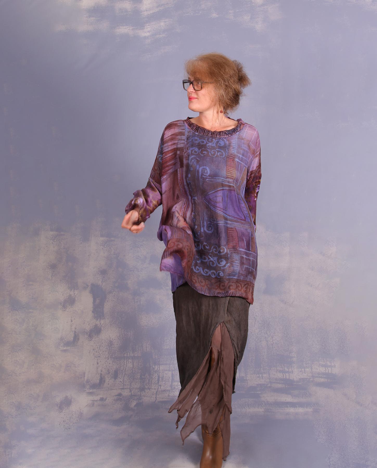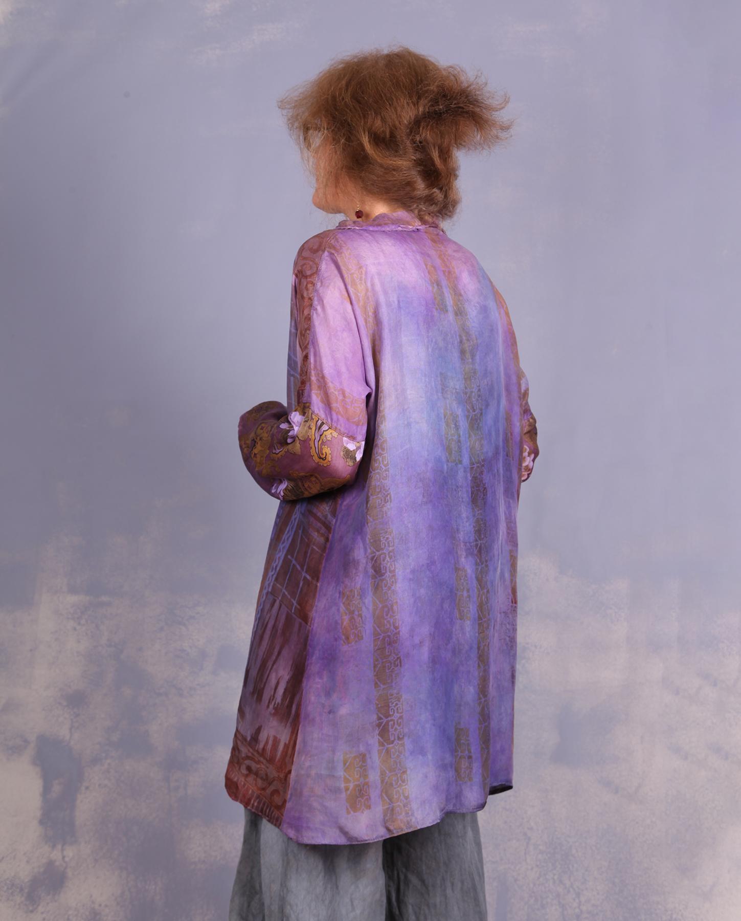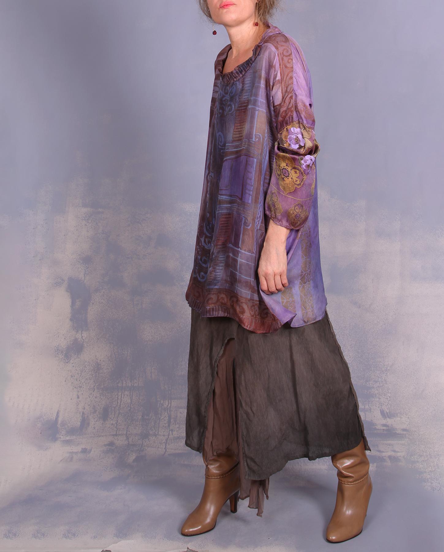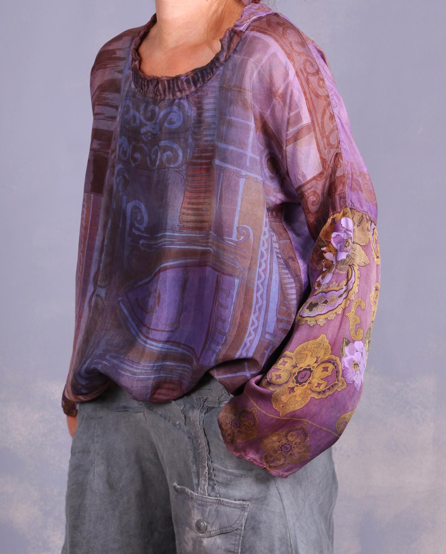 From the "Weightless Wonders" collection, featuring totally reworked antique and vintage scarves and graphic silk panels, this truly beautiful tunic is one of those pieces that is so much better in person than in any pictures - the subtle lines of distressing, the depth of colors and the different softness of its individual pieces cannot be brought across in any pictures. Made out of 3-4 different vintage scarves, including one from a museum collection, it has an interesting print in the front panel that has some Greek (or Roman) architecture, the columns are of the ionic order hence it can be either one, and intricate floral design for the sleeves that goes with the theme - all reworked for color to make sure that when combined, they make an organic whole. Roomy in its current design, it can be made smaller and shorter by request. A wonderful piece all-around you will truly enjoy. As with all light silks, it can. be made shorter by tucking in or tying on the sides or belting, as shown in some of the pictures. Product code: H0764