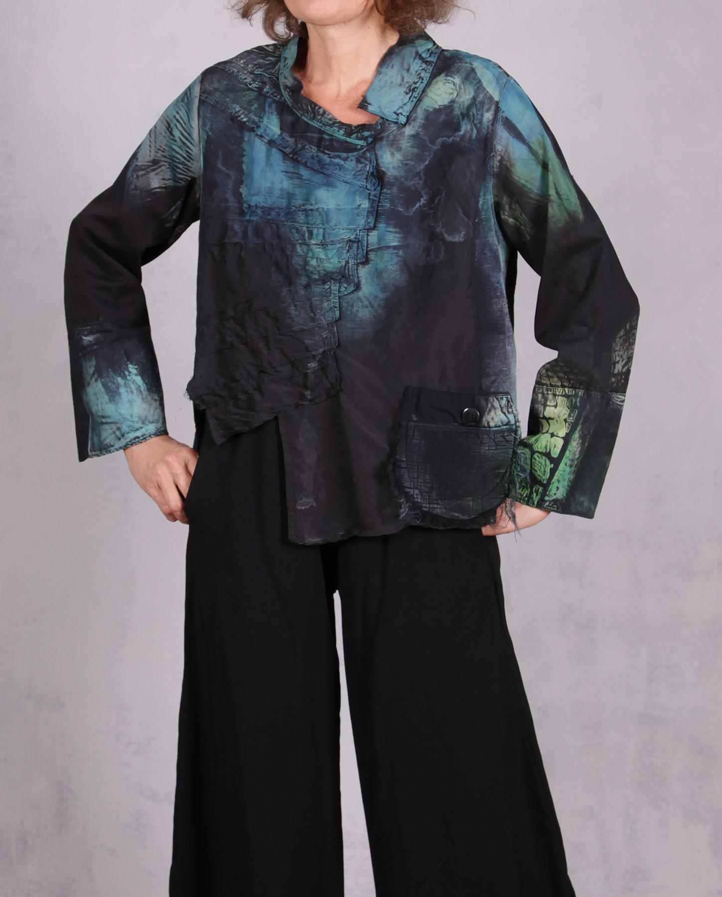 This fun top has a sculptural, asymmetrical construction that makes it stand out, along with the cool colors of nature, enhanced by the hand-printed design. Made out of silk, linen and cotton, it is breathable and perfect by itself or layered over longer pieces for added interest. Wrinkle resistant, easy-care (washable and dryable), it is a great candidate for trips and can be dressed up or down easily. Product code: I0577