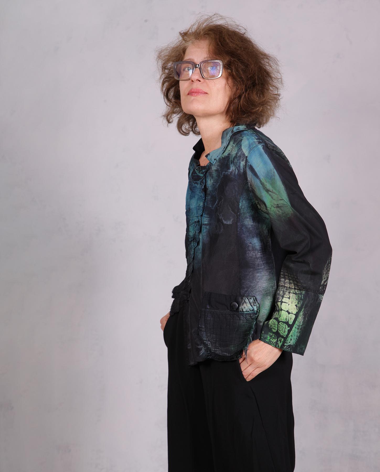 Asymmetrical, mixed fabrics, asymmetrical collar, hand-painted, hand-distressed, pocket