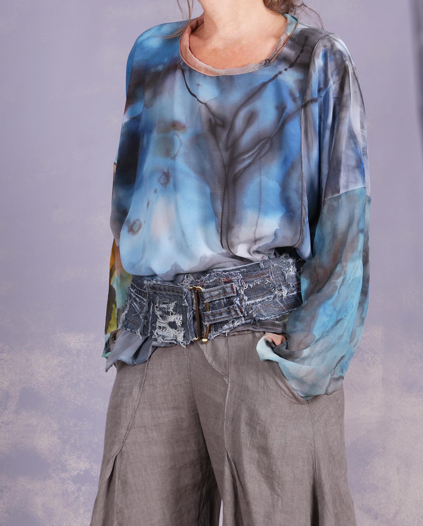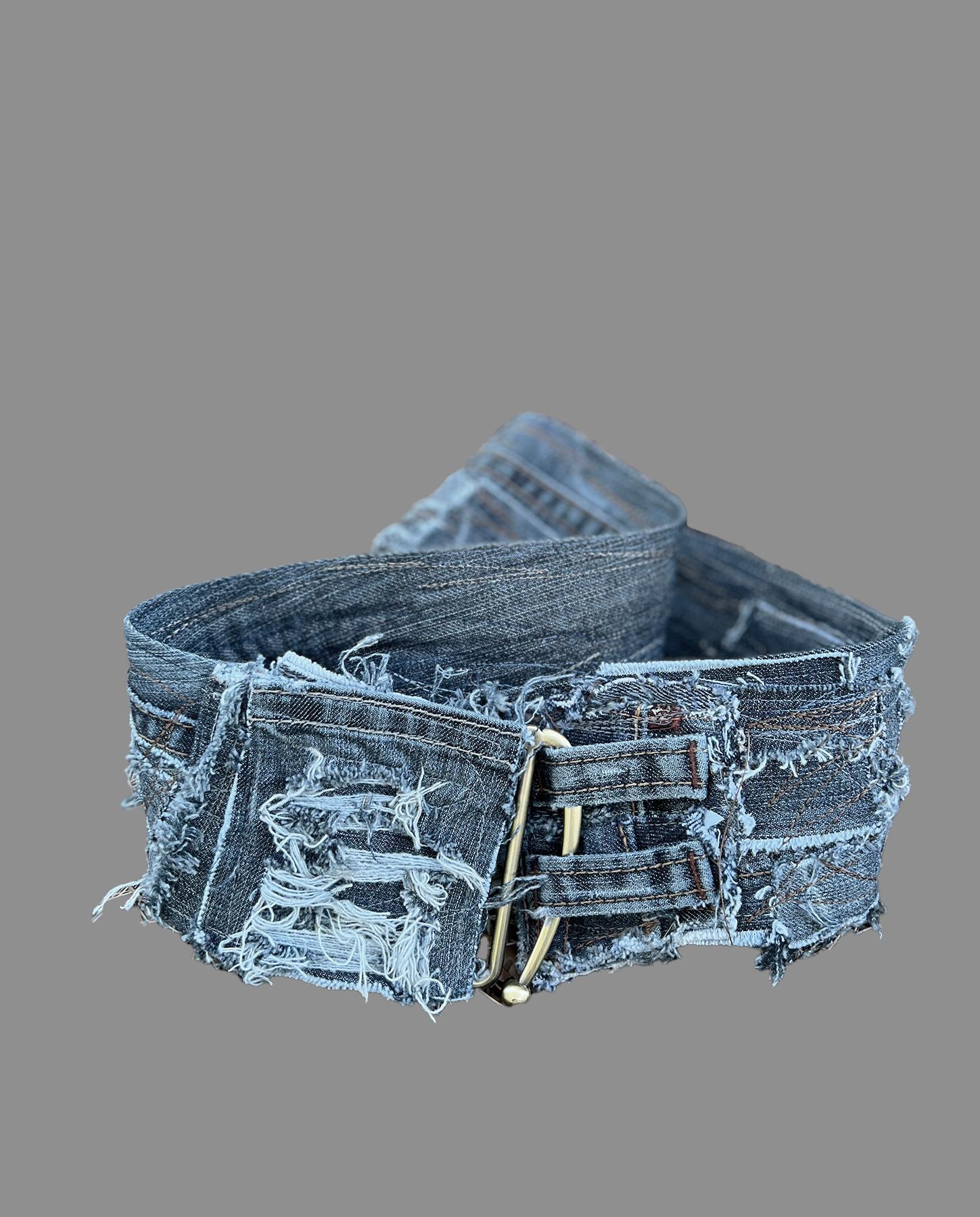 Just like the versatility of jeans, this belt, made out of recycled denim, is a perfect 'topper' for a variety of outfits. It is meant to be adjusted to the size you need, so please let us know how long you would like it to be. Can be worn on the hips or on the waist and features a rare pin-style vintage brass buckle that goes through the loops in the front for closure. Lots of raw edging throughout in the artist's well-known style. Product code: C6663