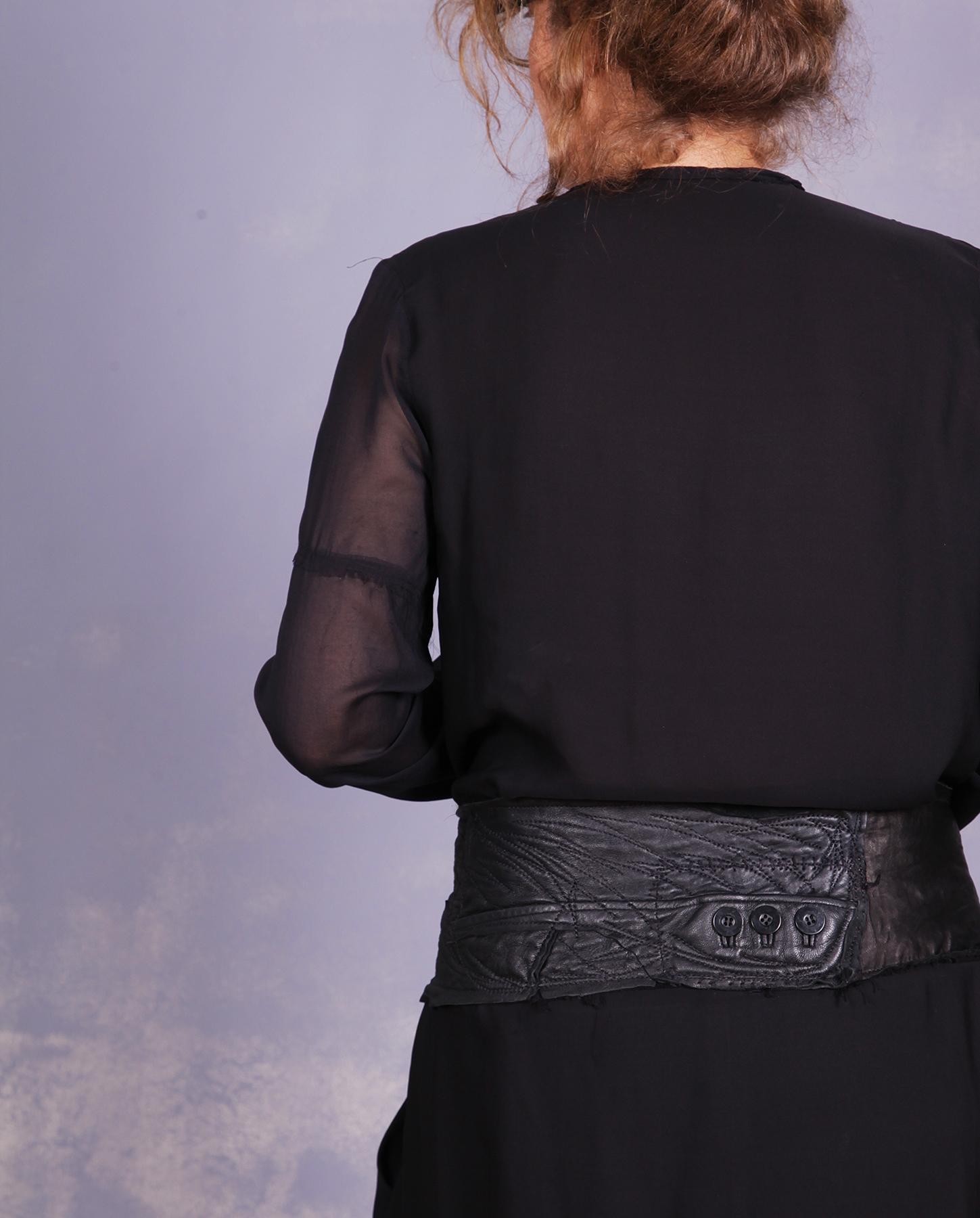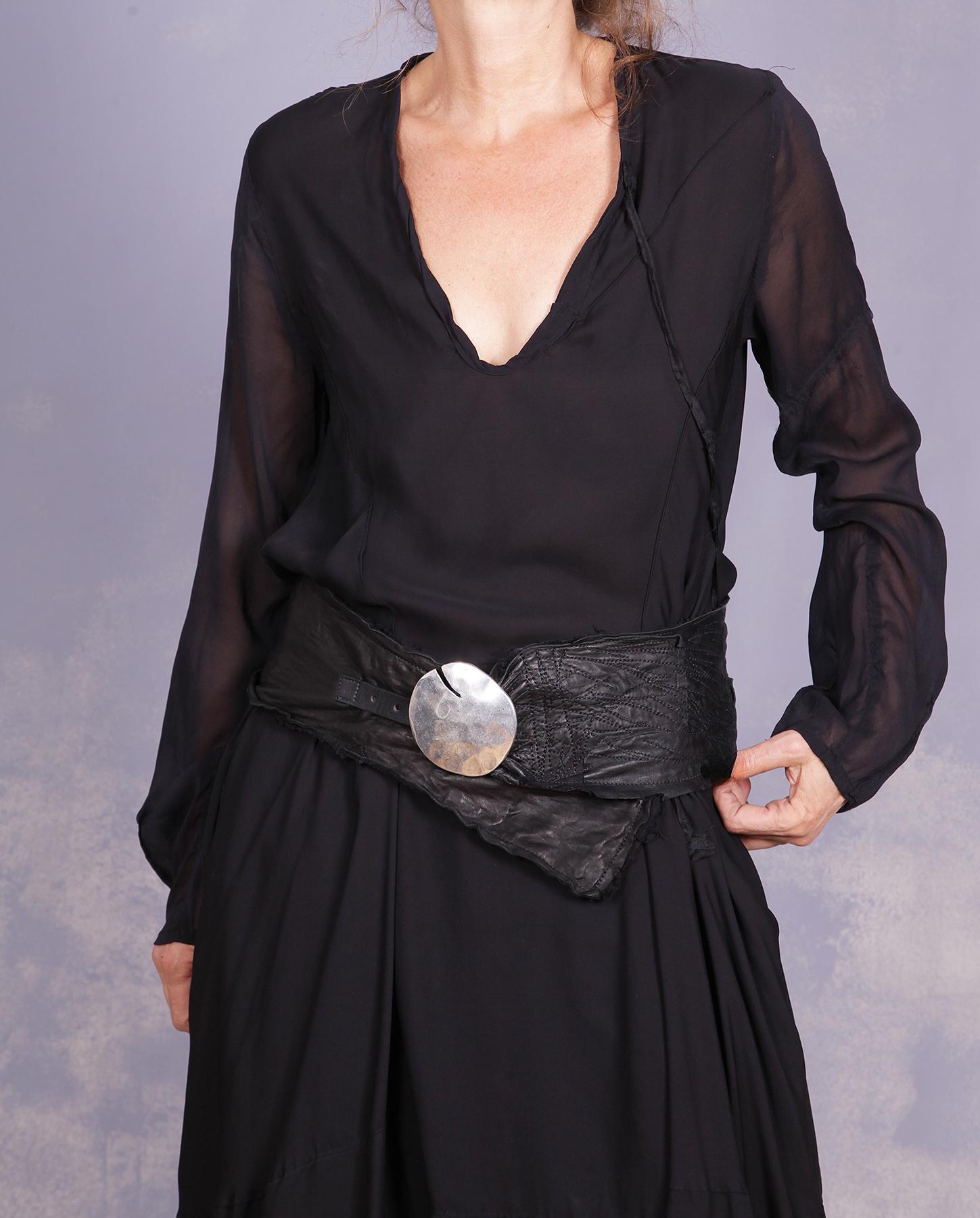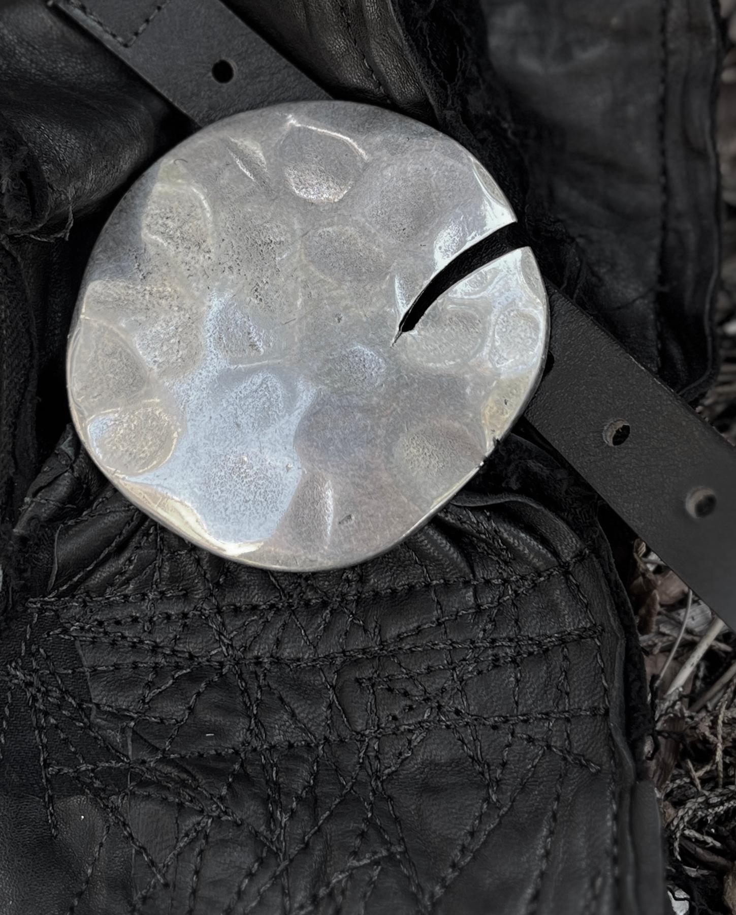 Made out of recycled Italian lambskin, this belt is pure chic, with its modern raw edging, added texture and of course a beautiful vintage silver buckle which is slightly hammered for added 3D effect, with a built-in 'crack' that truly makes it stand out. The belt is adjustable and can be worn around the hips or on the wait. Like with all the belts, it is meant to be customized to your general size so please let us know so that we can fix it the right way for you. A little surprise in back looks like a tiny pocket. with buttons - a whimsical, fun touch. The belt is soft and flexible, with black cotton denim as backing. Product code: E6153