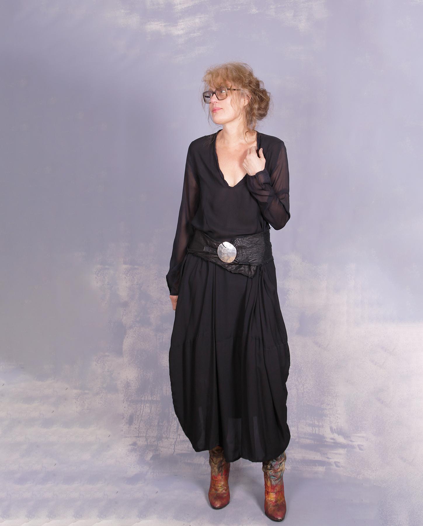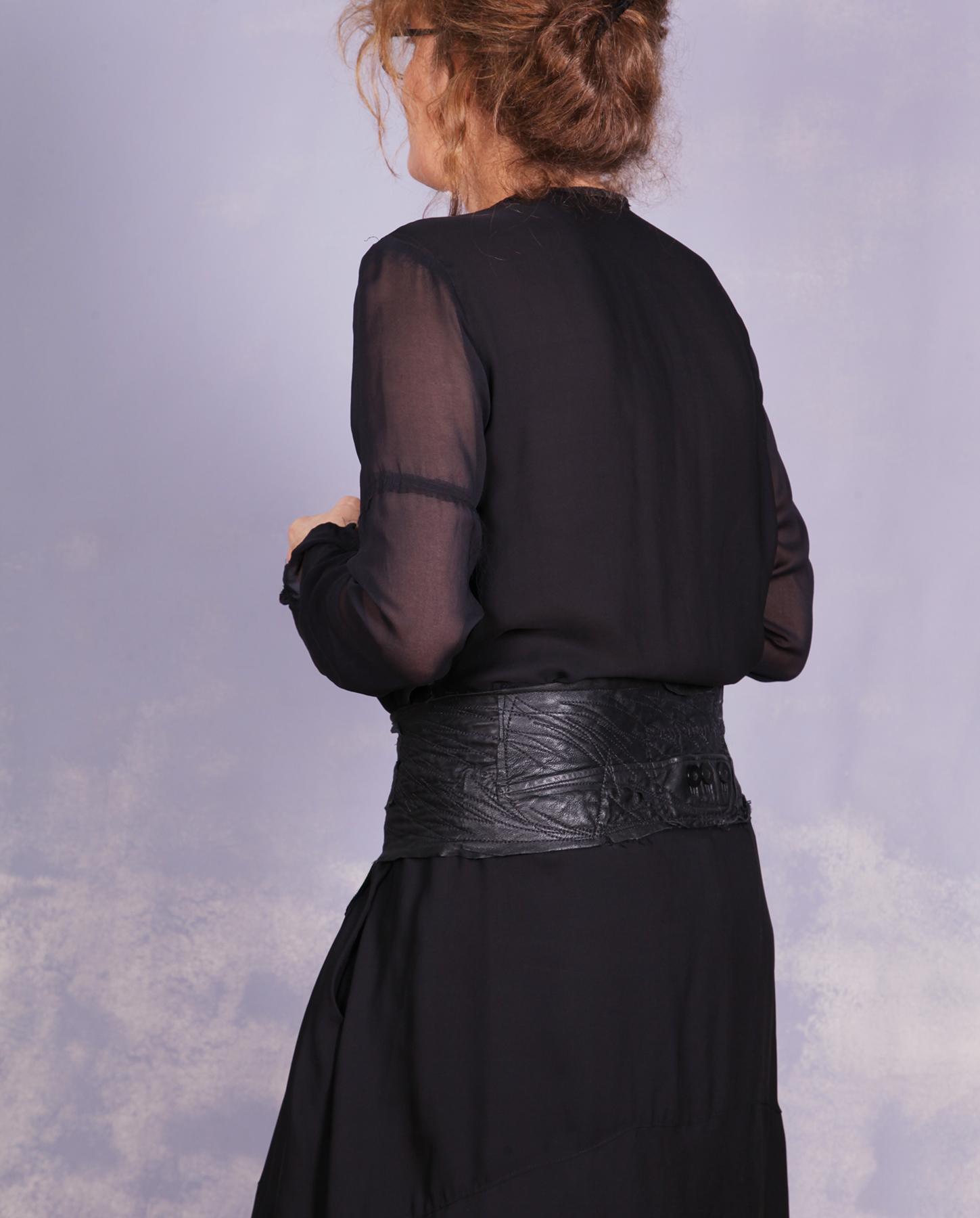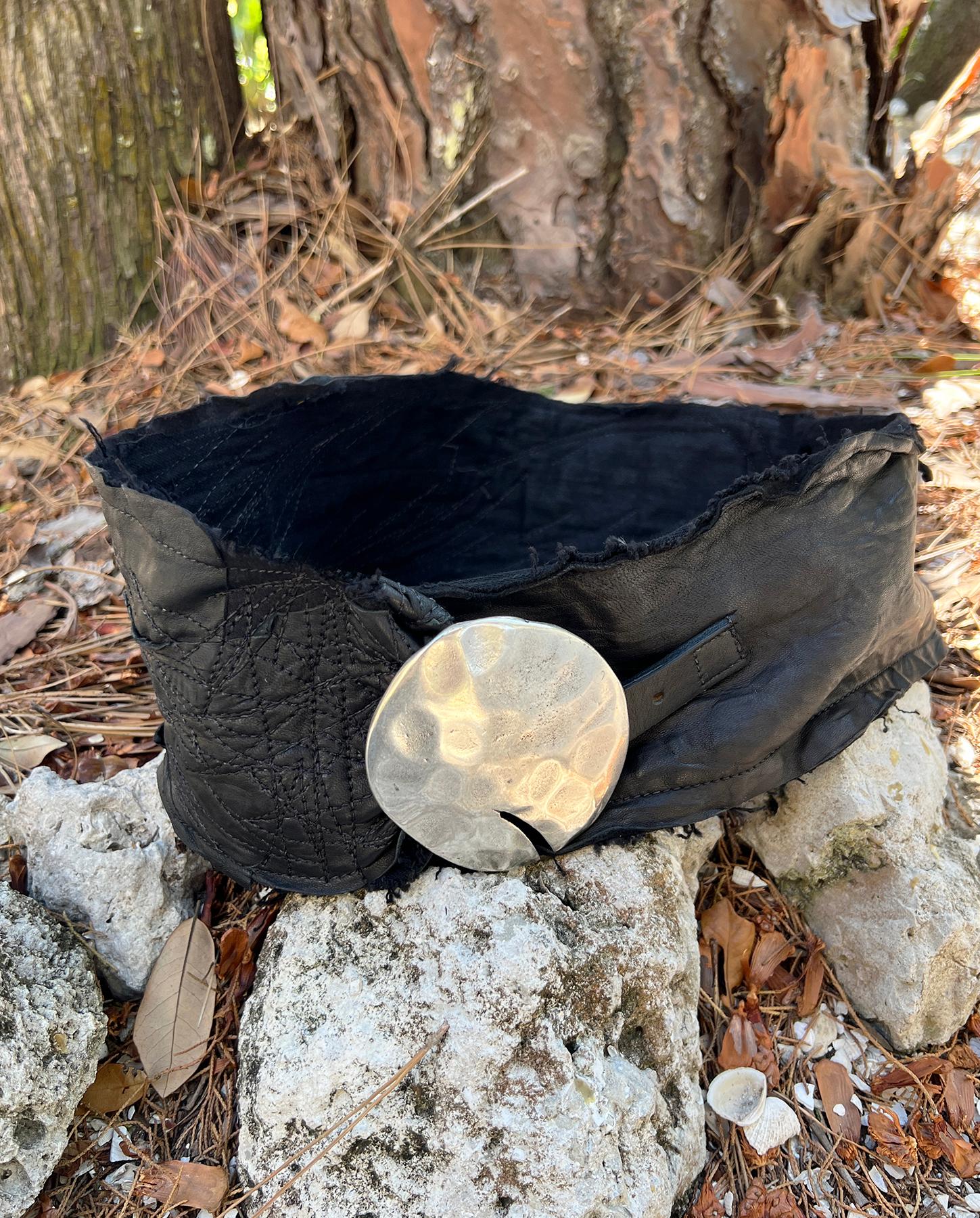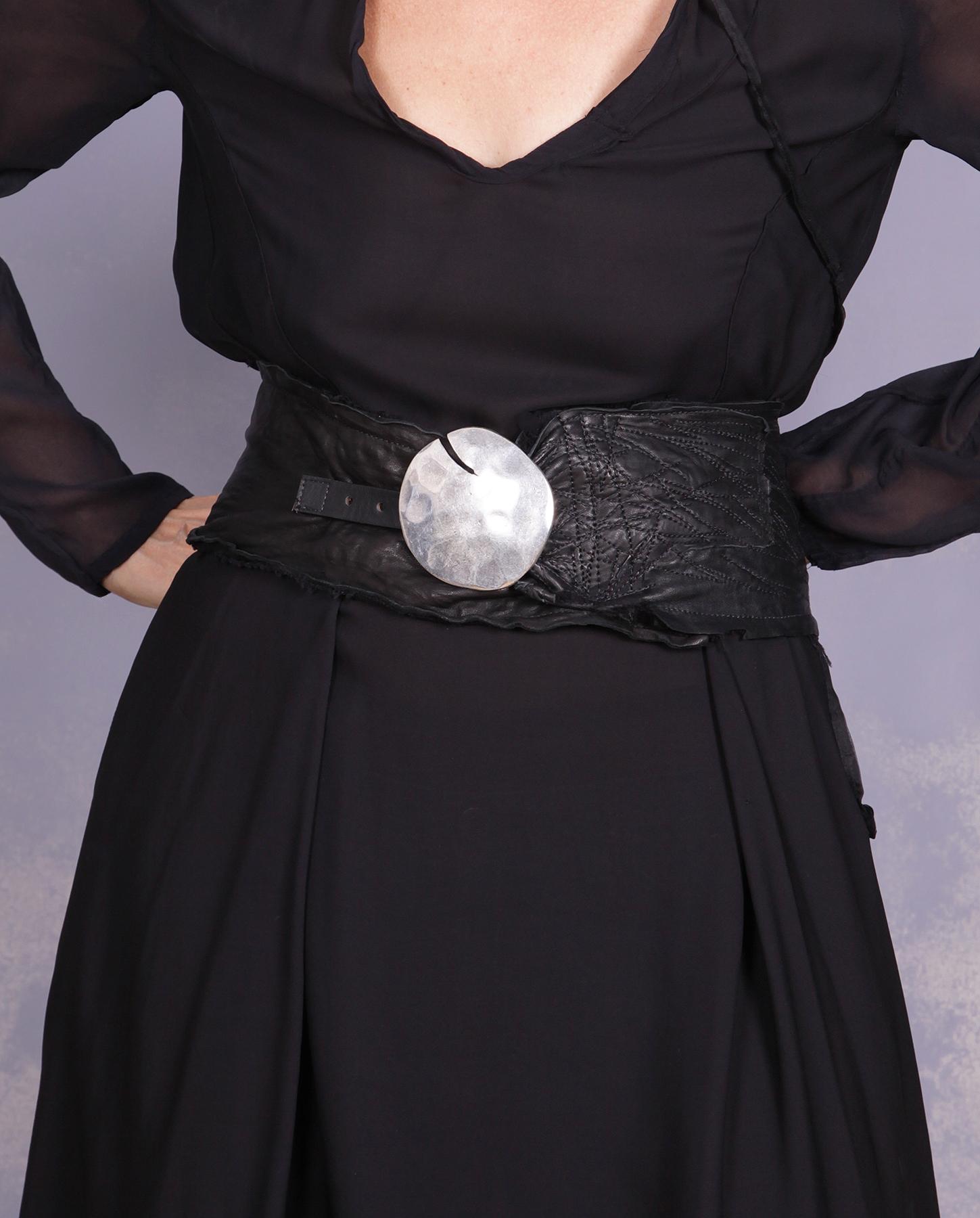 Made out of recycled Italian lambskin, this belt is pure chic, with its modern raw edging, added texture and of course a beautiful vintage silver buckle which is slightly hammered for added 3D effect, with a built-in 'crack' that truly makes it stand out. The belt is adjustable and can be worn around the hips or on the wait. Like with all the belts, it is meant to be customized to your general size so please let us know so that we can fix it the right way for you. A little surprise in back looks like a tiny pocket. with buttons - a whimsical, fun touch. The belt is soft and flexible, with black cotton denim as backing. Product code: E6153