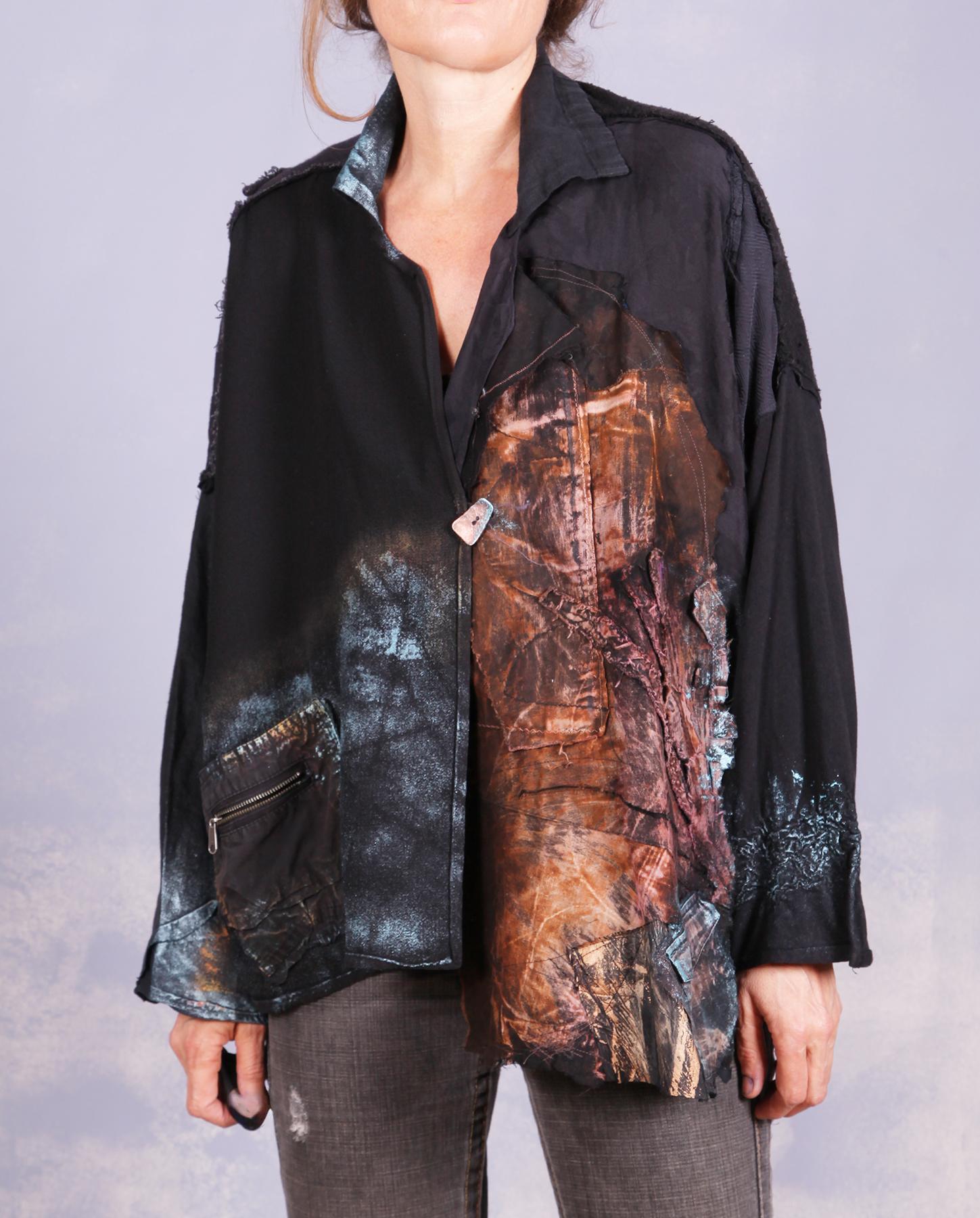 Asymmetrical, drop shoulder, mixed fabrics, hand-painted, distressed, raw edging.