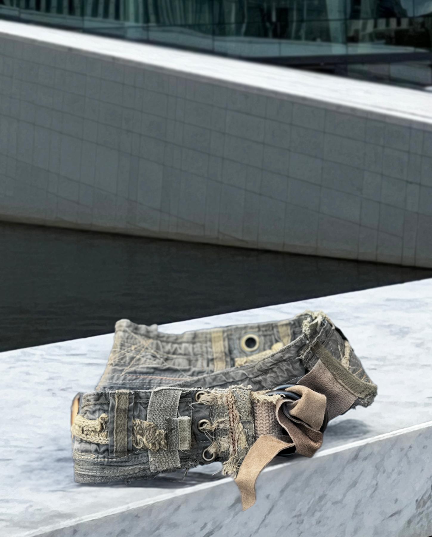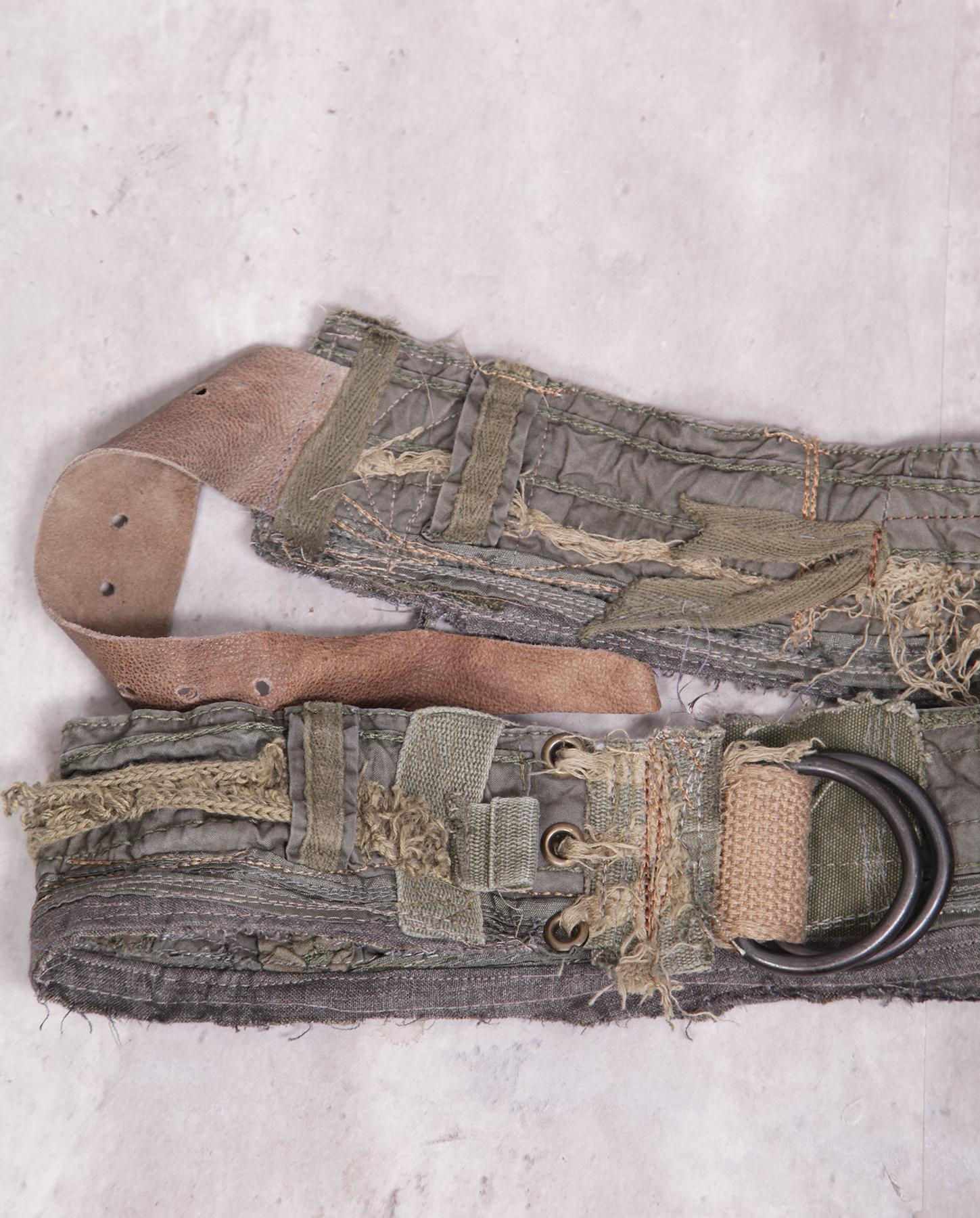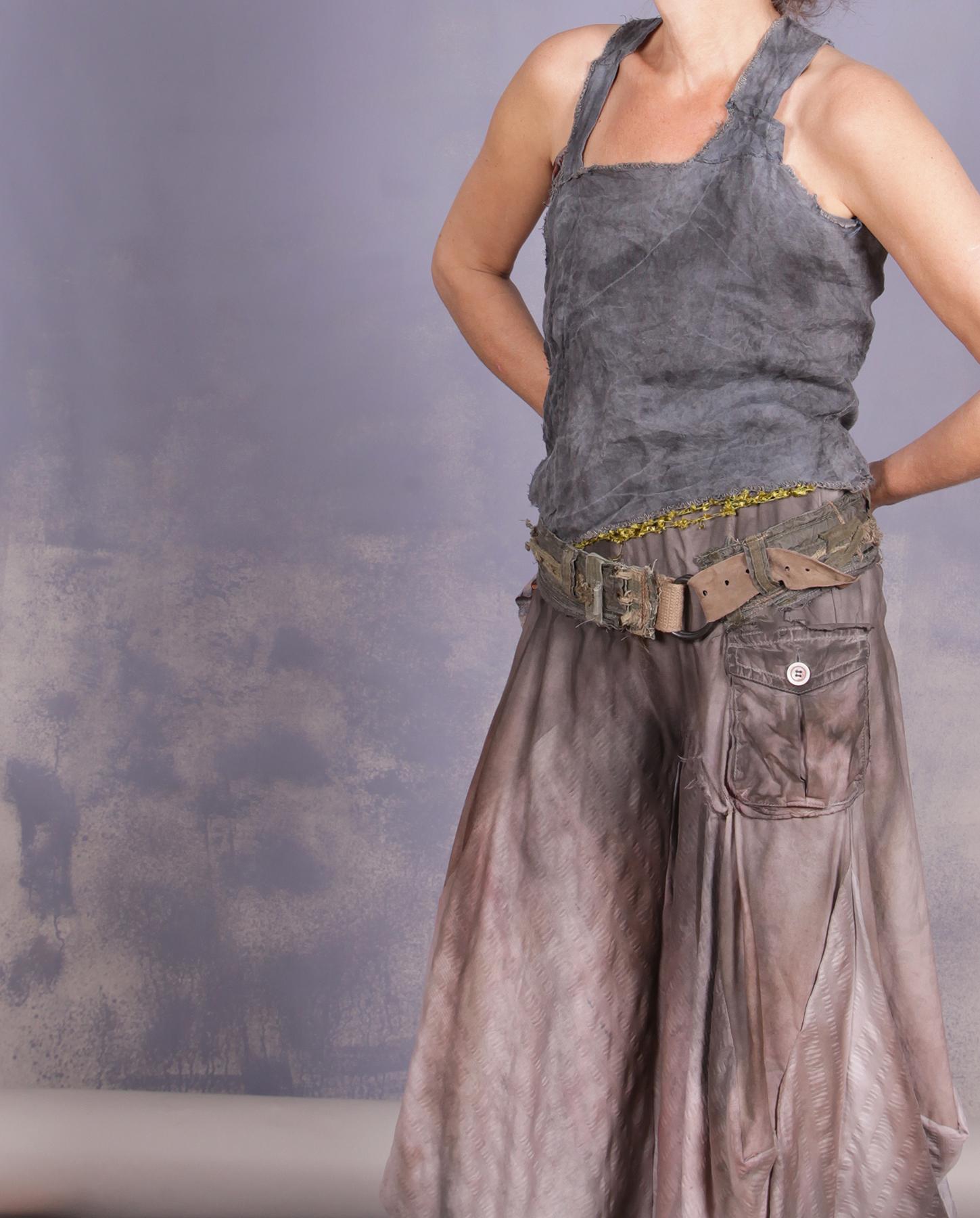 This artisanal belt mimics the top of pants where you actually put a belt through the loops, a tongue-in-cheek creation by the artist. The belt is soft and flexible and has lots of detailing, including usable loops, so if you are so inclined, you can put another skinny belt through for an extra touch (ask for available options if you are interested). It is adjustable with the leather strap and can be worn on the hips or on the waist. You can also fix it in place by just wrapping around the two metal rings vs. using snaps. Like most of the belts, it can be either extended or shortened to your desired range for length, depending on how you intend to wear it and what you size is. As-shown measurements are provided below. Product code: P5642