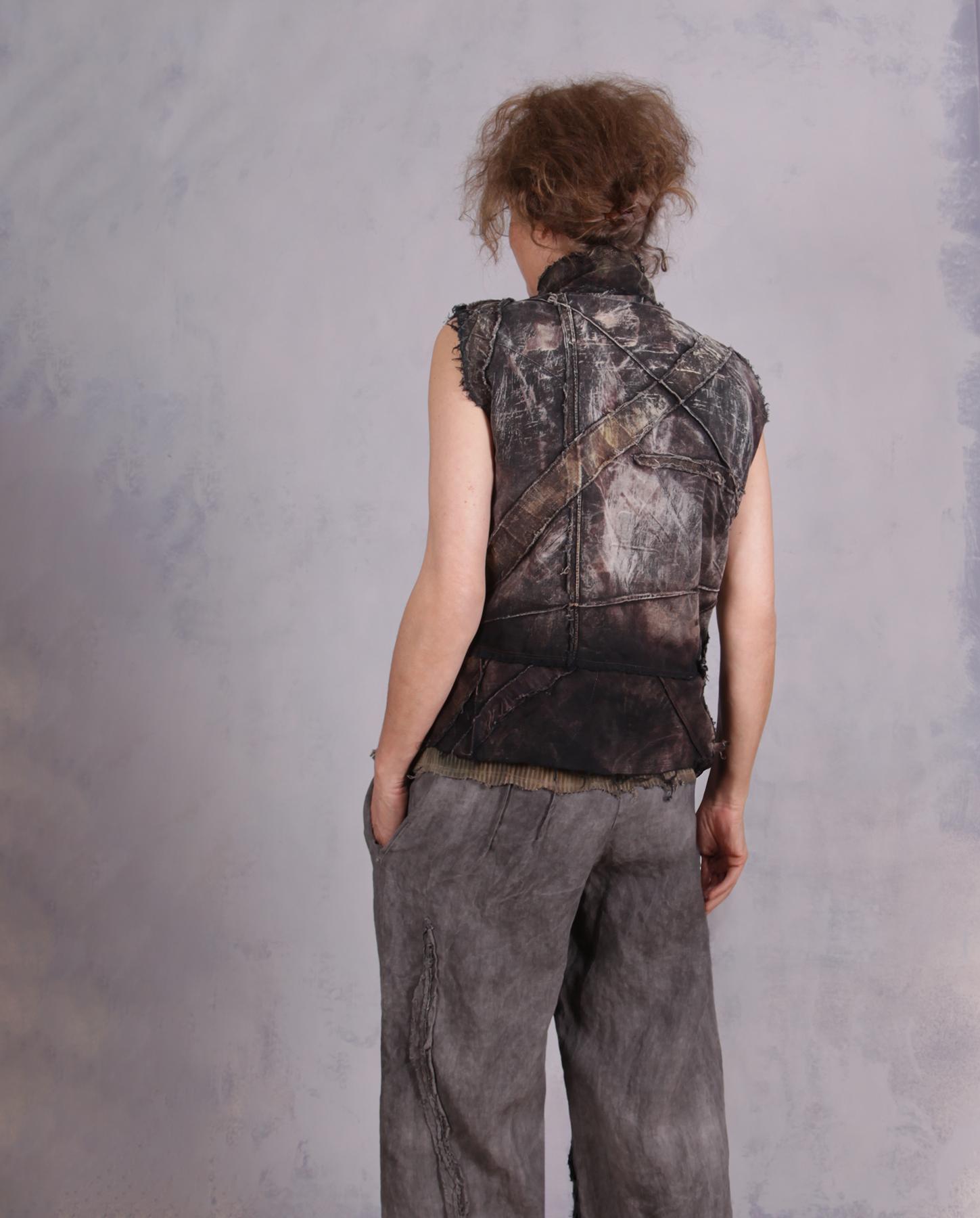 This asymmetrical art piece to wear is made out of several types of cotton, light and medium weight mixed in, to create a perfect weight top layer you can wear with many different outfits and looks. There is a lot of surface texture added by hand, followed by signature distressing that produced a multitude of shade variations. On the side there are two stacked 'pockets' (one is a small pocket, the other one is a faux one) with matching fabric buttons for a cool modern touch. The vest can also be worn as a top, if you would like us to put additional closure in for that, let us know. Fun and versatile, easy-care and non-wrinkling, a great top layer to take with you on trips as well! Product code: V3014
