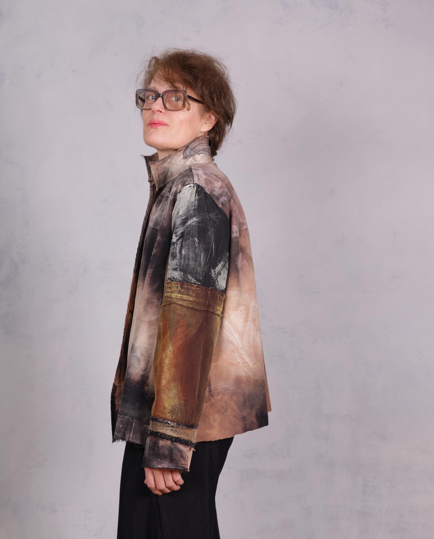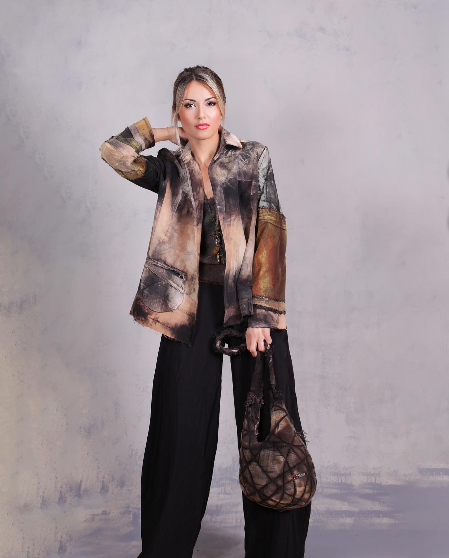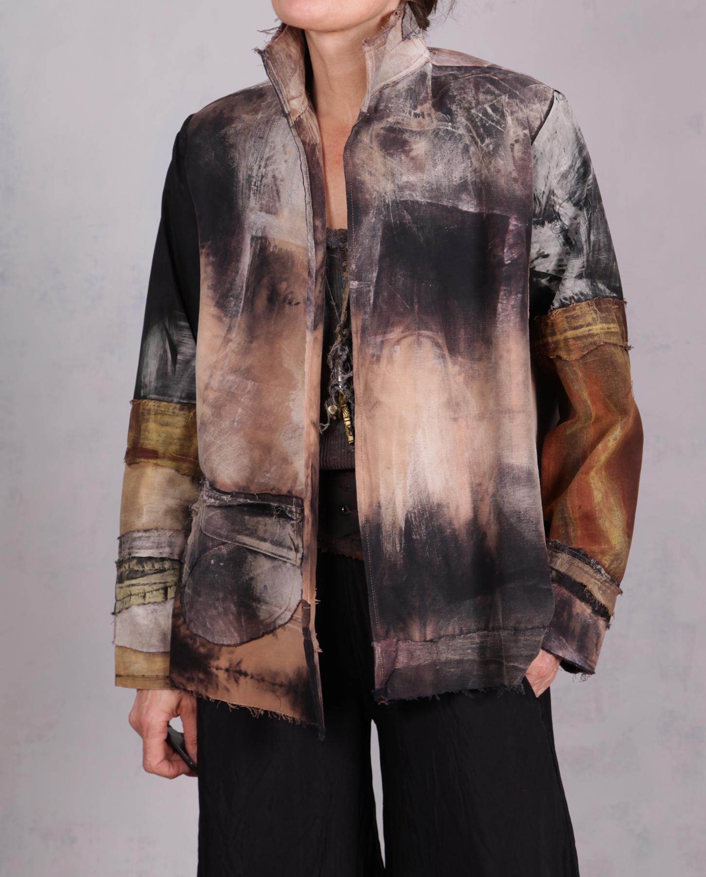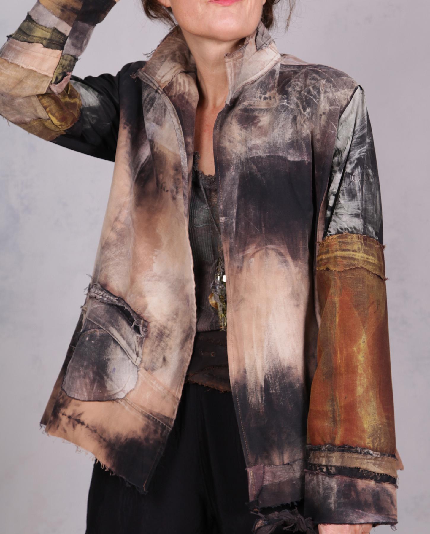 This artistic creation is an ode to neutrals, bringing out the depth of natural shades to the max in an overall lightweight, comfortable, one-size jacket that is perfect for everyday, evening and definitely travel. It is like a modern abstract painting-to-wear. Made out of mixed cottons, it is soft and comfortable and is meant to fit a variety of sizes from small (shown) to XL. Doesn't currently have a closure but it can be put in upon request. As with most distressed pieces made by the artist, what you see was originally all black, with the current shades produced through a complex process of hand-distressing, color removal and painting. The main material is sanded/brushed cotton, so it is pleasantly soft to the touch. Very wrinkle resistant, if not wrinkle proof, it is perfect to take along in a suitcase to any destination where you want to stand out from the crowd. Product code: X2978