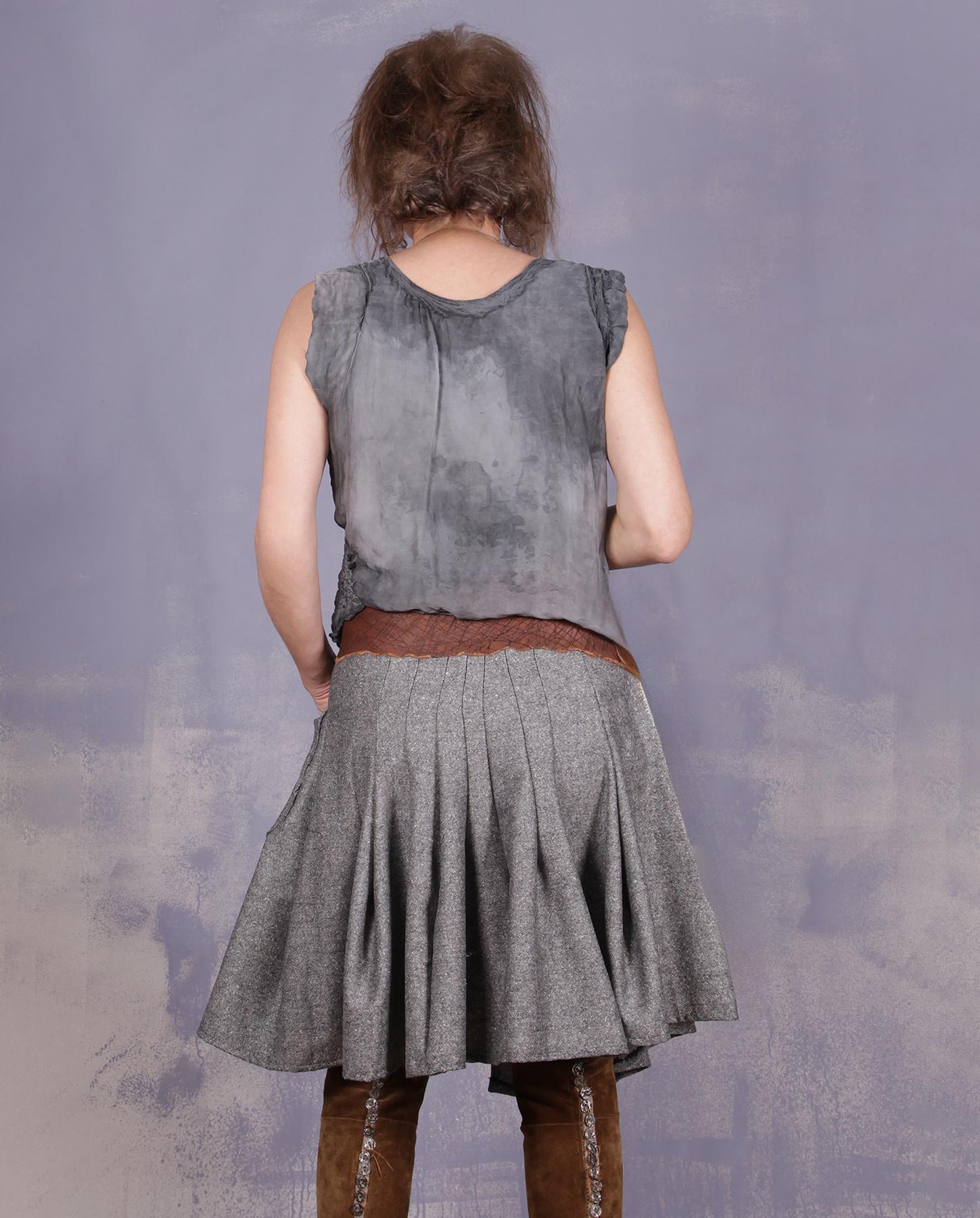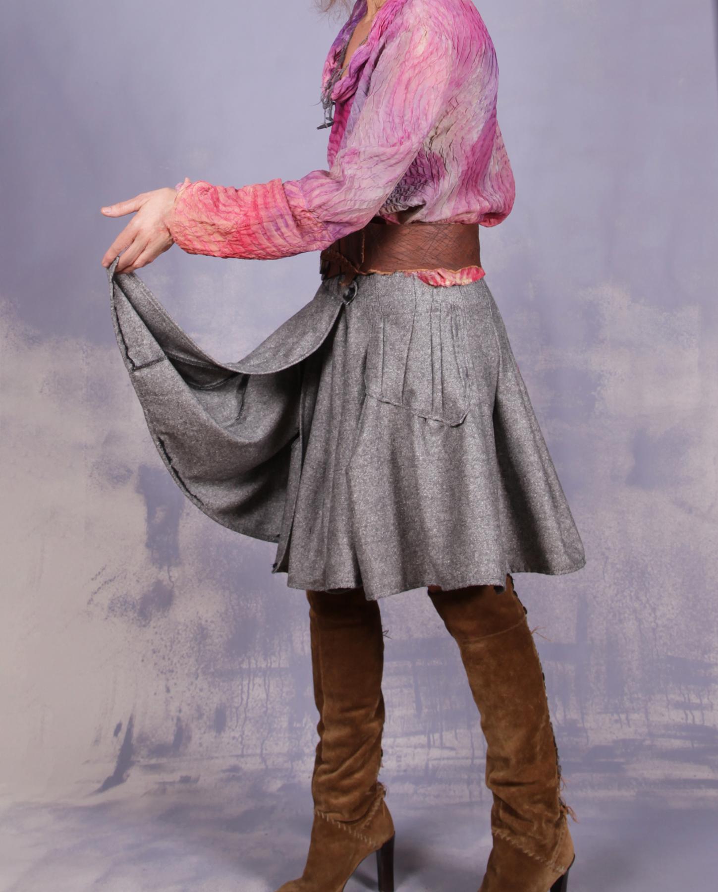 So much fun to wear, you will want to twist and twirl! This skirt is an asymmetrical wrap style, with elastic waist, so the fit adjustment is easy (see what it is set for in the measurements, all closures can be moved to fit your needs). It has almost a full circle style, so much extra is on the bottom, fashioned in a sculptural way, with the top made to have a close, flattering fit. The fabric is virgin wool blend, so it is actually warm and great to wear with boots in fall and winter. Try a cropped sweater on top, or short layers, or a fitted jacket. The neutral gray is an easy match for seasonal outfits. The wrap has enough of an overlap as shown to not require an additional button or closure, but it can be put in if necessary. Product code: L8663