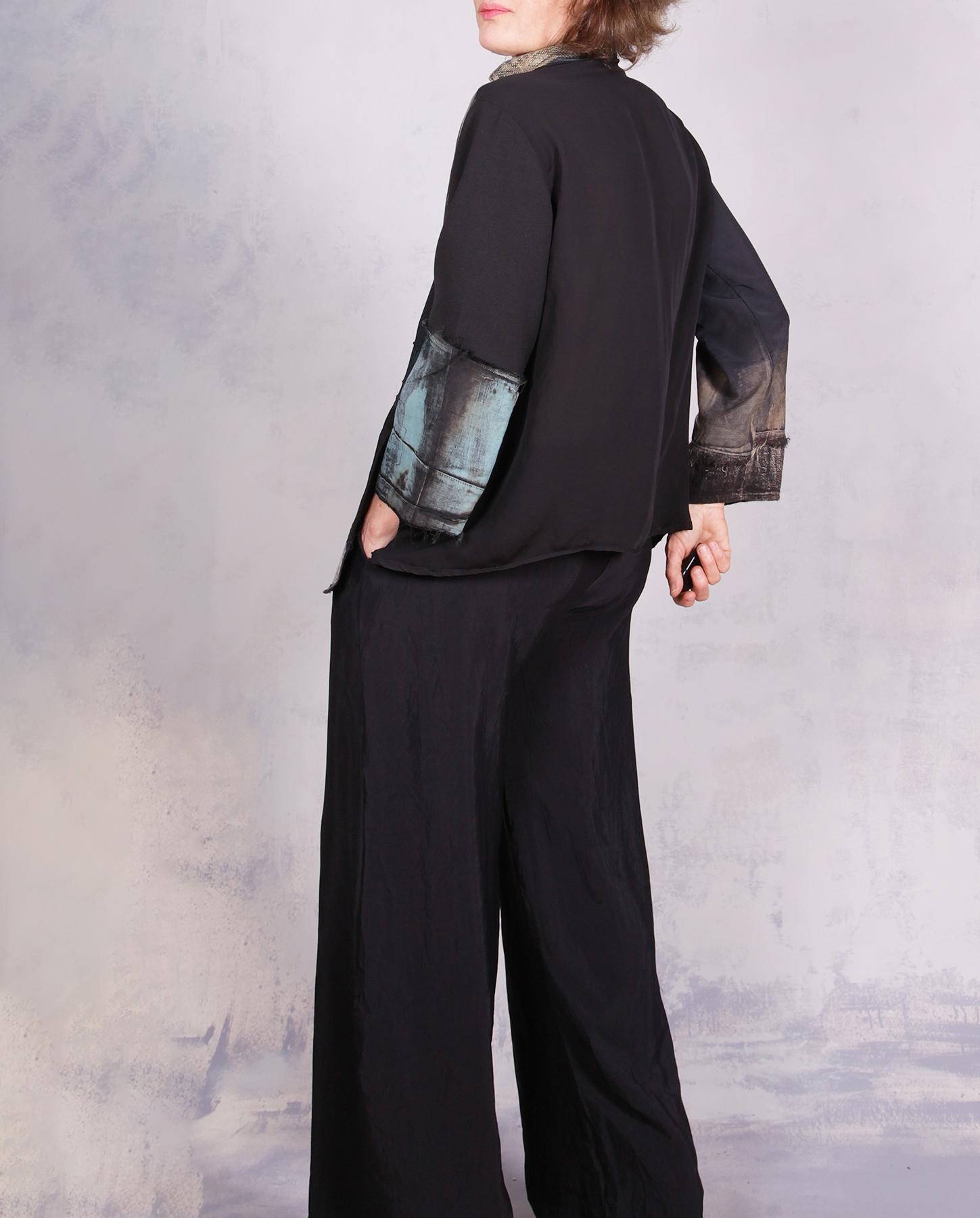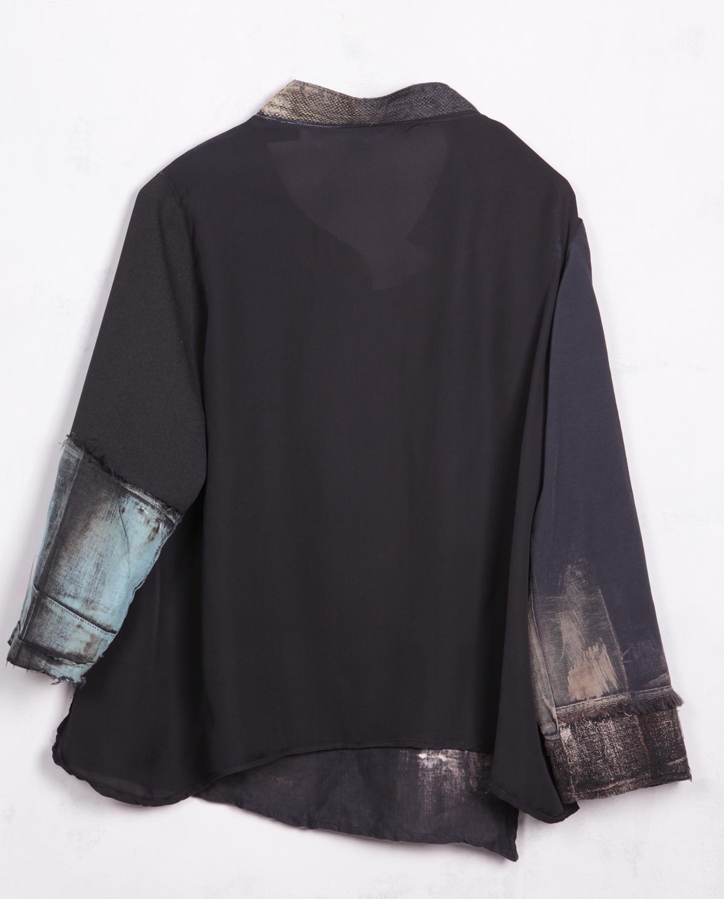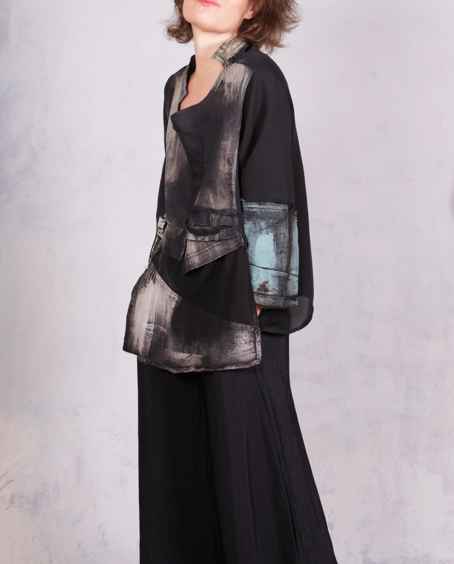 Built-in sleeves, mixed fabrics, asymmetrical collar, applique, vents on bottom, hand distressed, hand-painted.