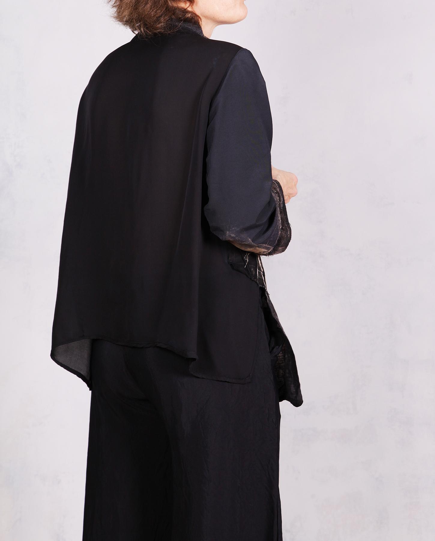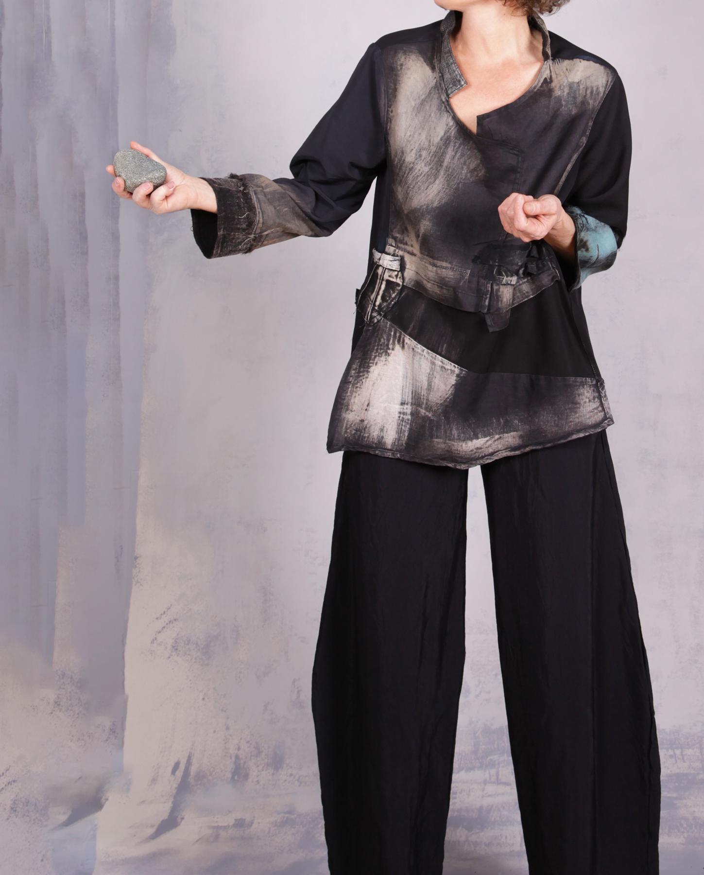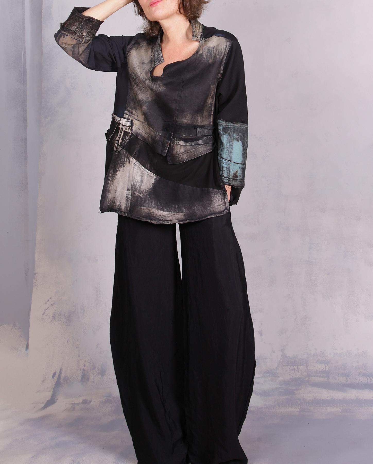 There are so many unusual twists and turns in this creative piece: from the collar line and a fun pocket, to the way the distressed areas are positioned and just a touch of color on one of the sleeves. Comfortable and lightweight, made out of mixed materials with a nice drape, with silk crepe for the back and European linen for most of the other areas, it is a perfect throw-on-and-go kind of top. Washable and breathable, it will take you through the day and evening in a unique way. Product code: N9517