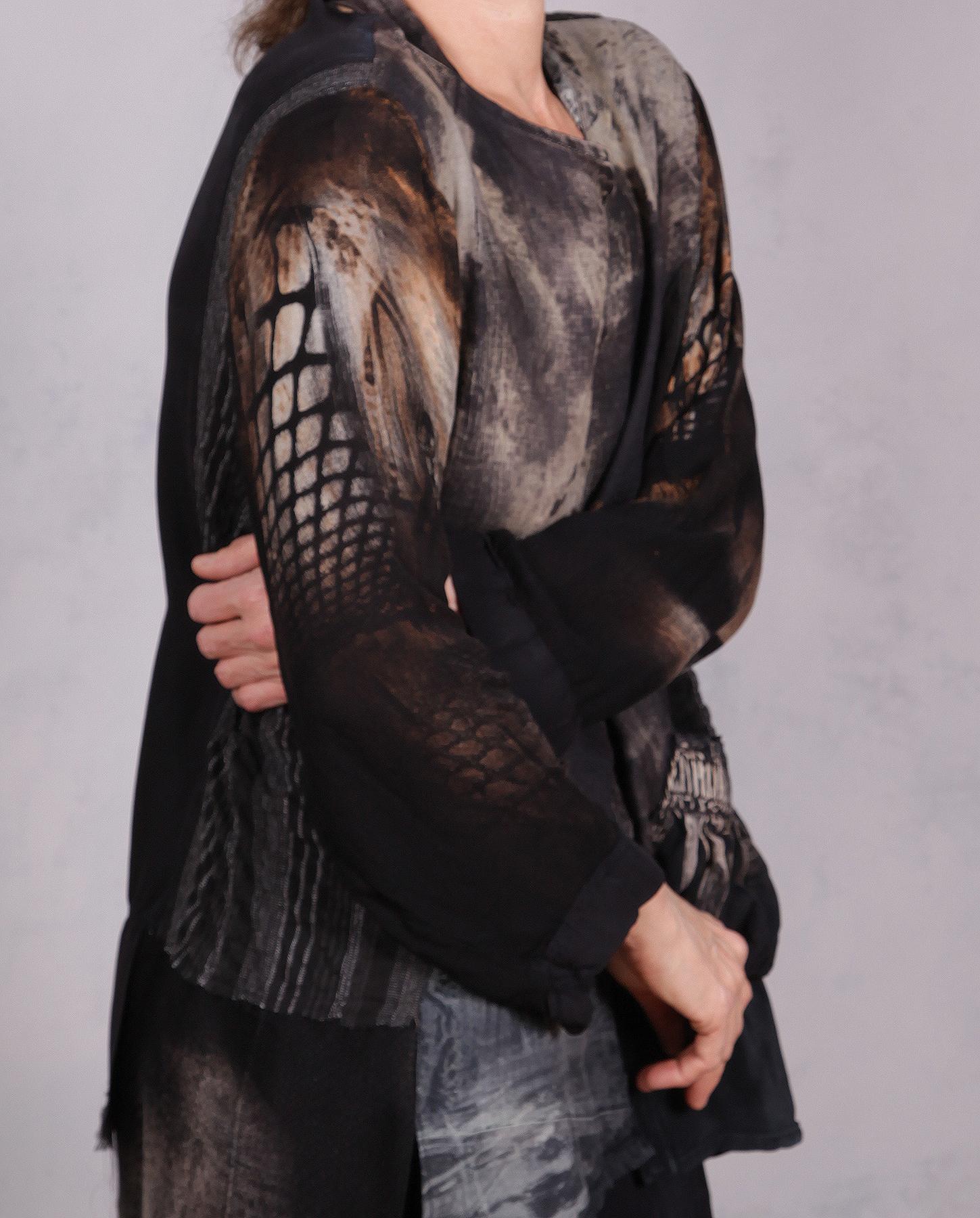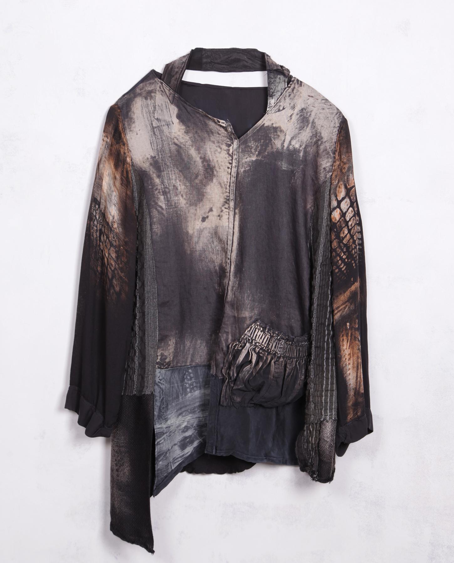 Built-in sleeves, mixed fabrics, vents on bottom, large pocket, hand-distressed, hand-painted, asymmetrical.