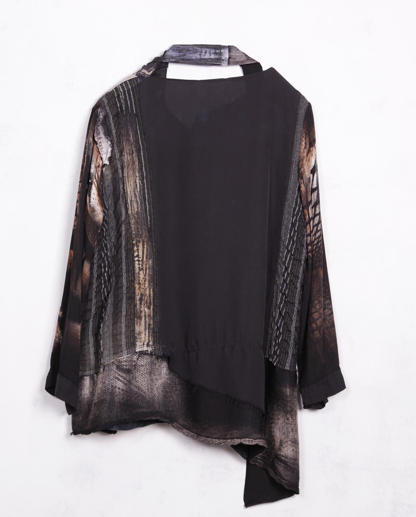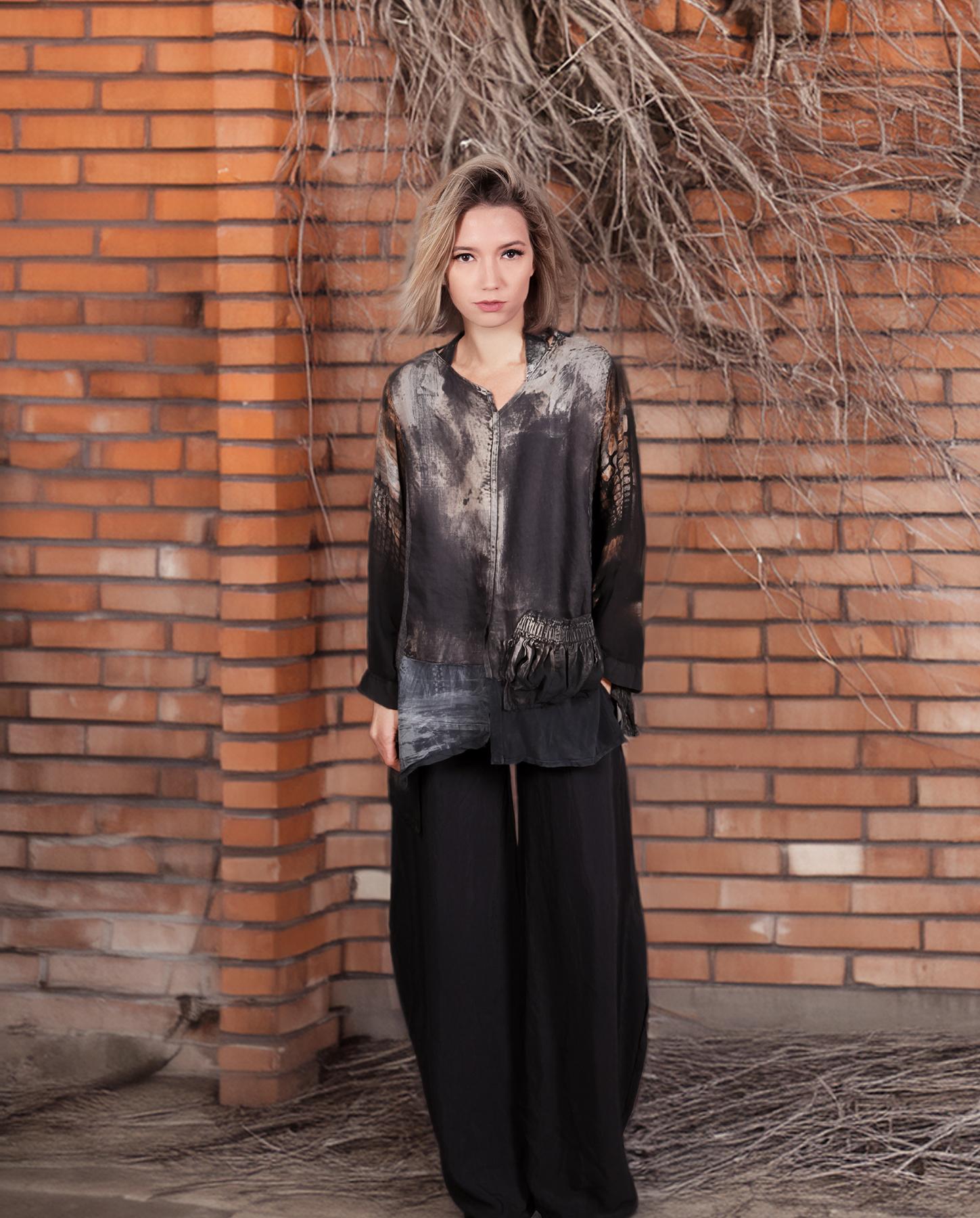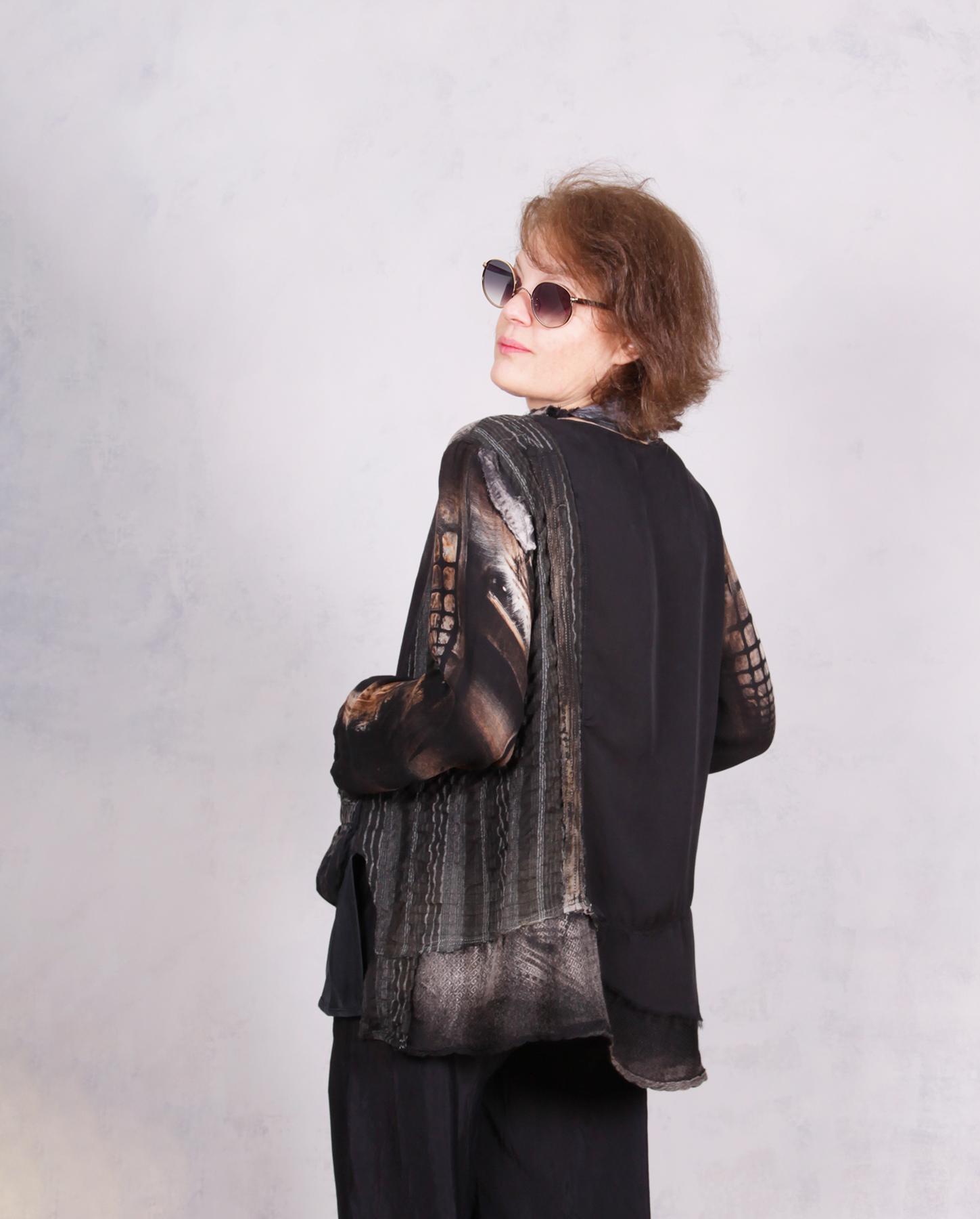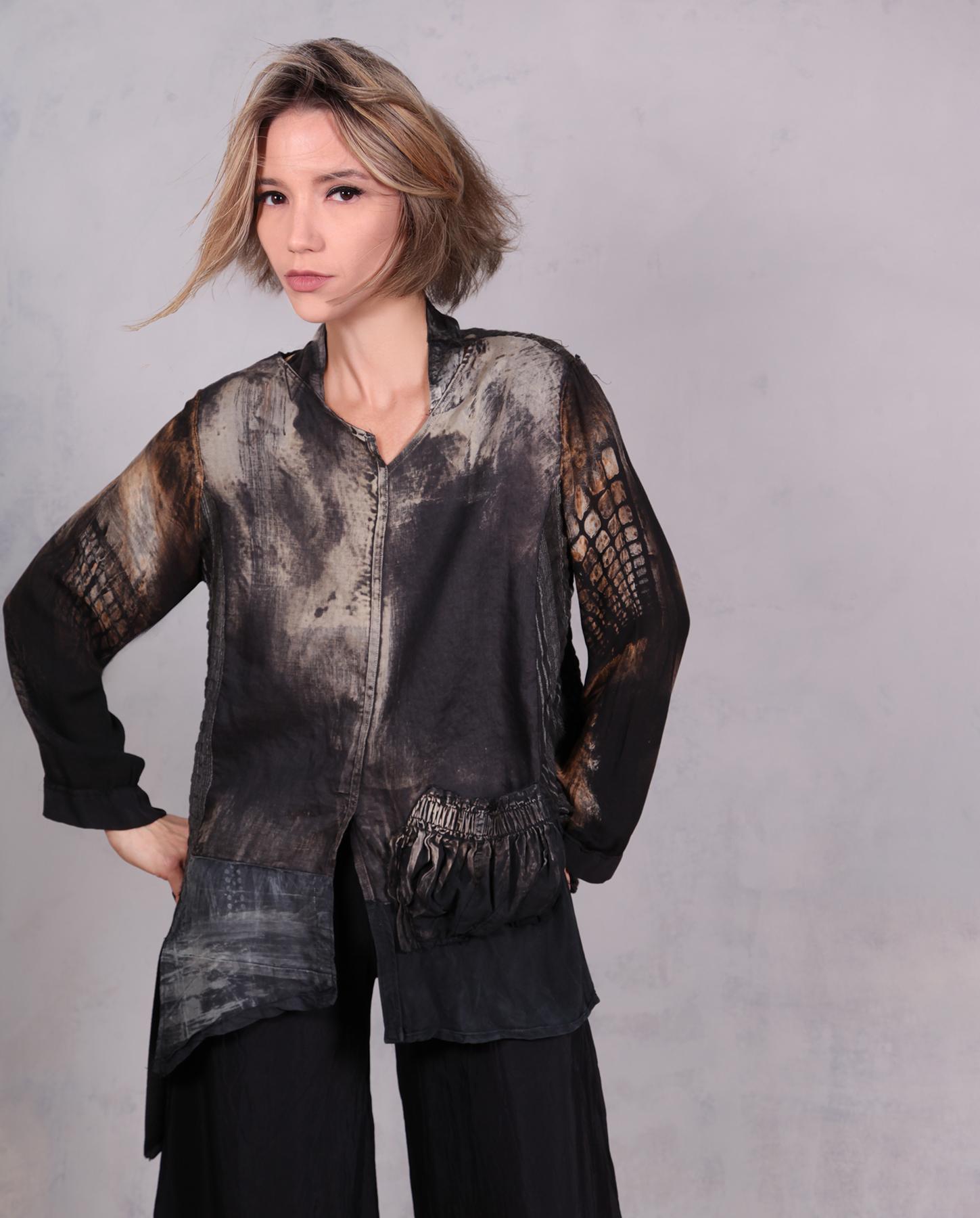 Another piece from the artist that has it all: comfortable, breathable, with a great drape, unusual visuals, detailed pocket, unusual collar, mixed fabrics and an asymmetrical design! You will love having it on. One of the artist's favorite things about this particular piece is the depth of color variations in the hand-painted detailing and print on the super soft lightweight sleeves. From smooth to slightly crinkled, raised texture pieces, it will please you in every way. The blouse will fit a variety of sizes (shown on small) and can be shortened upon request. Product code: E1457